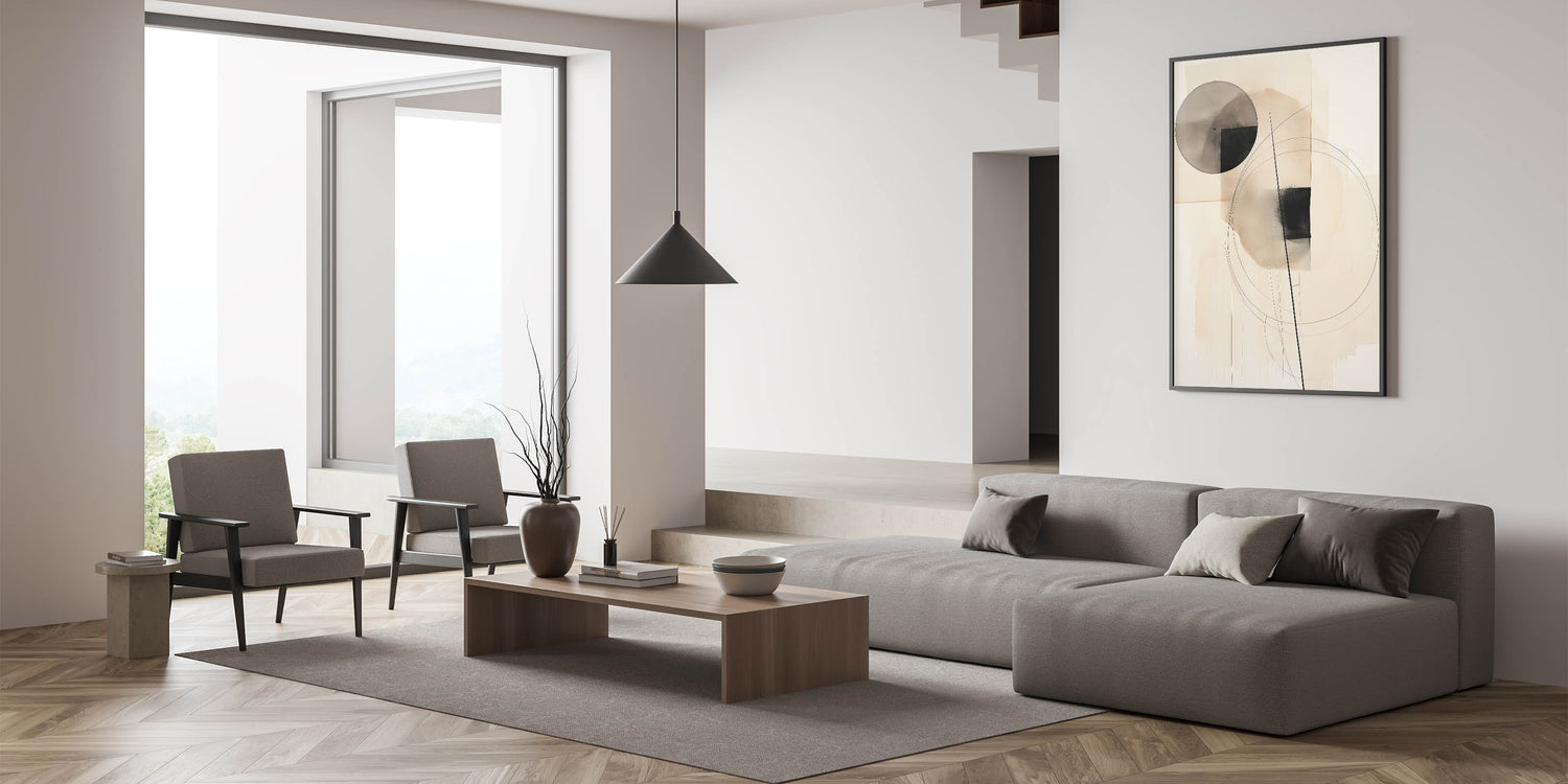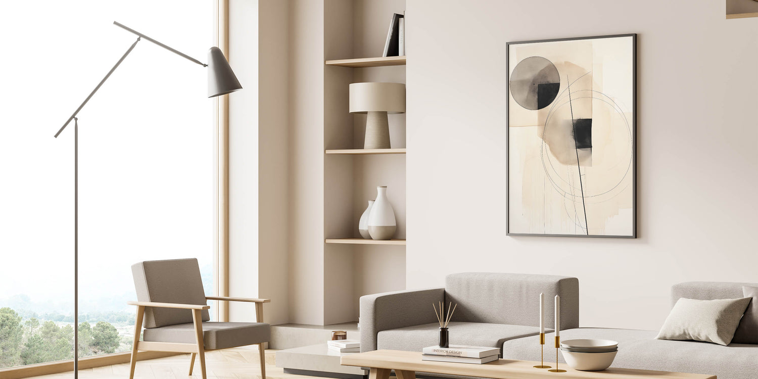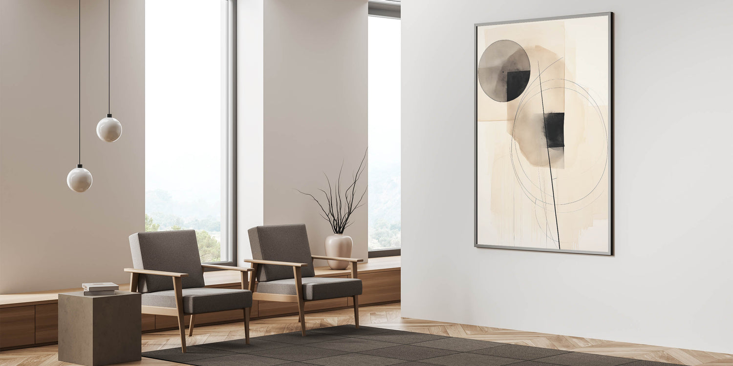 Enhance your space with this minimalist circle and line art, featuring a refined blend of geometric shapes in black and beige tones. This abstract composition balances circles, squares, and fine line accents, creating an elegant and harmonious design that brings a touch of sophistication to any modern decor. Perfect for minimalist and contemporary interiors, this artwork adds a calm and artistic element to your space.