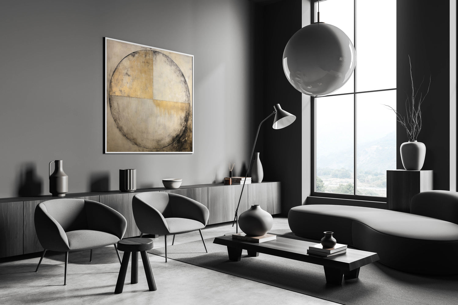 Introduce an elegant touch to your home with our Minimalist Gold and Beige Abstract Line Art, a stunning piece that merges simplicity with sophistication. This artwork features a large, divided circle with dynamic brush strokes and textured gold accents against a beige and gray background. Its minimalist style is perfect for adding a modern and timeless aesthetic to any space.