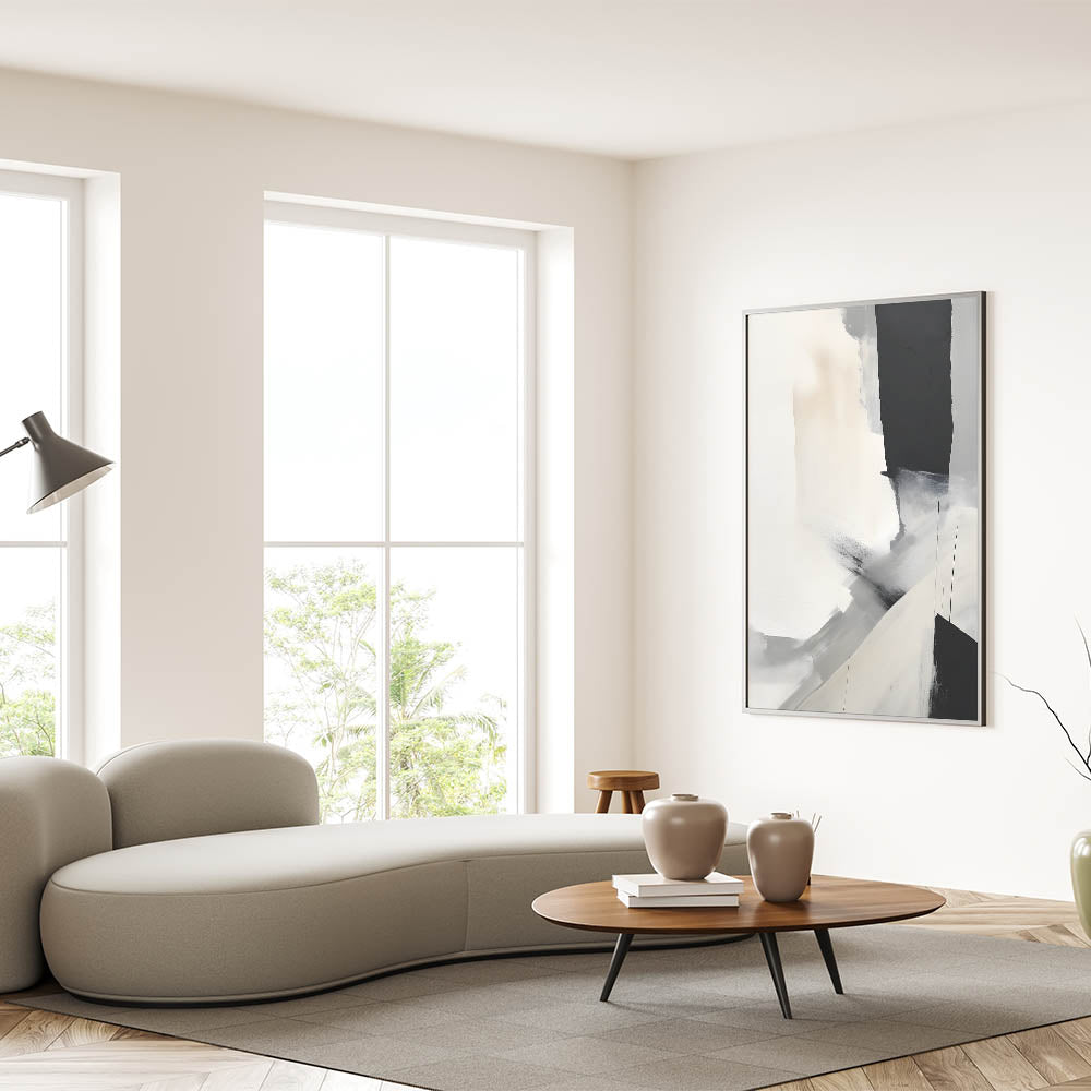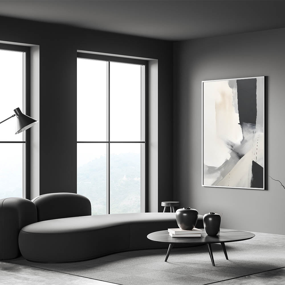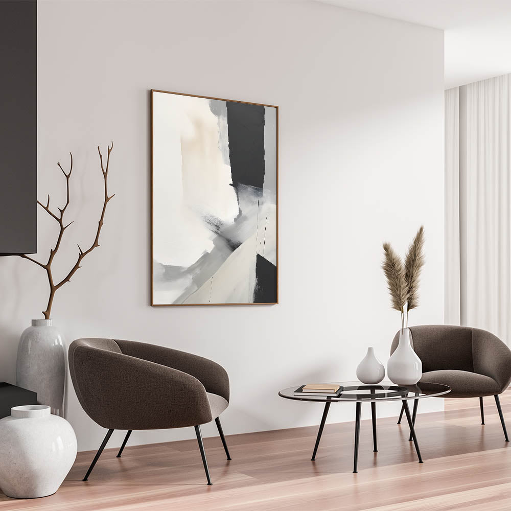Enhance your decor with this minimalist monochrome abstract artwork. Featuring a dynamic flow of black, white, and gray tones, this piece captures a sense of depth and movement with its smooth gradients and striking contrasts. Ideal for contemporary and minimalist interiors, this design offers a sophisticated balance of calmness and boldness. Its monochromatic palette ensures it complements a wide range of decor styles, while the abstract forms create a captivating visual focus for any room.
