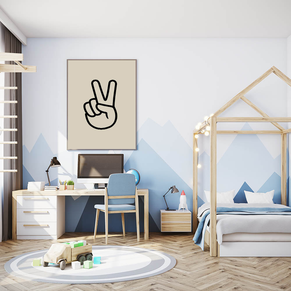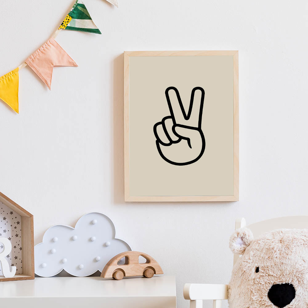 Promote peace and positivity in your child's space with this bold and minimalist "Peace" typography art print. Featuring a stylized peace hand sign against a calming beige background, this design is perfect for adding a soothing and inspirational touch to any room. Ideal for nurseries, playrooms, or study areas, it serves as both decor and a gentle reminder to spread kindness.