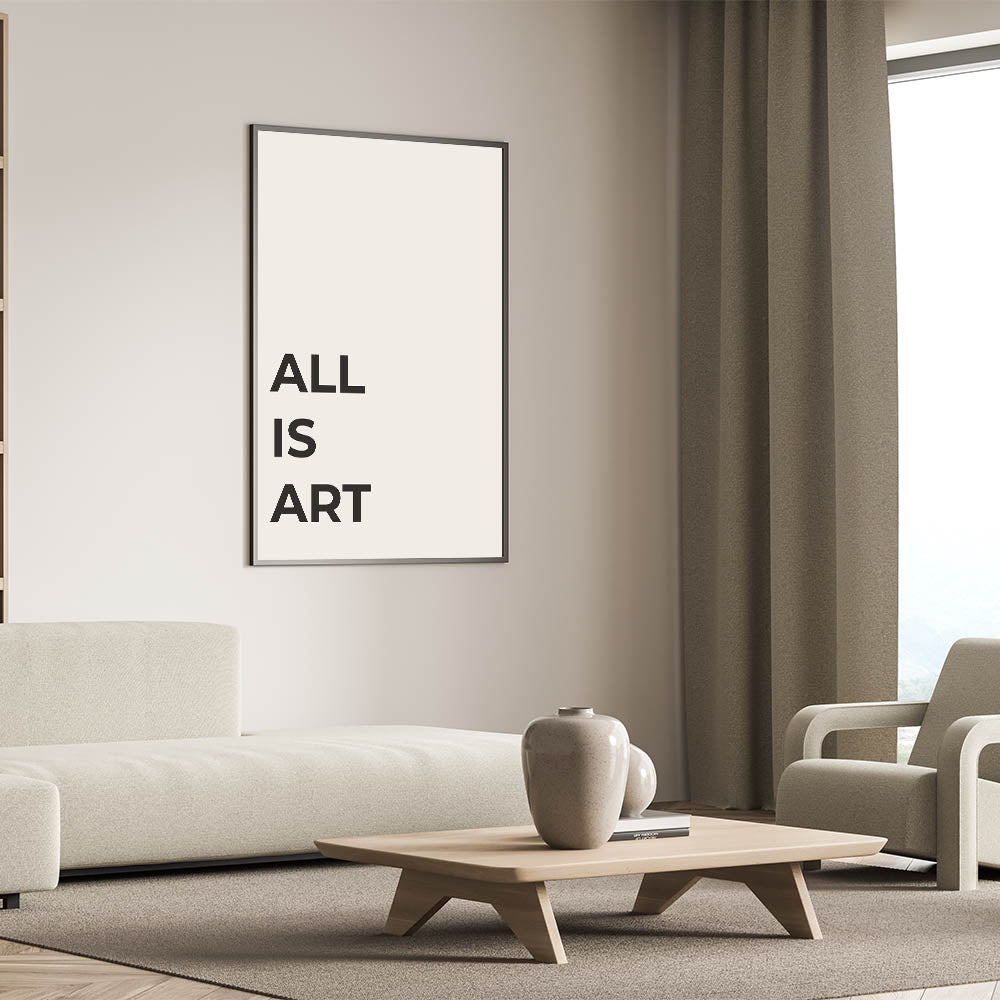 This bold minimalist wall art features a striking typography design with the phrase "ALL IS ART," set against a neutral background. The clean and simple design creates a powerful statement, perfect for modern and minimalist interiors. The bold text and minimalist layout make this piece a versatile addition to your home or office decor, adding both elegance and inspiration.
