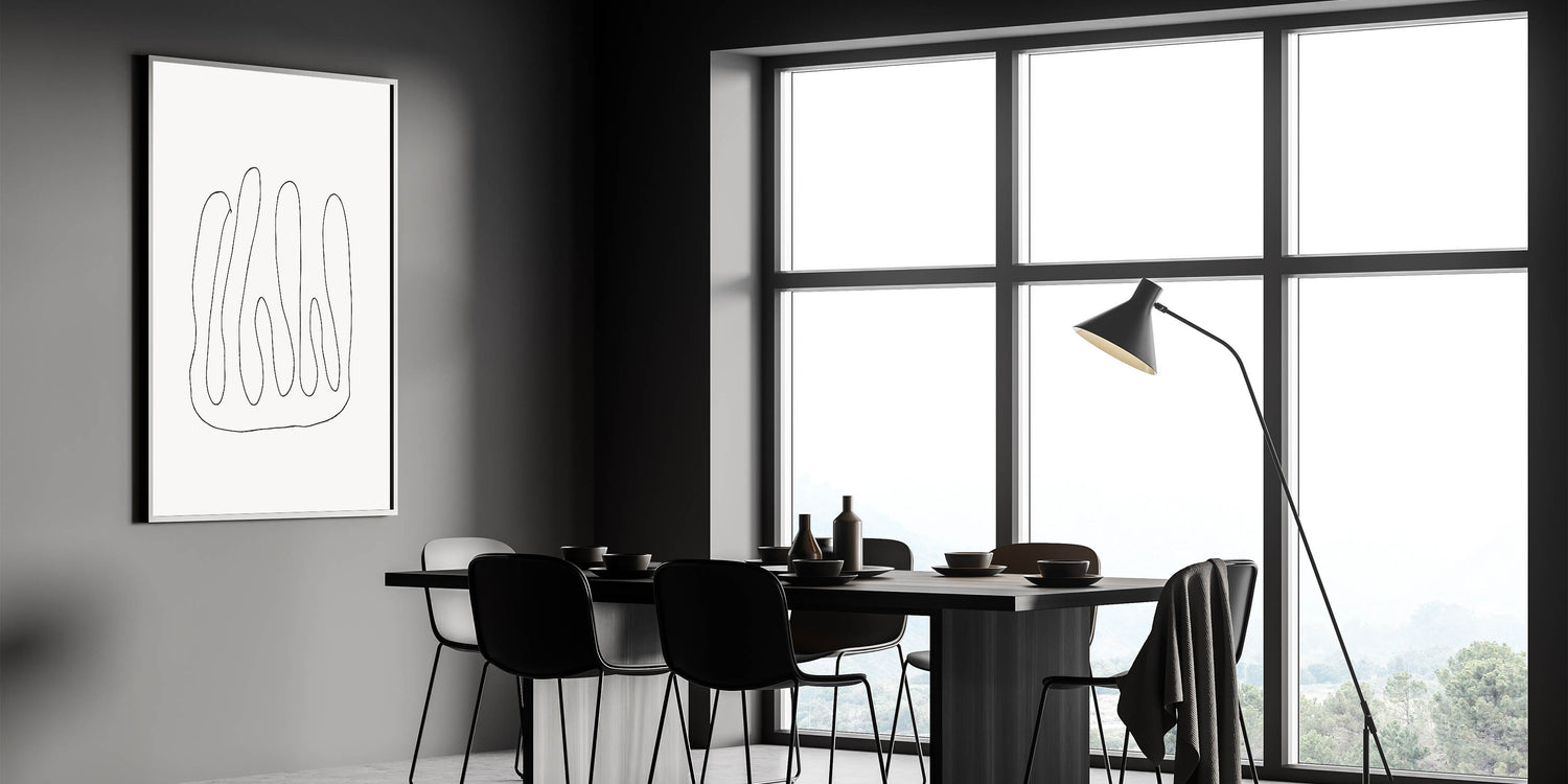 - Minimalist home decor with abstract, organic linework in fine black strokes.