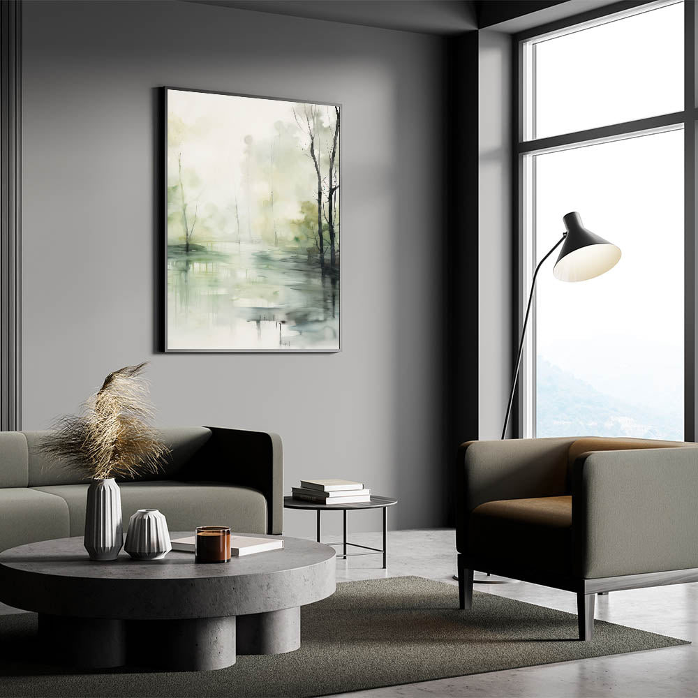 Add a touch of tranquility to your space with this electric wall art featuring a misty forest landscape. This vibrant electric painting uses soft, muted greens and grays to evoke the peacefulness of a quiet morning in the woods. The delicate branches, blurred reflections, and misty atmosphere create a dreamlike quality, perfect for enhancing the calmness of bedrooms, living rooms, or offices. The subtle tones of this artwork make it a versatile piece for minimalist and contemporary decor.