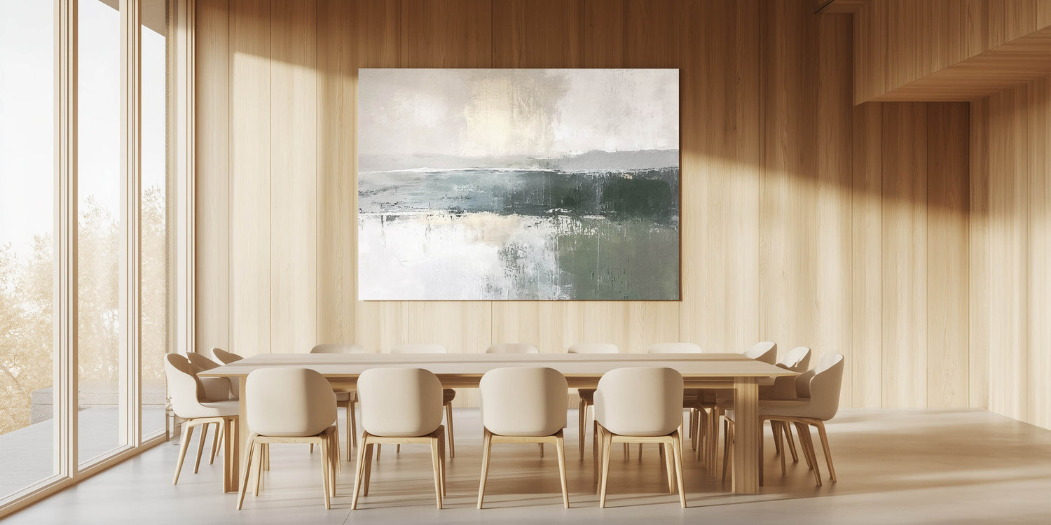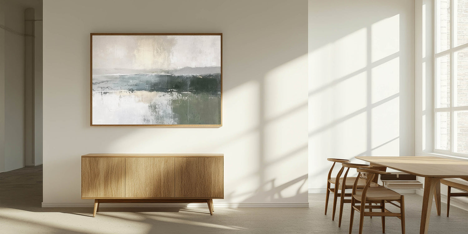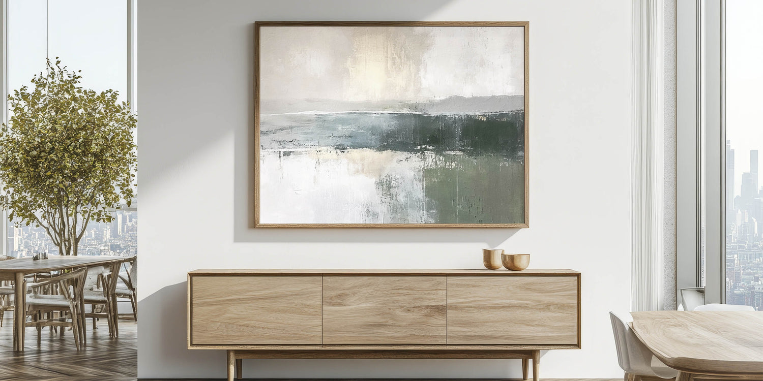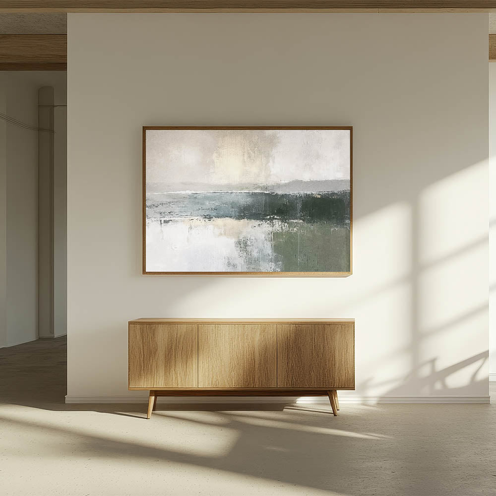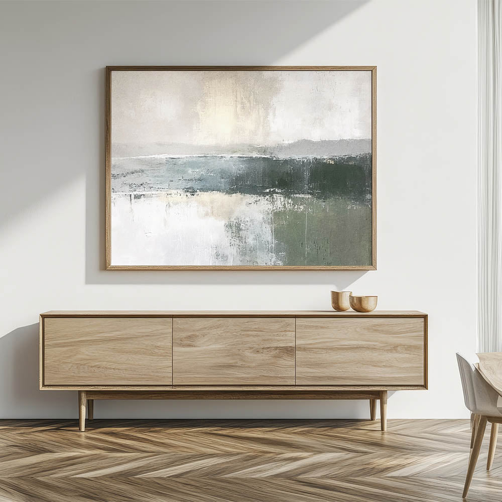 Enhance your space with the soothing beauty of this misty green landscape abstract canvas. This piece captures the serene essence of nature with gentle greens, soft grays, and creamy whites, reminiscent of a calm, foggy morning over a tranquil landscape. Ideal for those who seek a minimalist aesthetic, this artwork seamlessly complements modern, rustic, and contemporary decor styles.