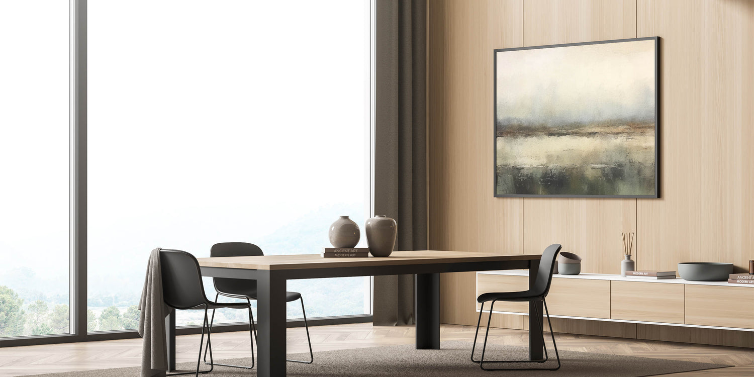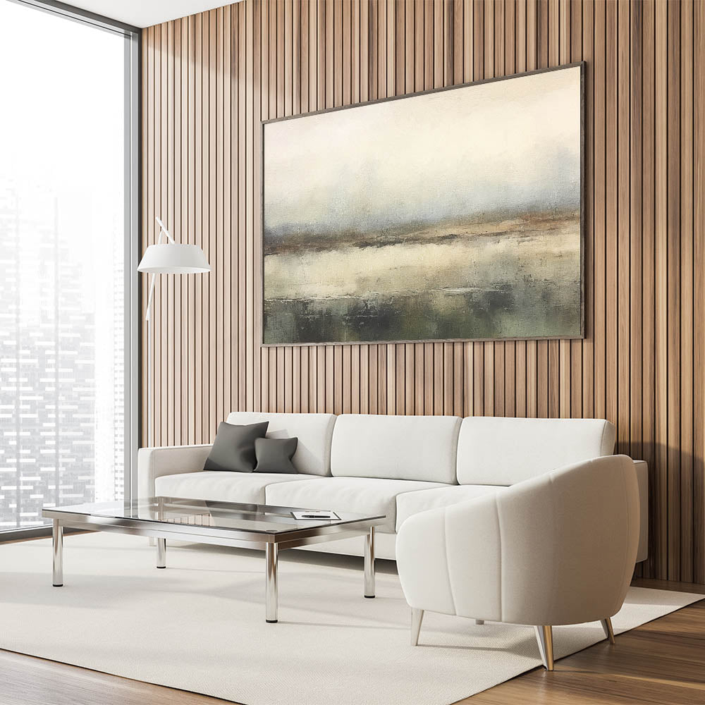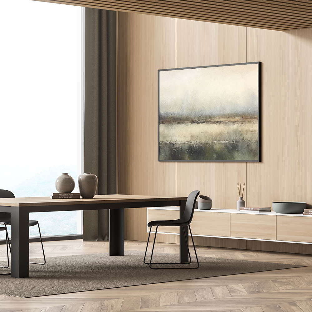 Bring a peaceful vibe into your home with this abstract misty horizon landscape. Its neutral palette and minimalist design make it a versatile addition, ideal for creating a relaxing ambiance in living rooms, bedrooms, or offices.