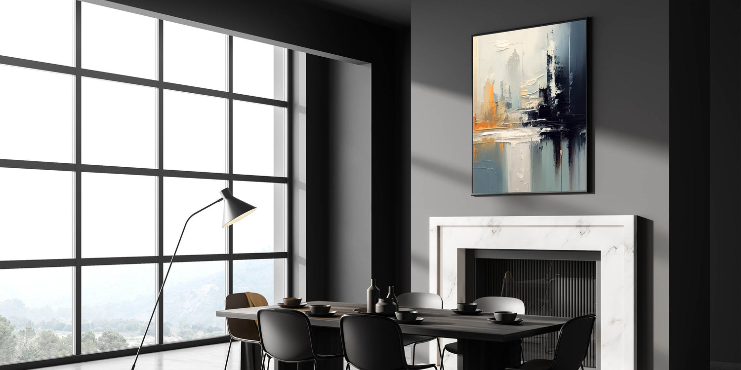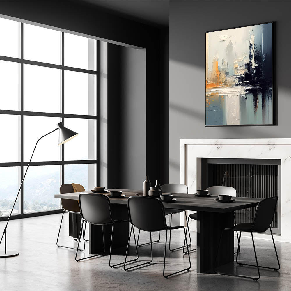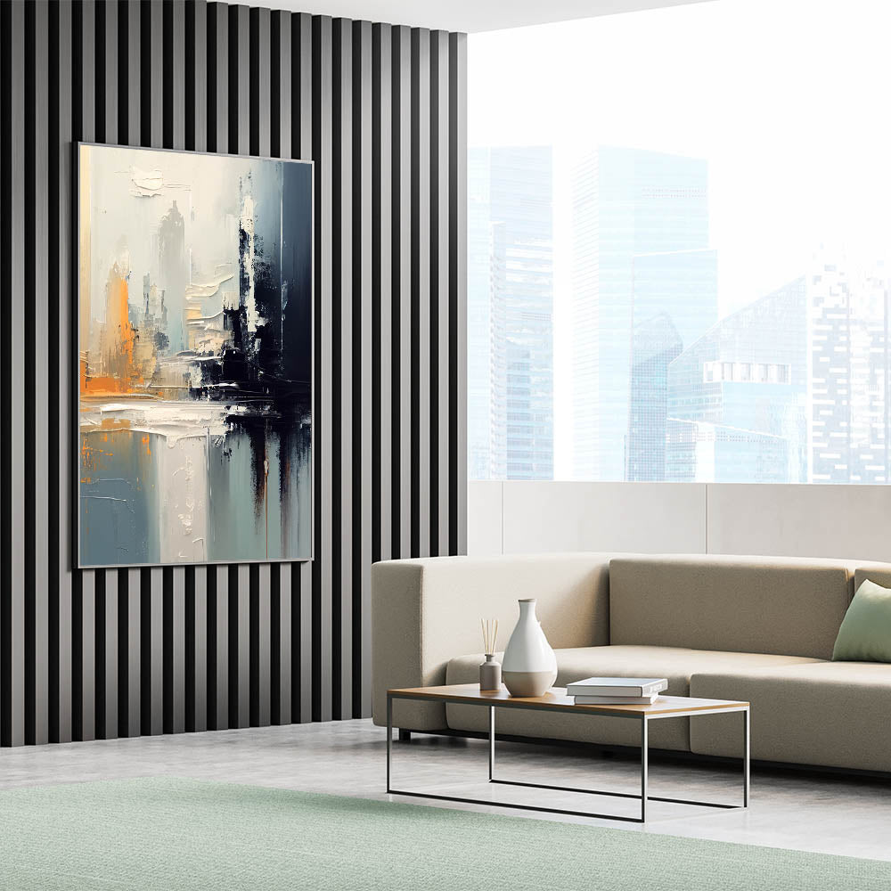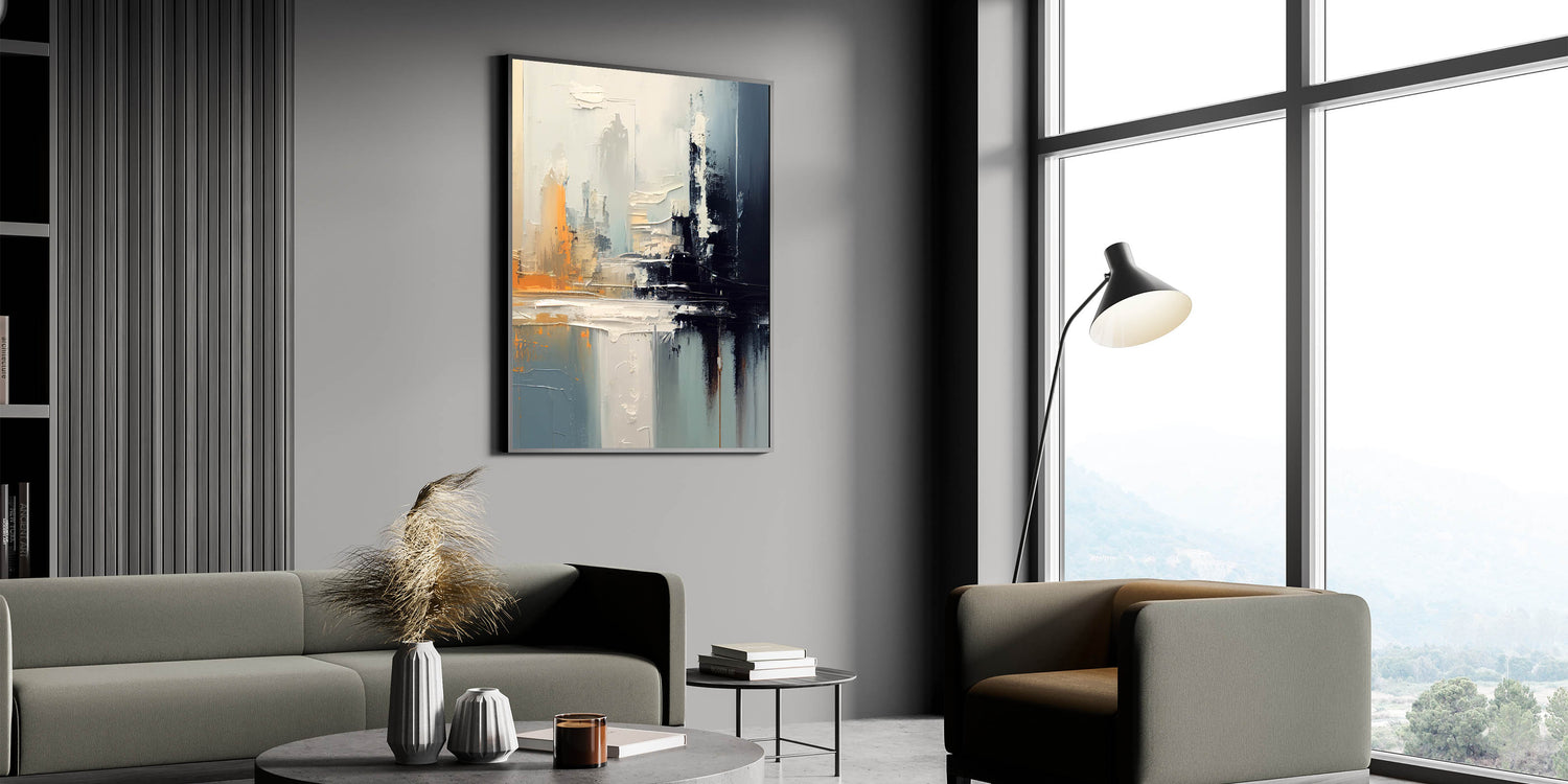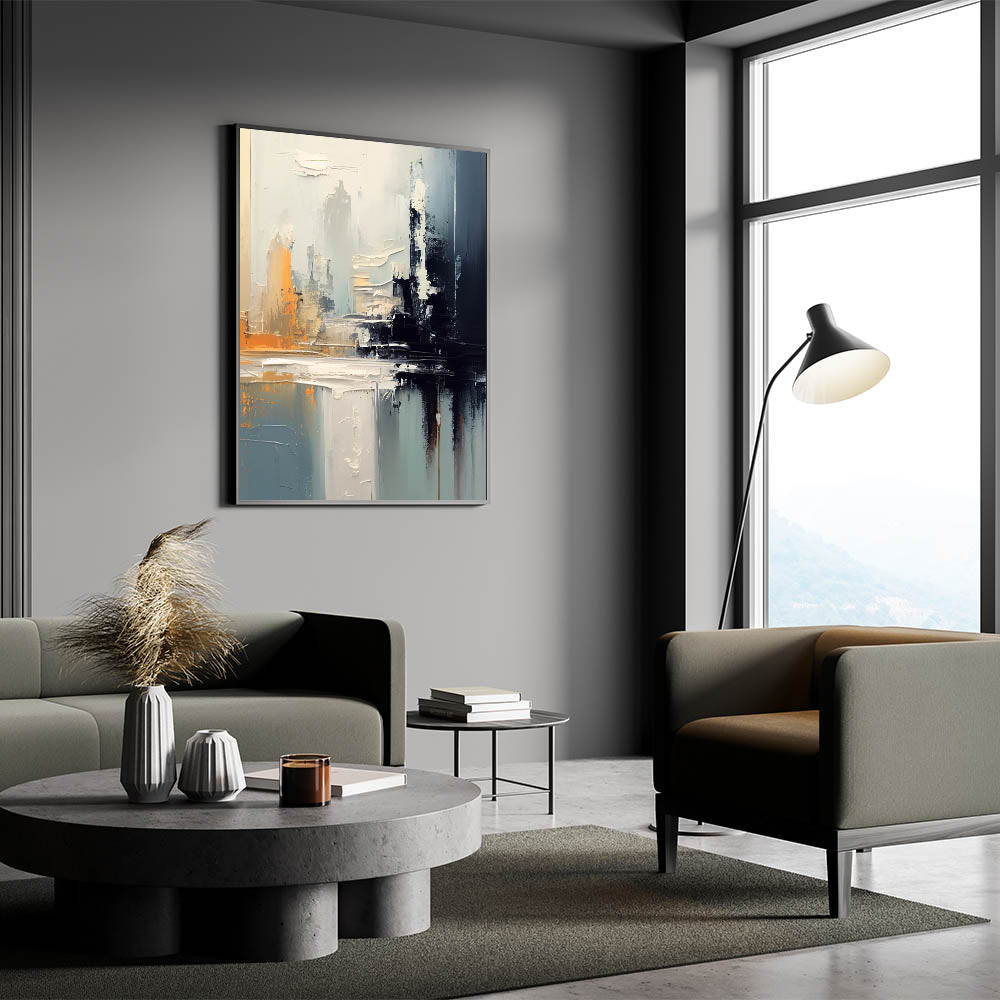 Enhance your home with this stunning modern abstract glam wall art, featuring bold strokes of gray, black, and vibrant orange. This artwork captures a sense of depth and movement, making it the perfect choice for contemporary and glam-inspired interiors. The muted tones combined with dynamic brushwork add a chic and modern touch to any space, creating a sophisticated yet eye-catching focal point.