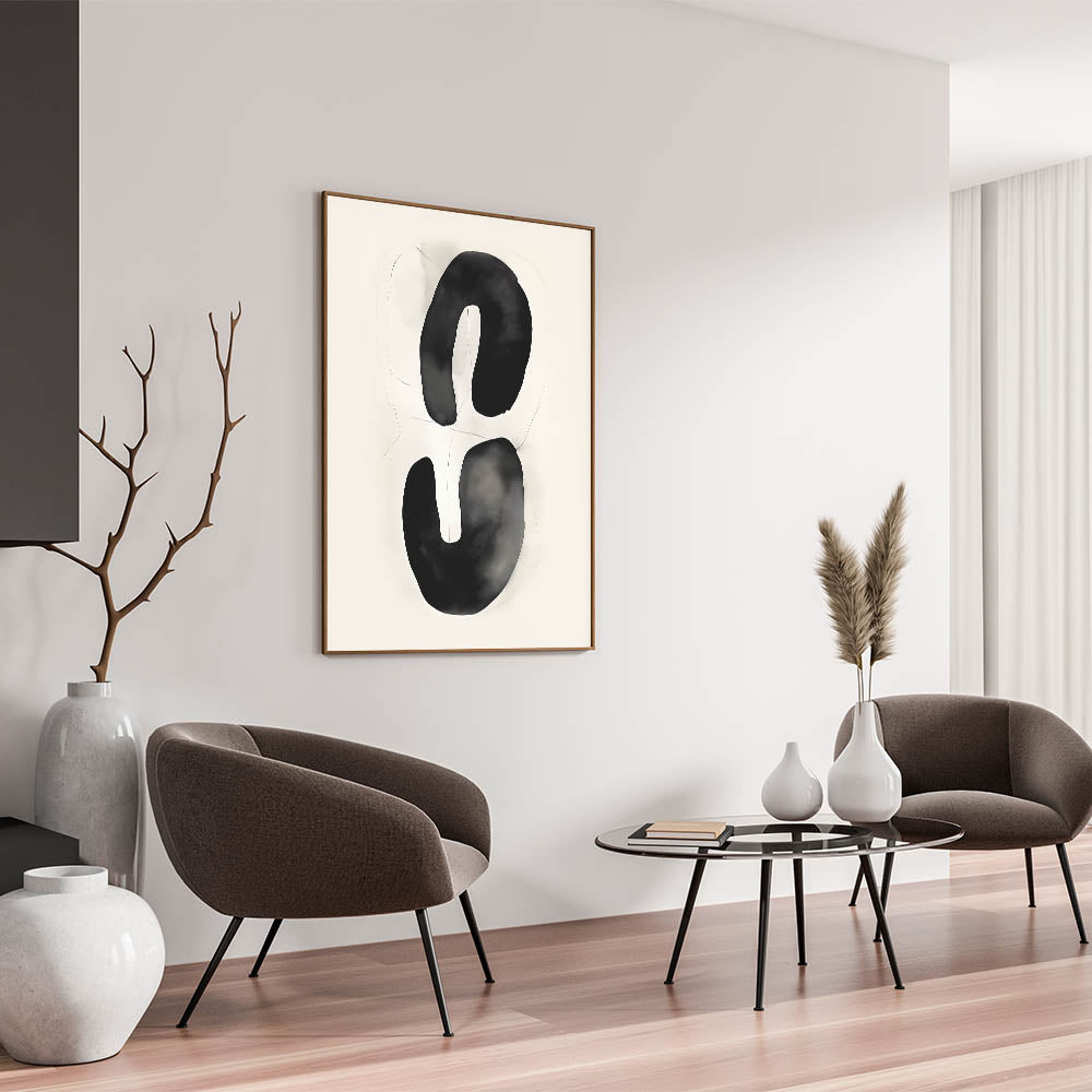Bring a touch of minimalism to your decor with this black ink form artwork, featuring organic, flowing shapes on a neutral background. The simplicity and elegance of the design create a bold yet calming visual, perfect for minimalist and modern interiors. Available in various formats, including stretched canvas, acrylic glass, and framed prints, this piece adds an artistic flair to any space.