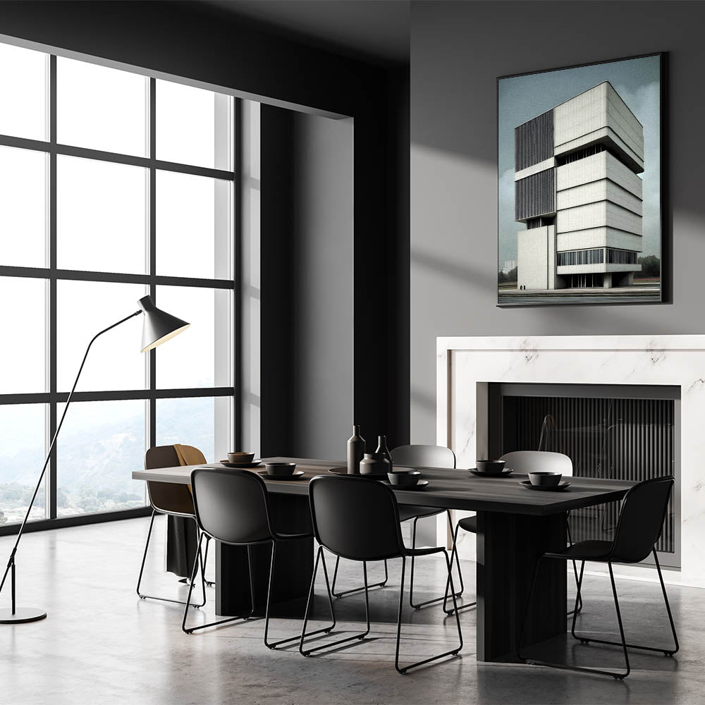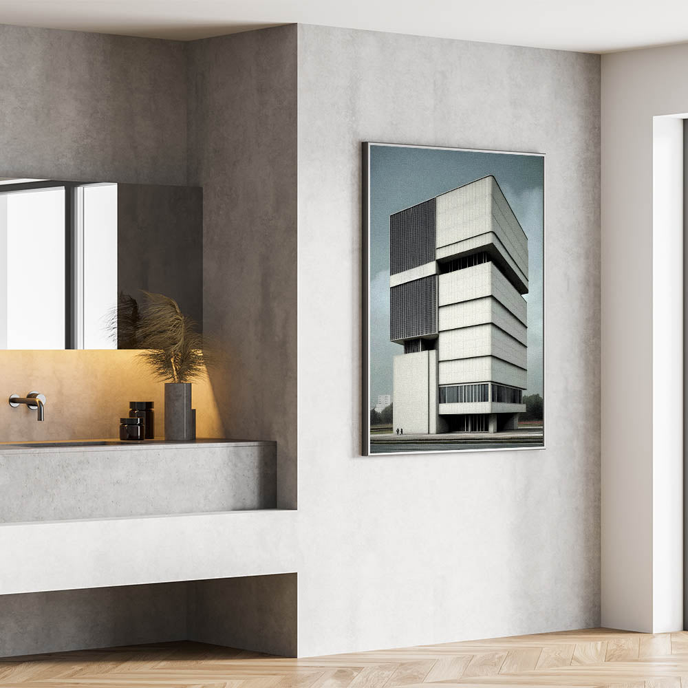 Add a bold statement to your space with this striking Brutalist Wall Art. This artwork showcases a towering minimalist concrete structure with clean, geometric lines that perfectly encapsulate the Brutalist aesthetic. The building’s layered design and stark simplicity make it a powerful example of industrial design, exuding strength and permanence through its form and texture.