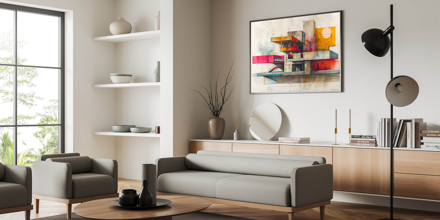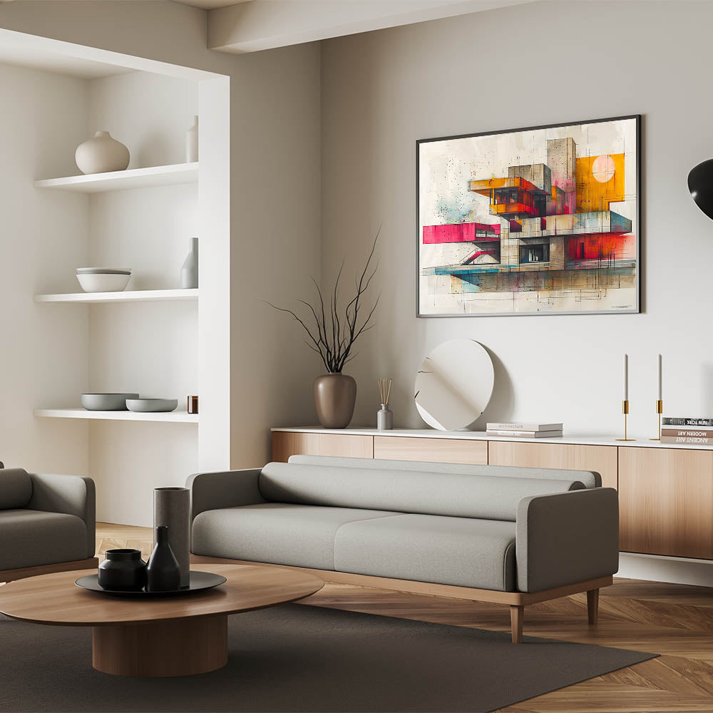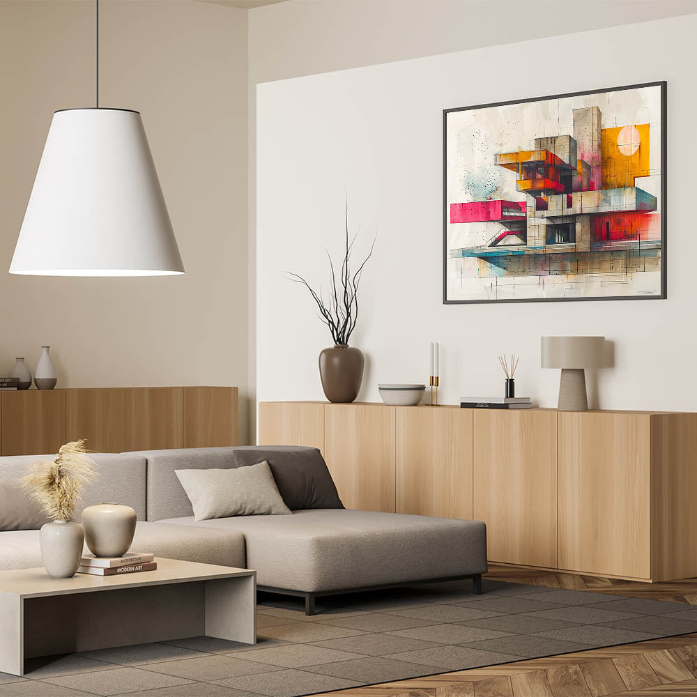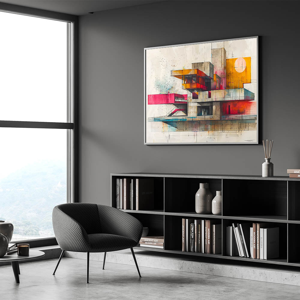 With hints of mid-century modern influence, this wall art beautifully incorporates both abstract geometry and urban design, creating a unique visual appeal. The color palette balances bold hues of red, orange, and pink with muted tones of concrete gray, adding a captivating contrast.