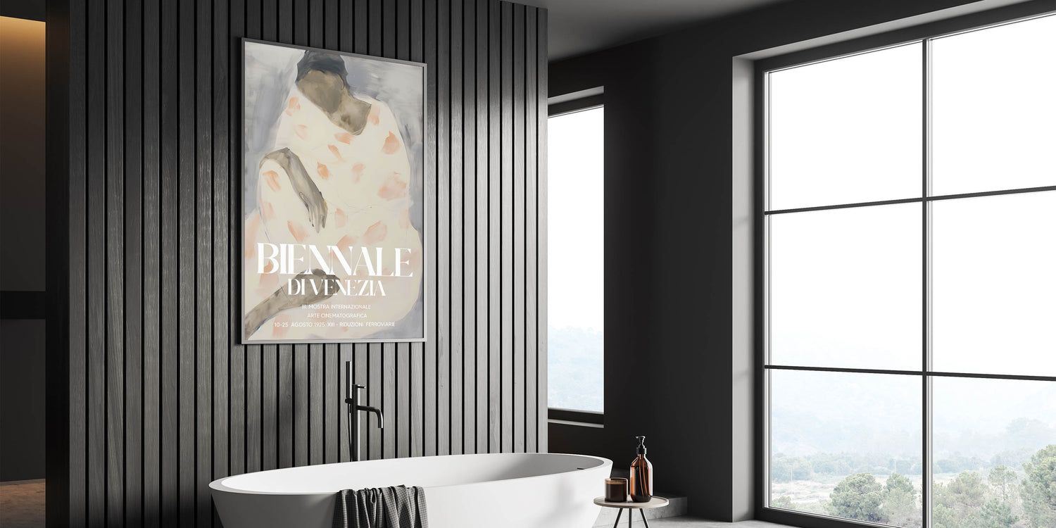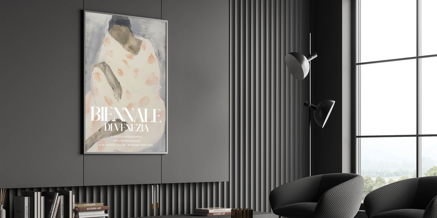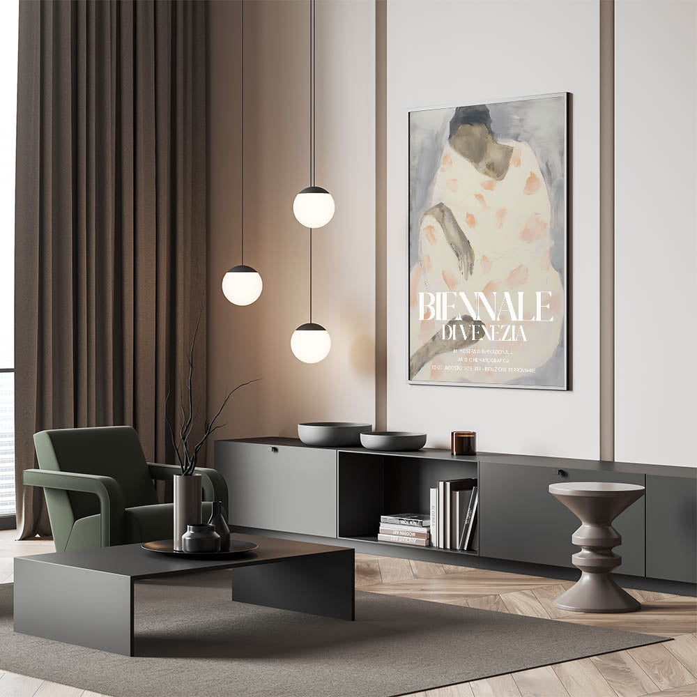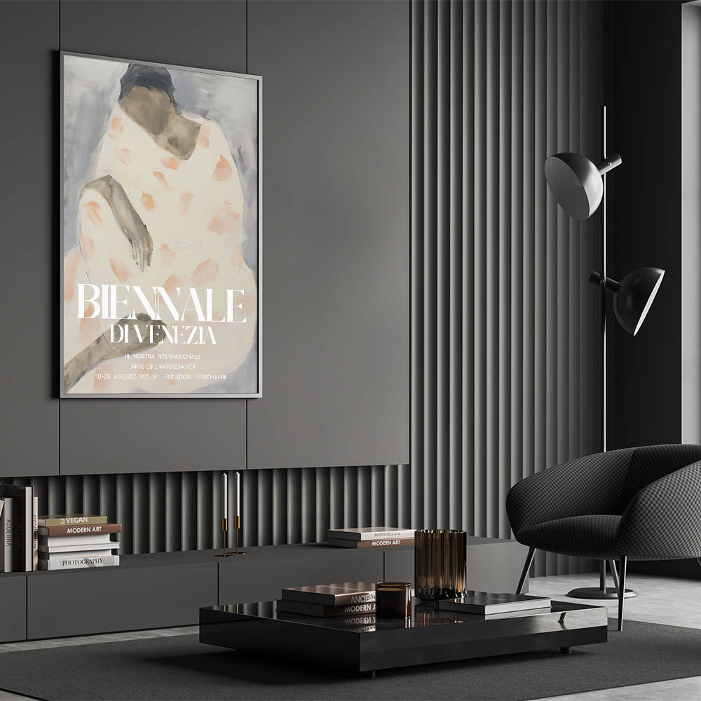 Bring a touch of cultural sophistication to your decor with this modern figurative abstract art, inspired by the timeless elegance of the Biennale di Venezia. The design blends muted gray tones with soft peach accents, depicting a graceful human figure in an abstract style. This artwork embodies contemporary creativity, making it an ideal statement piece for modern interiors.