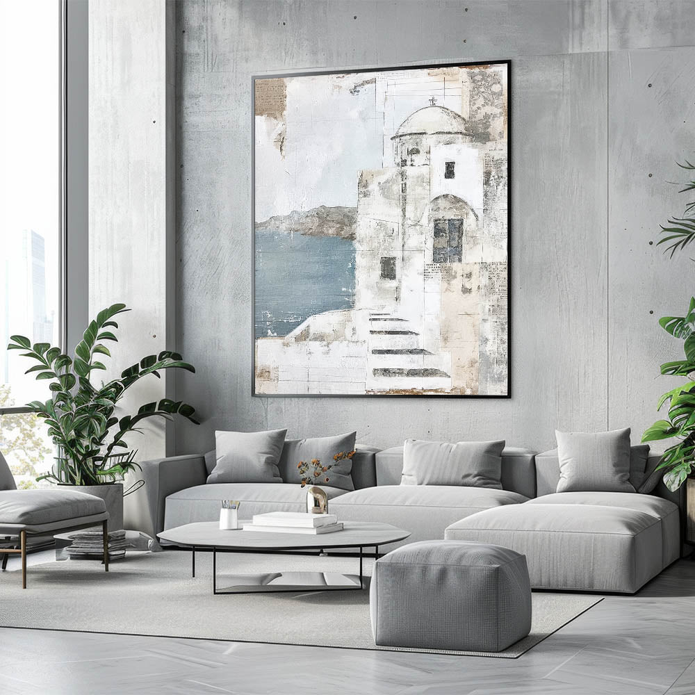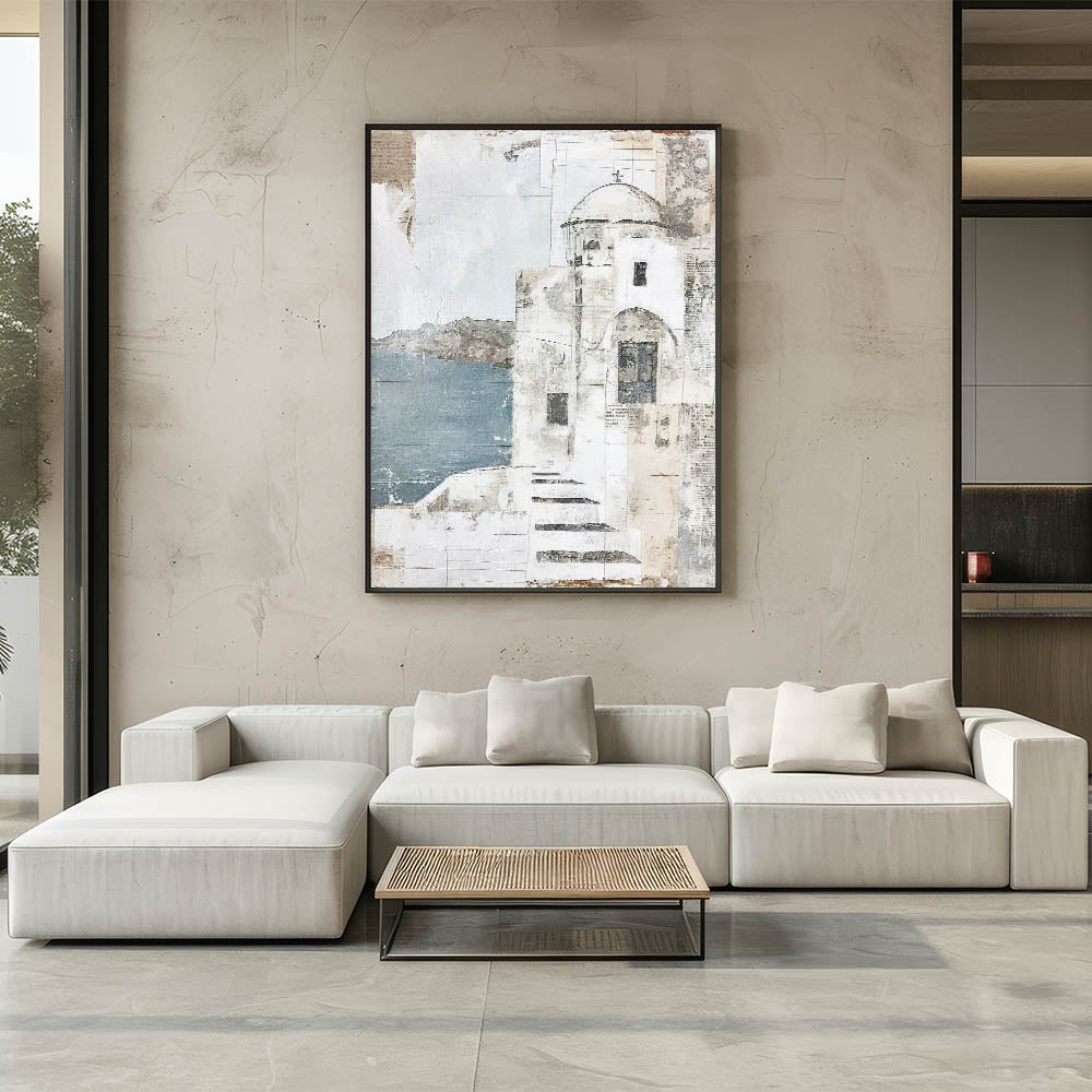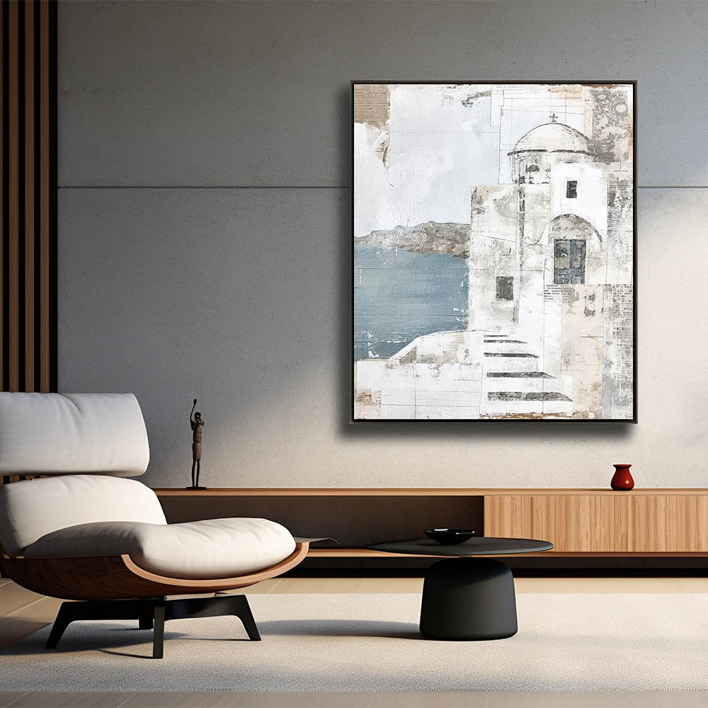 Embrace the serene charm of coastal architecture with this Modern Geometric Abstract Architecture Wall Art. This unique artwork captures the essence of minimalism and geometric elegance, featuring architectural elements that evoke a tranquil seaside landscape. The subtle blend of light gray, beige, and soft blue creates a calming visual appeal, making this piece ideal for both modern and traditional interiors.