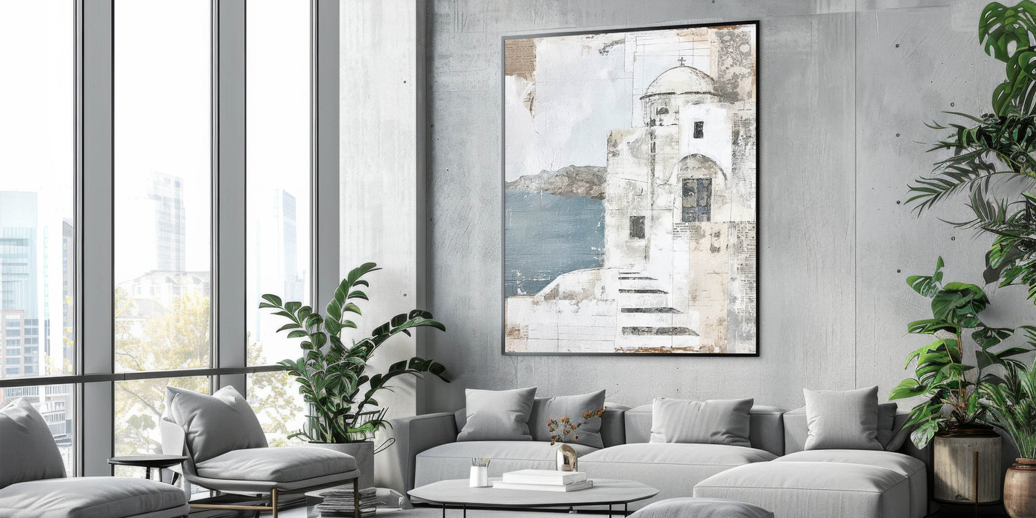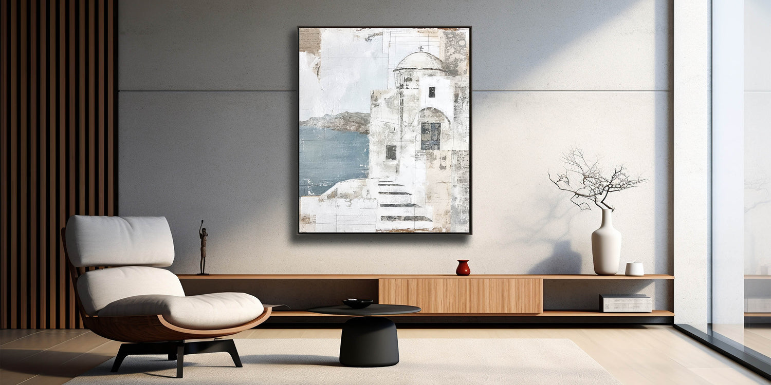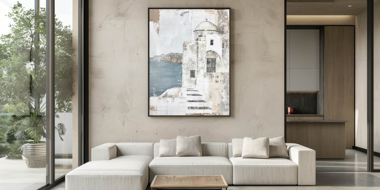 Embrace the serene charm of coastal architecture with this Modern Geometric Abstract Architecture Wall Art. This unique artwork captures the essence of minimalism and geometric elegance, featuring architectural elements that evoke a tranquil seaside landscape. The subtle blend of light gray, beige, and soft blue creates a calming visual appeal, making this piece ideal for both modern and traditional interiors.