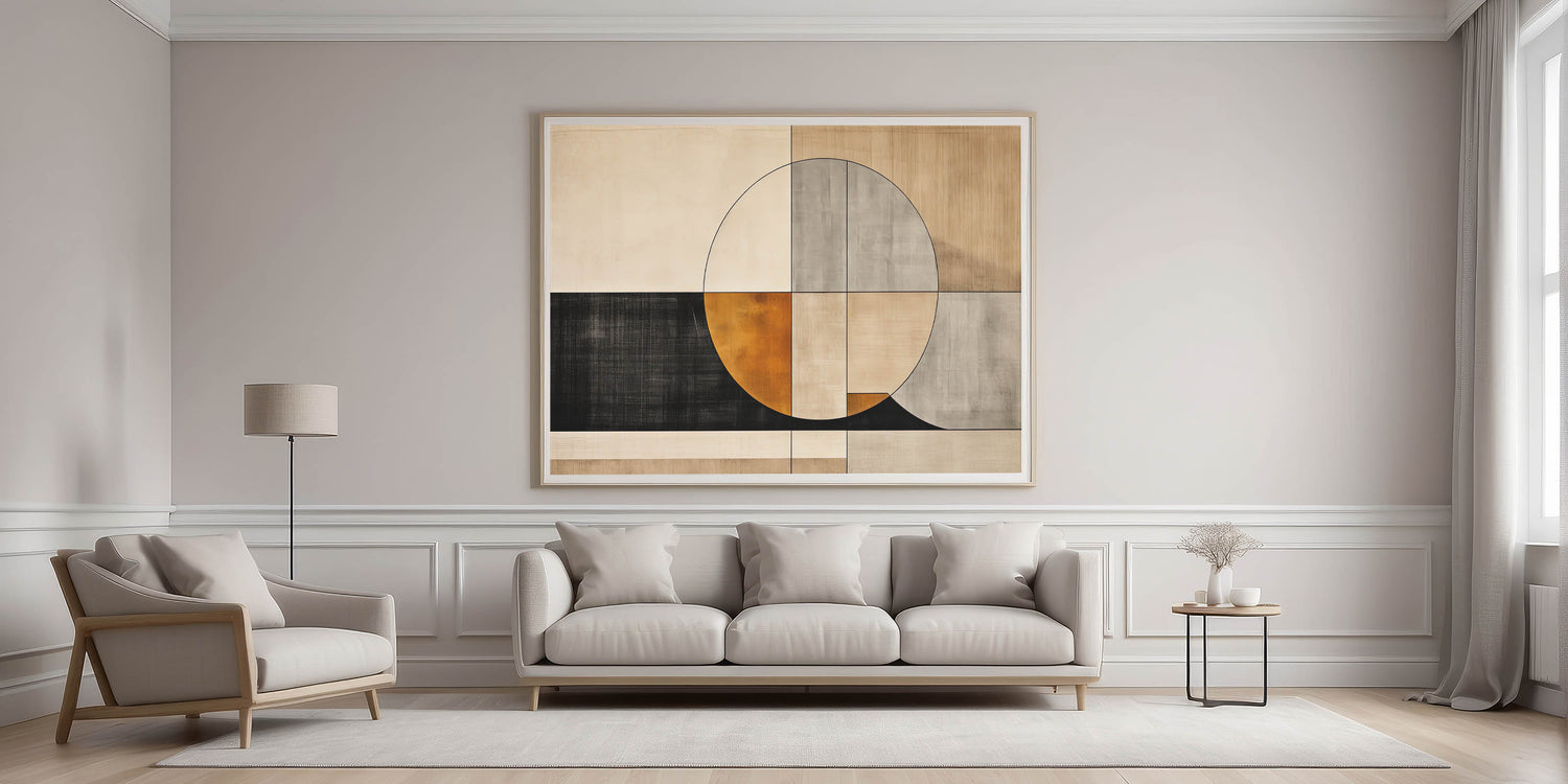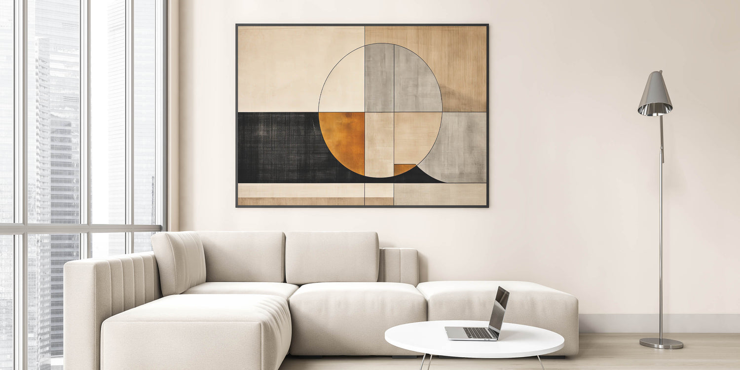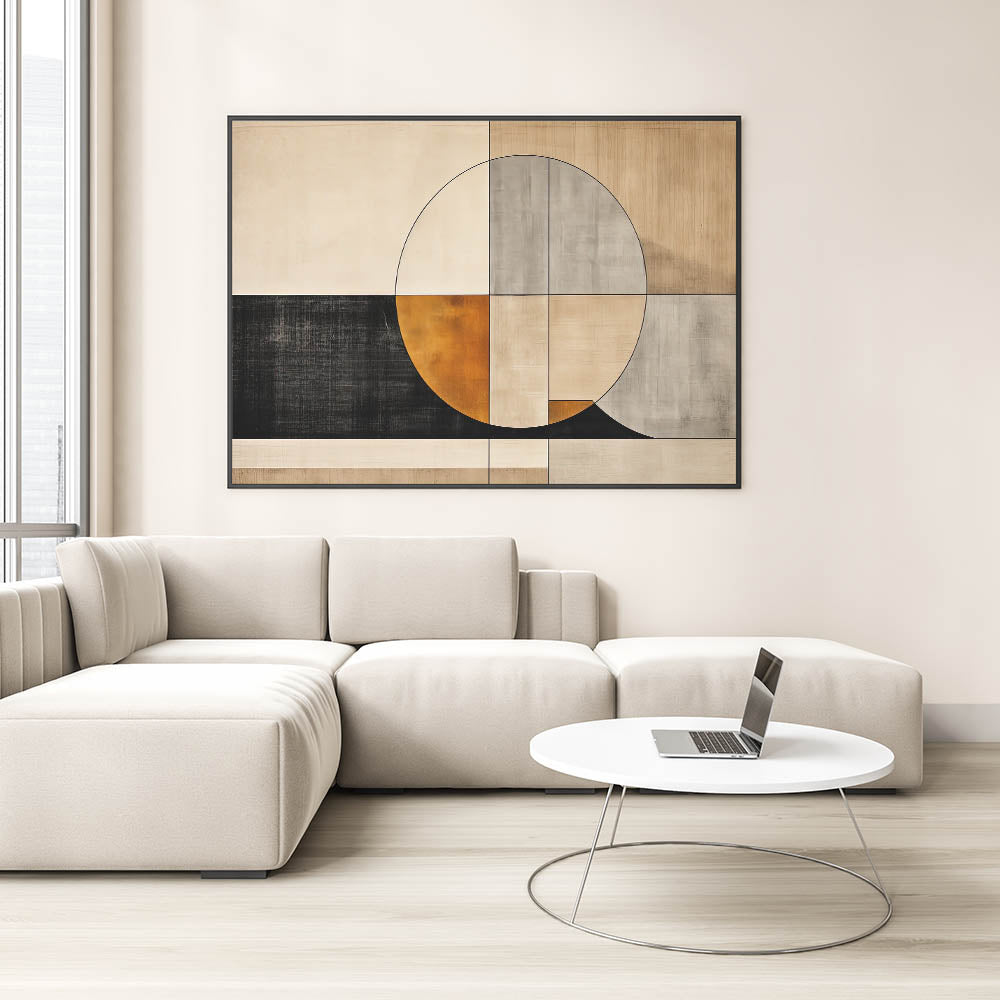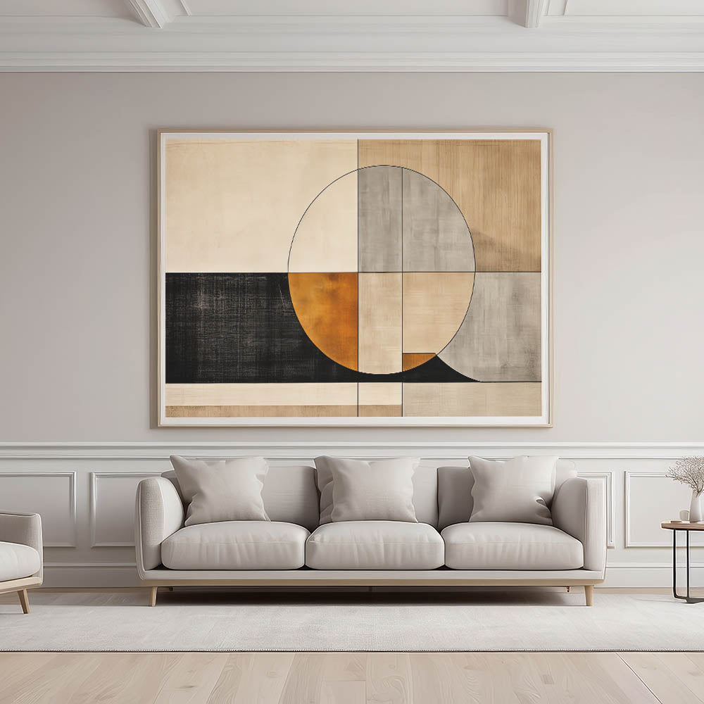 Enhance your space with this Modern Geometric Abstract Art piece, featuring a clean, minimalist design with a striking circular focal point. The artwork combines sections of beige, gray, black, and a warm ochre tone, creating a harmonious and balanced composition. The precise lines and neutral color palette evoke a sense of modern sophistication, making it a versatile choice for contemporary and minimalist interiors.