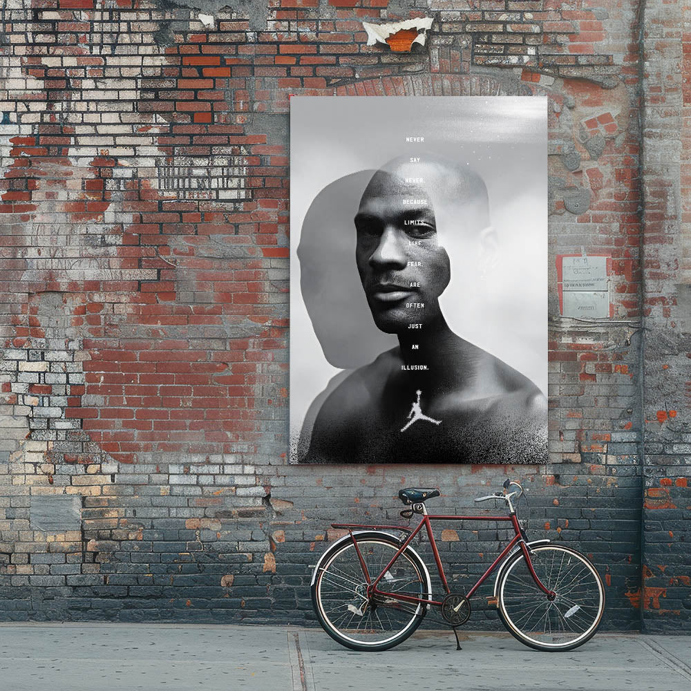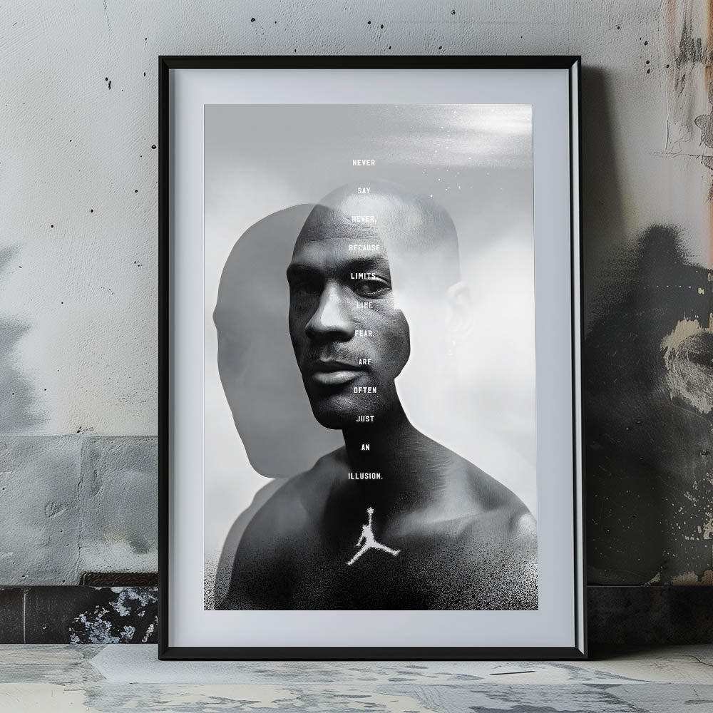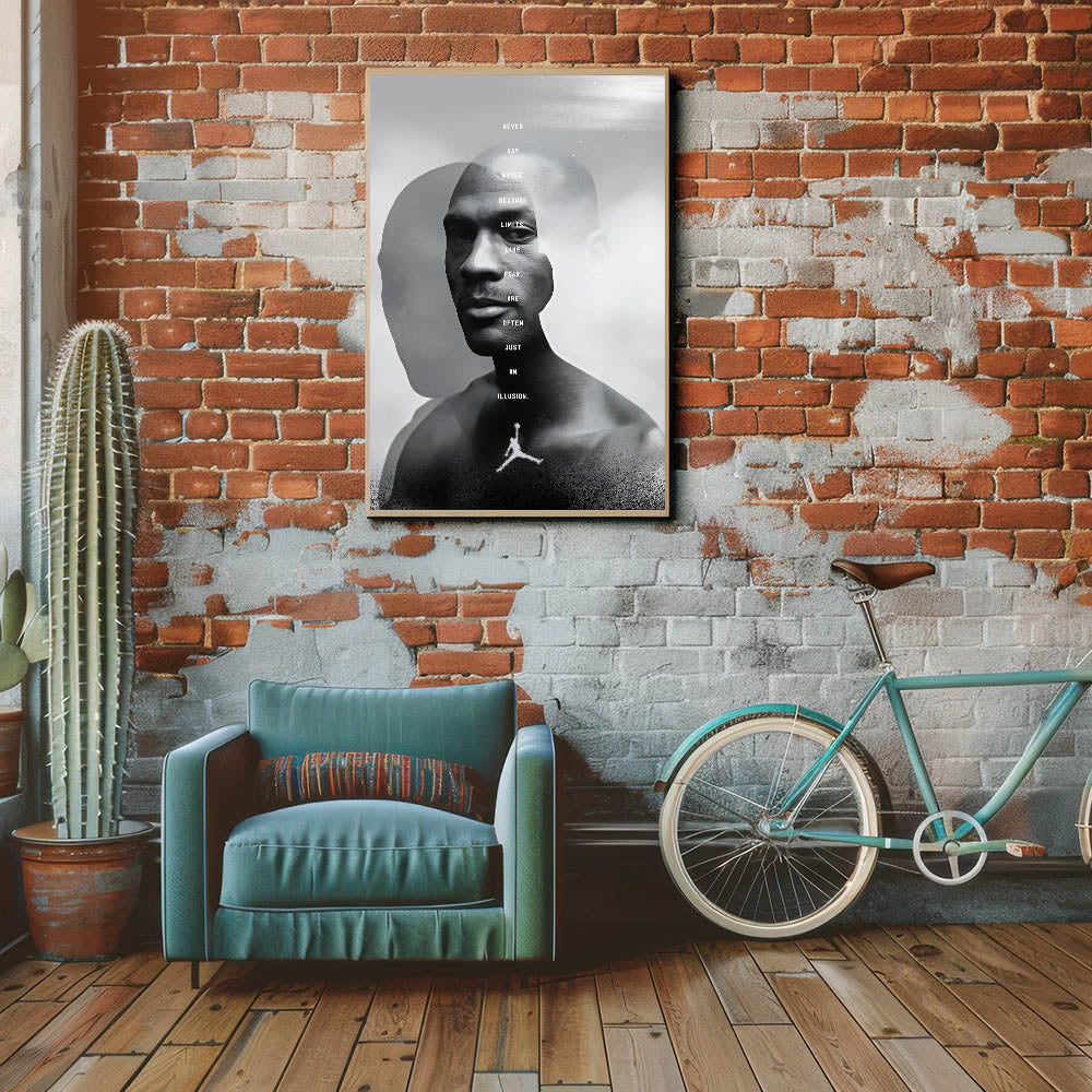 Embrace the power of simplicity with this striking pop art wall decor featuring Michael Jordan and a motivational quote. Showcasing a sleek blend of black, white, and gray, this artwork captures the essence of retro-inspired pop art with a modern, minimalist twist. The intense contrasts and iconic elements make it a must-have for sports enthusiasts and art collectors alike.