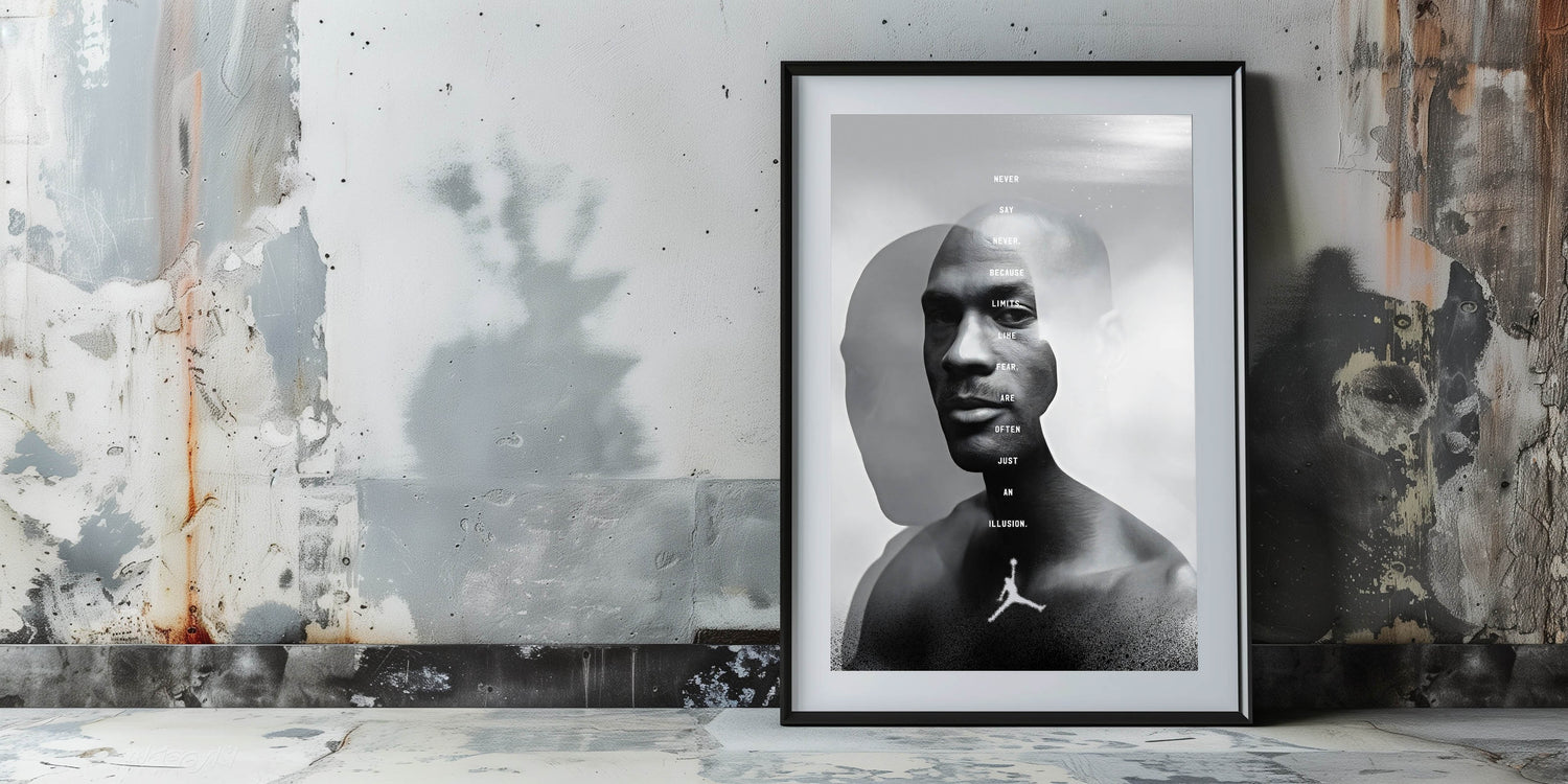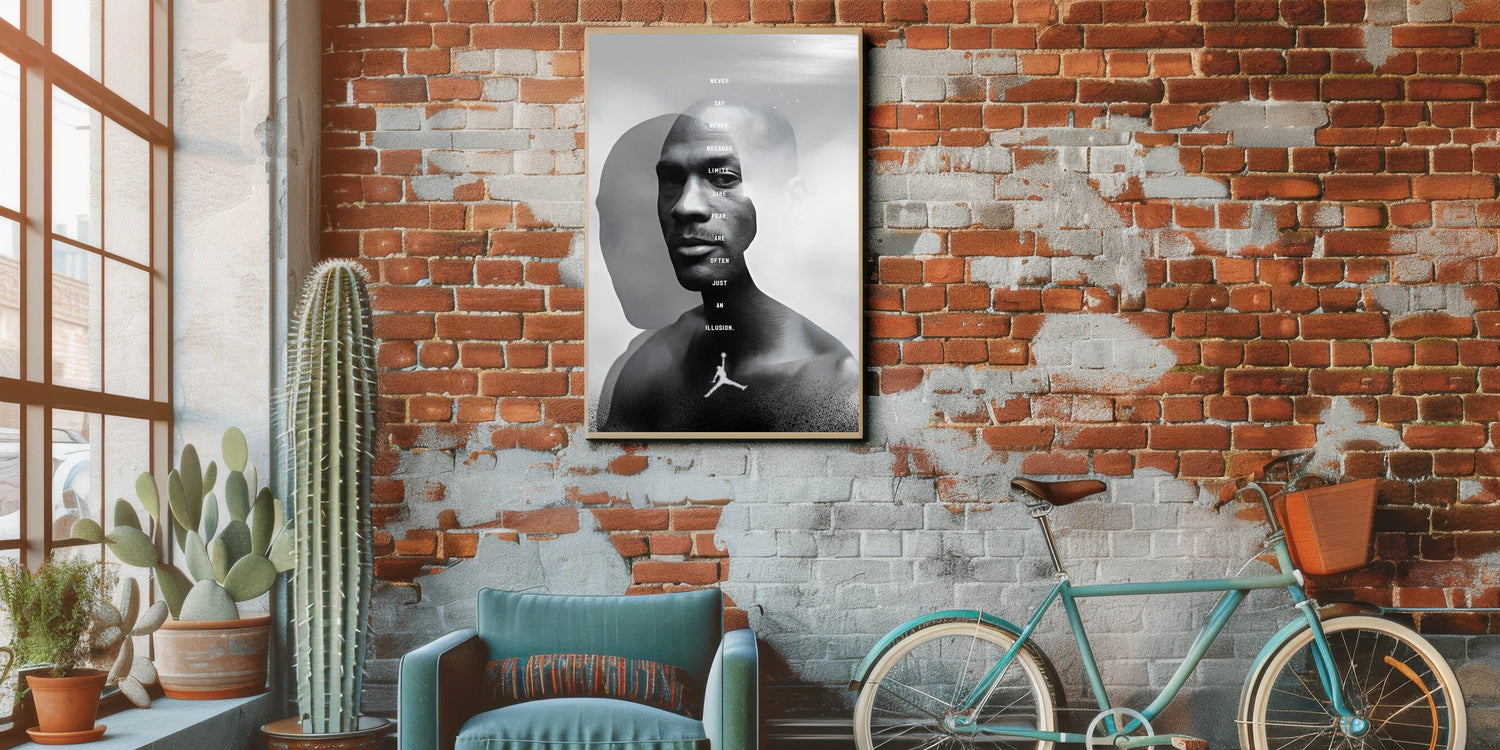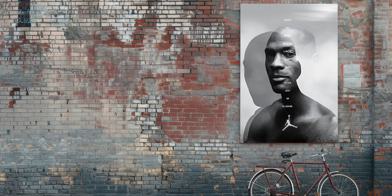 Embrace the power of simplicity with this striking pop art wall decor featuring Michael Jordan and a motivational quote. Showcasing a sleek blend of black, white, and gray, this artwork captures the essence of retro-inspired pop art with a modern, minimalist twist. The intense contrasts and iconic elements make it a must-have for sports enthusiasts and art collectors alike.