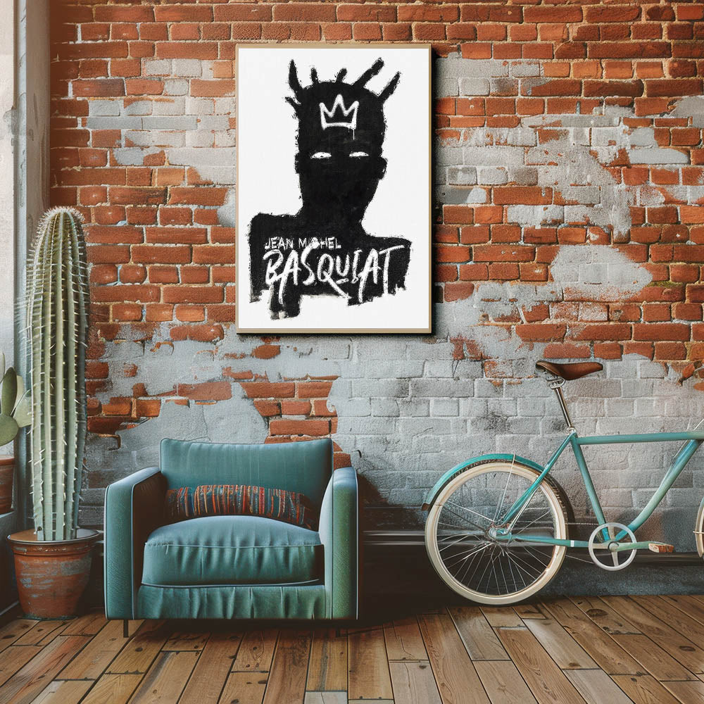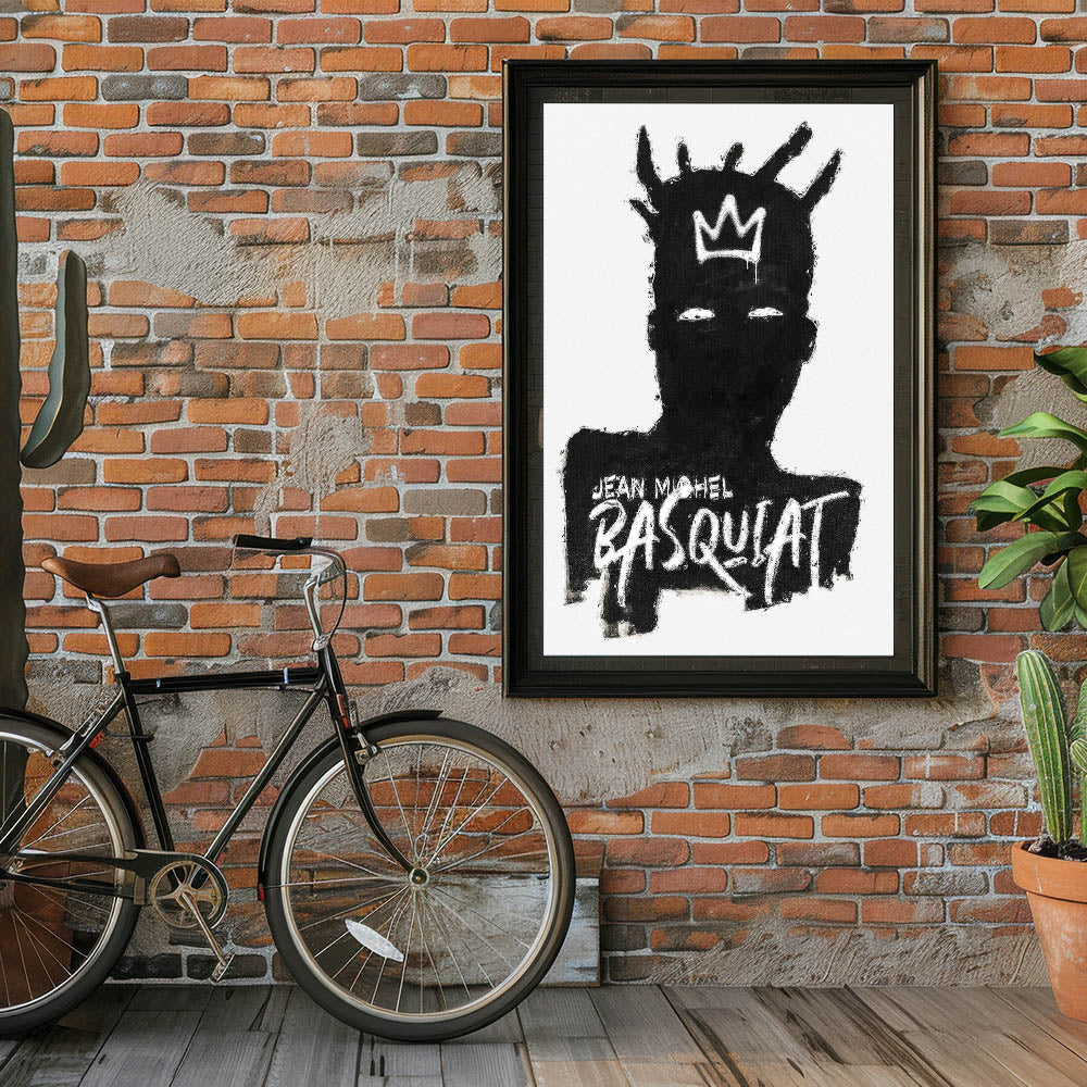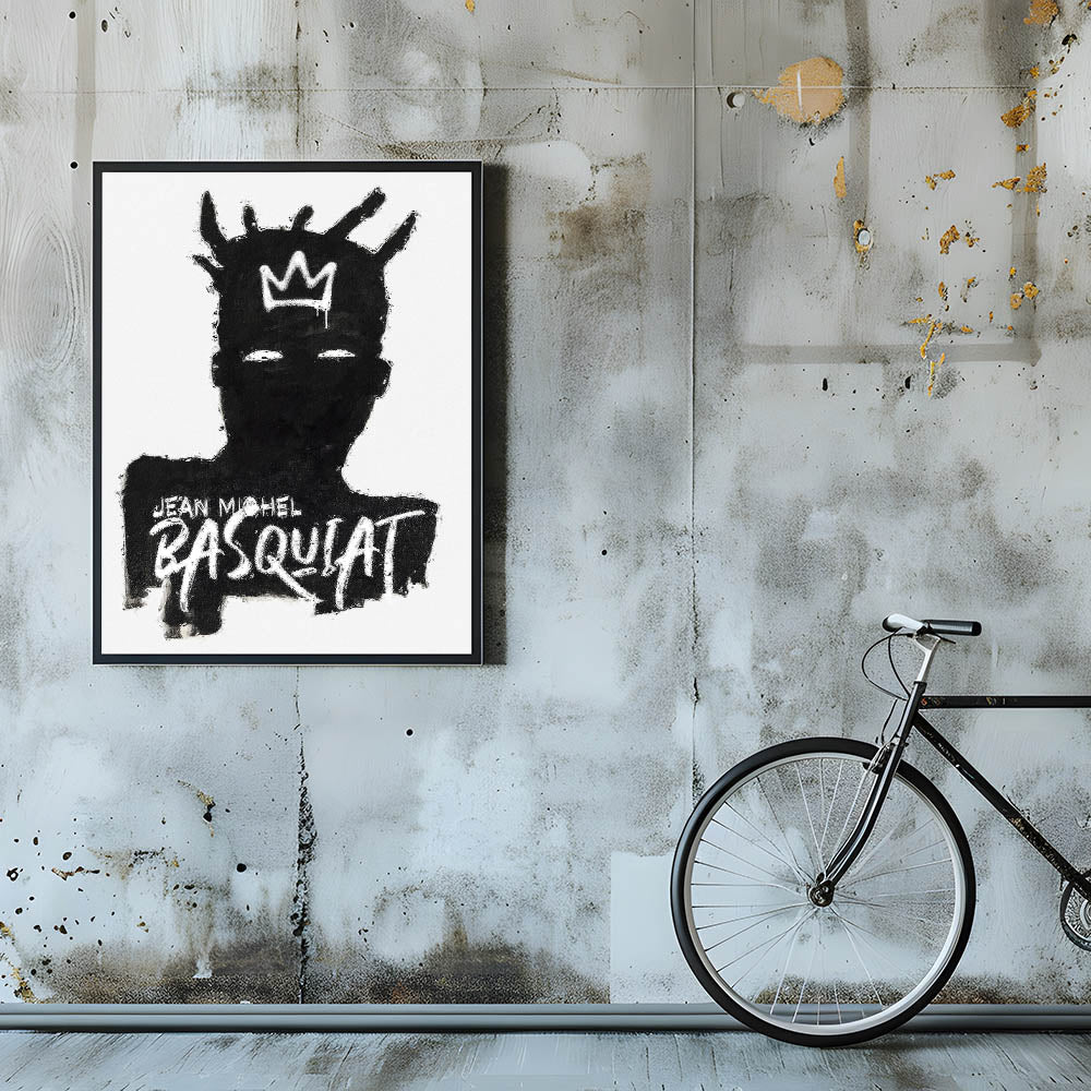 Embrace the essence of modern pop art with this striking black and white wall art, inspired by the raw and expressive style of Jean-Michel Basquiat. Featuring a bold silhouette crowned with the iconic symbol, this artwork captures the rebellious spirit of street art and contemporary culture. Its minimalist yet powerful design makes it a perfect addition to any urban-themed space.