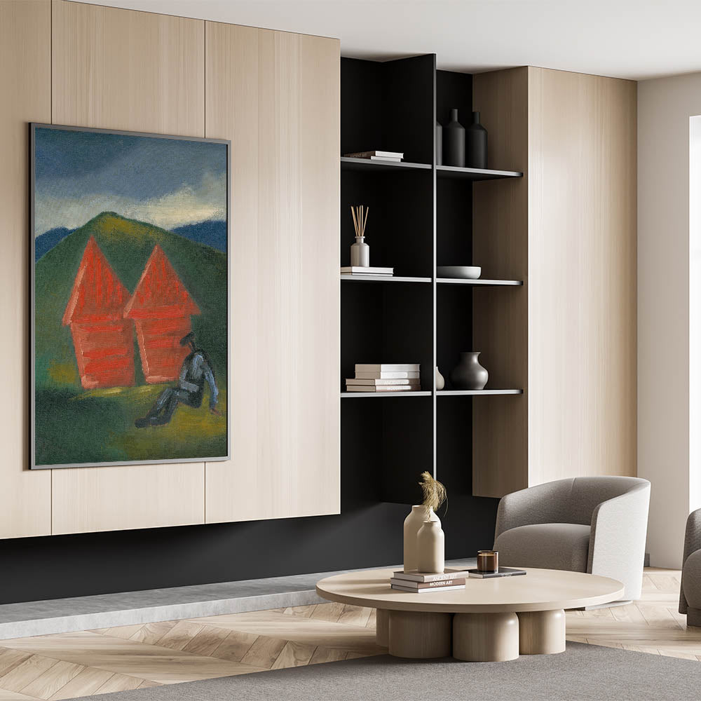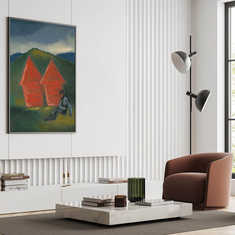 Introduce a touch of rustic charm to your space with this Modern Wall Art piece featuring an abstract rural landscape. Depicting two red barns against a backdrop of rolling green hills and darkened skies, this artwork captures a serene, contemplative moment in nature. Perfect for those who enjoy Contemporary Art Pieces with a rustic twist, this painting adds character and a hint of nostalgia to your decor.