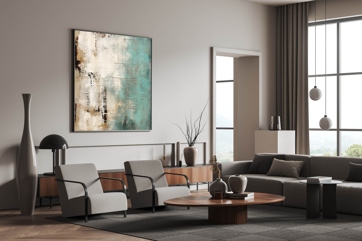 Elevate your space with this modern abstract artwork, featuring a soothing blend of teal, beige, and soft white tones. The textured brush strokes and layered design create a sense of depth and movement, making this piece an elegant addition to any contemporary interior. Its calming color palette brings a touch of serenity and sophistication, ideal for creating a peaceful atmosphere.