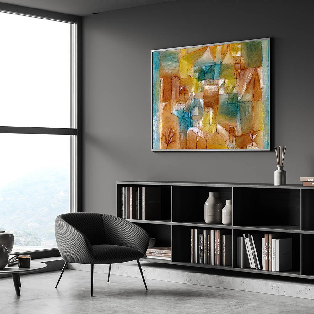 Transform your space with this captivating Modern Wall Art, featuring an abstract architectural composition inspired by Paul Klee's unique artistry. The piece showcases a blend of geometric forms and earthy tones, including warm browns, greens, and soft blues. Perfect for Trendy Home Decor, this artwork combines structure and creativity, making it a sophisticated addition to any room.
