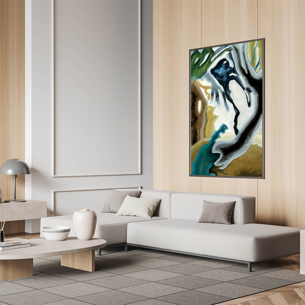 This mesmerizing modern wall art piece, titled Barnyard Fantasy, is an abstract depiction that captures the essence of a whimsical scene. Featuring fluid forms and a palette of earthy tones, blues, and greens, this artwork brings an imaginative and dreamy quality to any space. Ideal for fans of unique modern art, this contemporary print invites viewers to explore its abstract shapes and dynamic movement, making it a captivating addition to living rooms, offices, or creative spaces. With its blend of natural elements and surreal style, this piece adds a stylish wall art touch to trendy home decor.