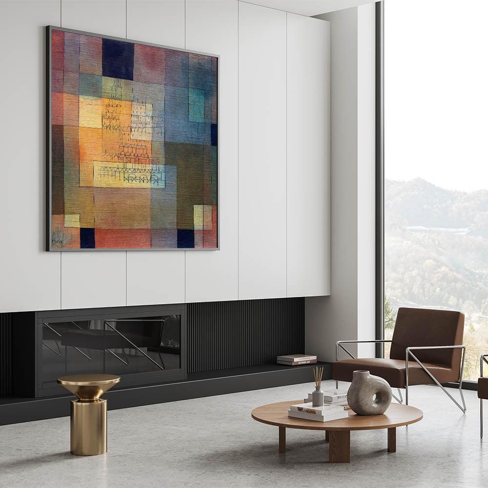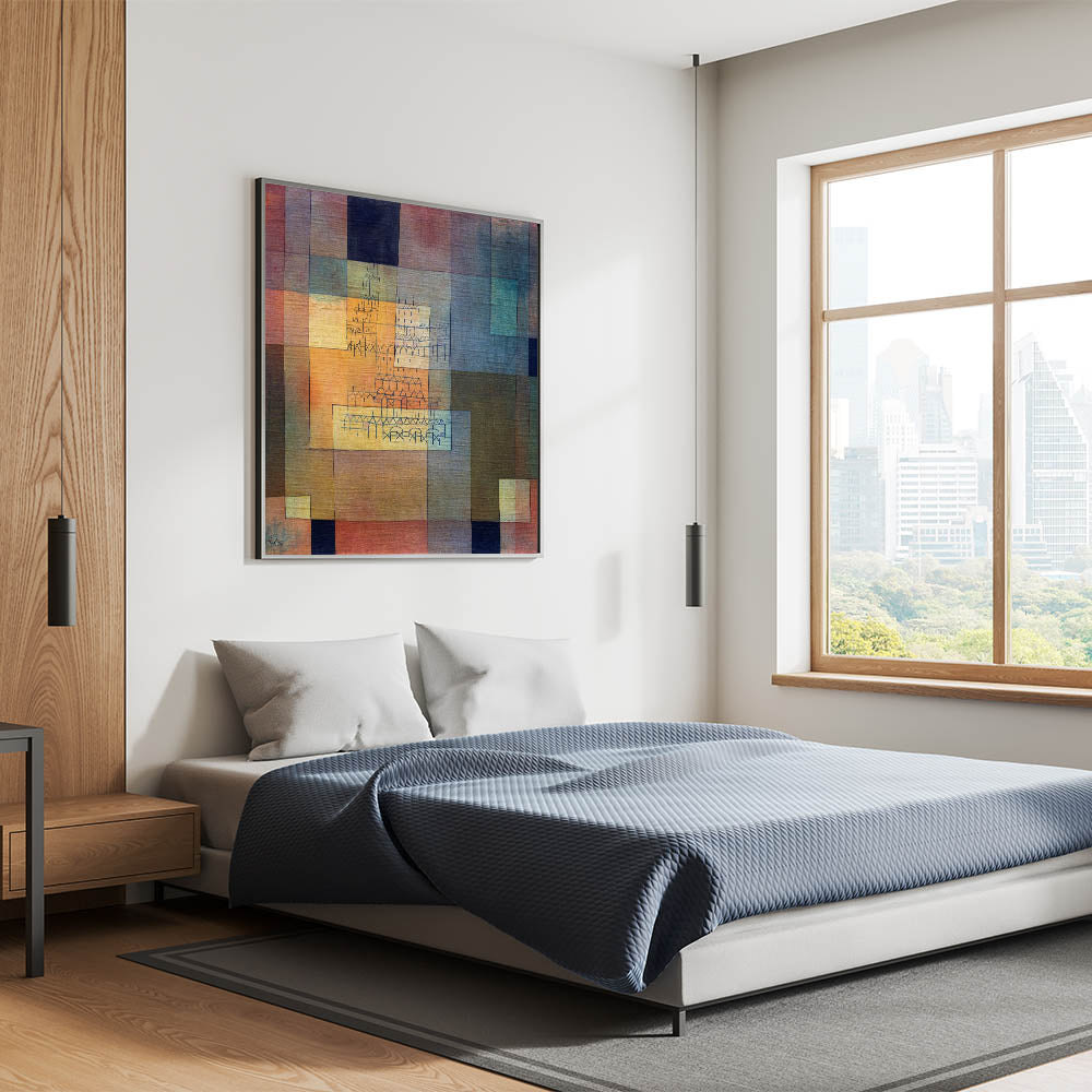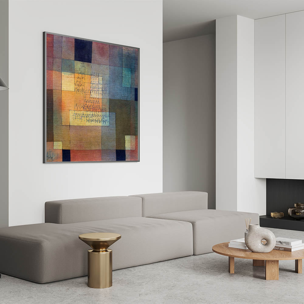 Transform your space with this Modern Wall Art, featuring an abstract geometric depiction of architecture by the renowned artist Paul Klee. This intricate piece uses warm tones of amber, brown, and muted blue to create a harmonious balance of color and structure. The delicate grid-like design and layered textures evoke the essence of Contemporary Art, making it a timeless addition to your decor.