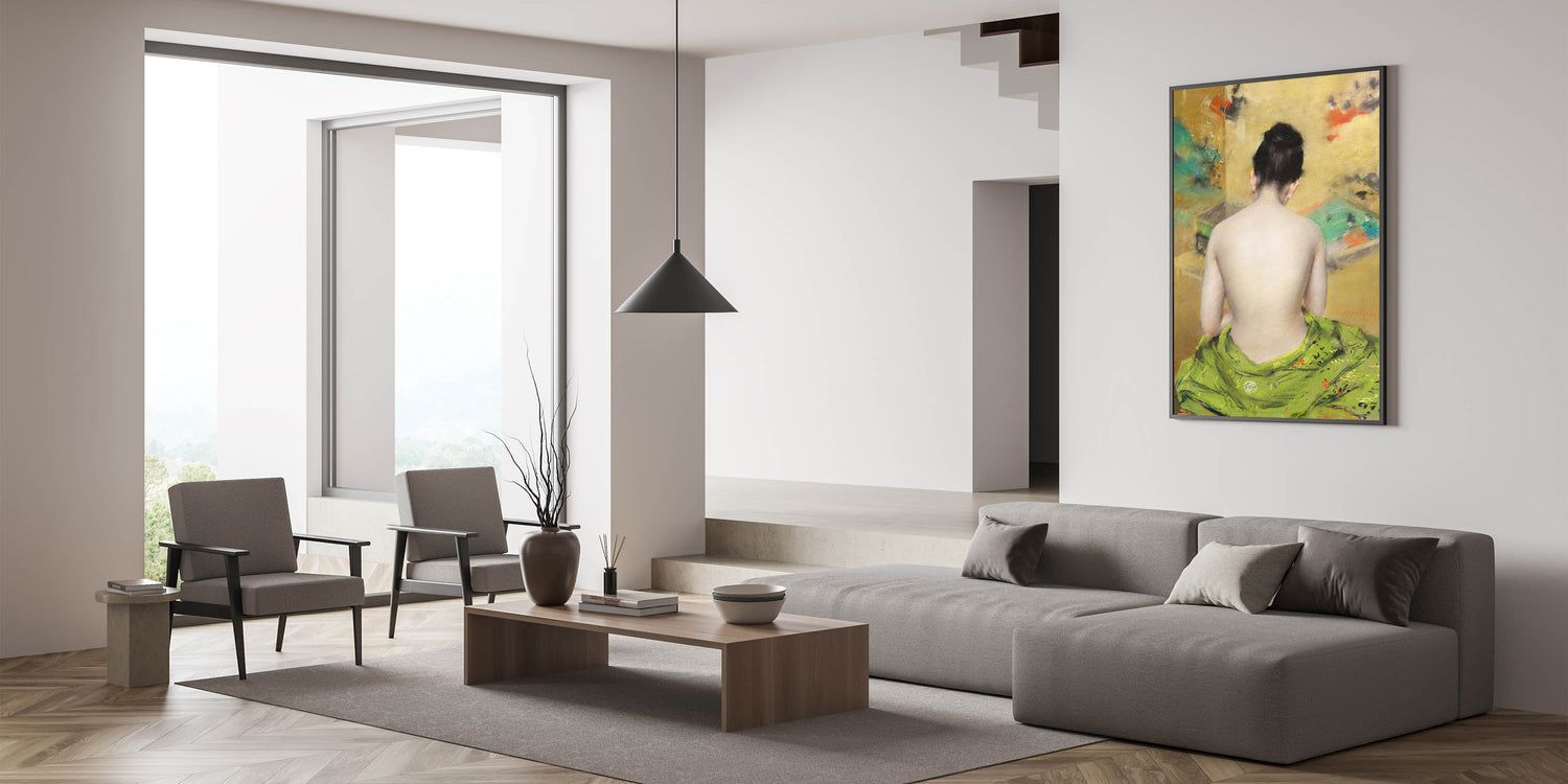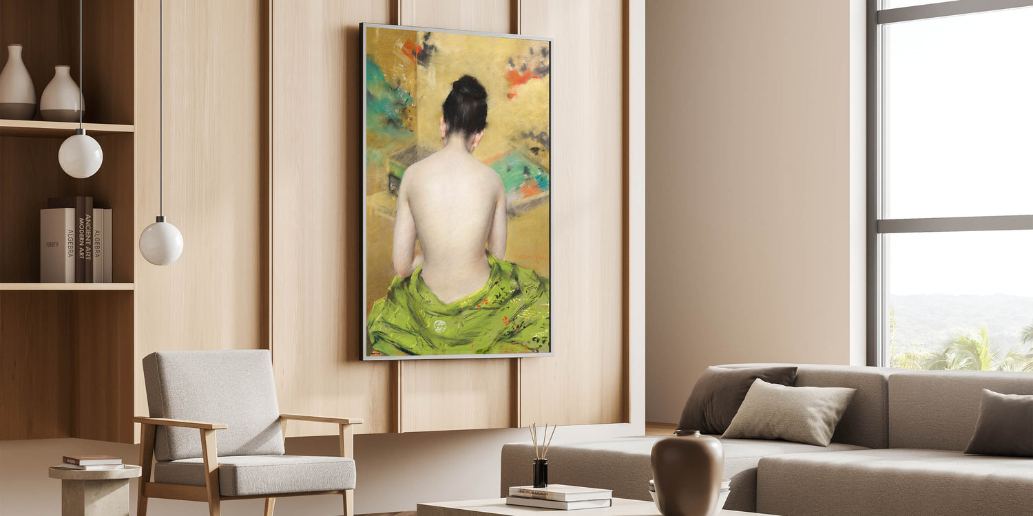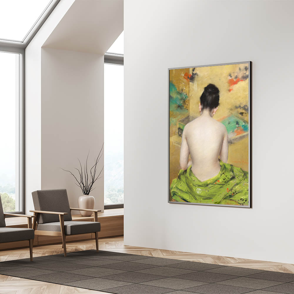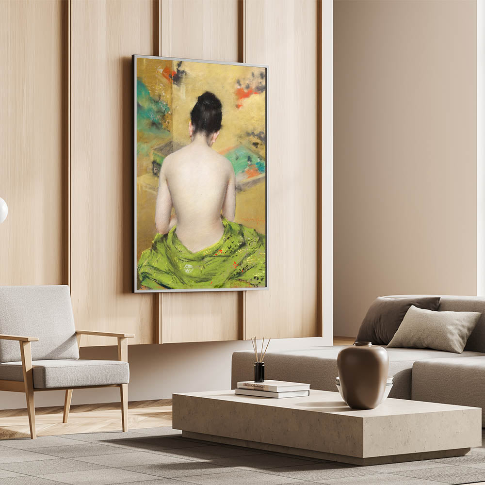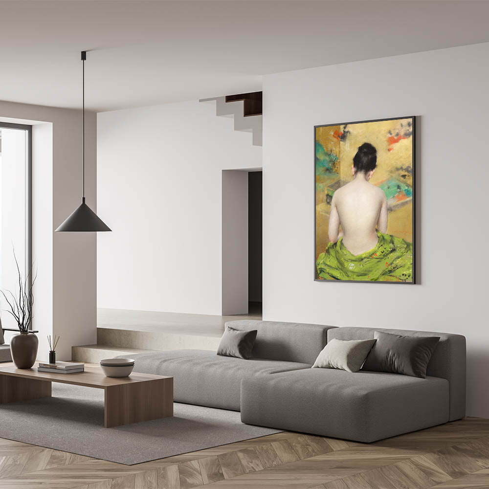 Add a touch of sophistication to your living space with this Modern Wall Art featuring an abstract study of a woman draped in a green kimono. This artwork combines sensual elegance with Modern Design Elements, making it an exceptional addition to any home. The soft tones of flesh contrast beautifully with the vibrant green and warm gold background, evoking a timeless charm that blends seamlessly with contemporary interiors.