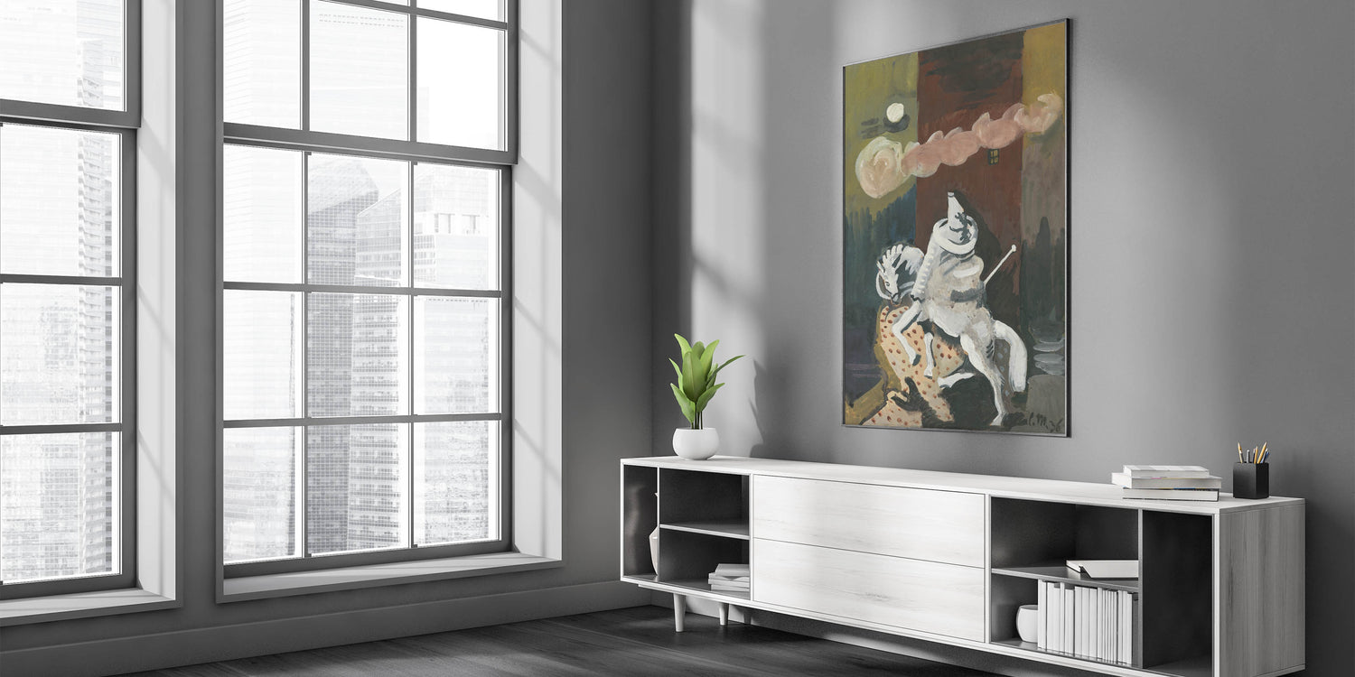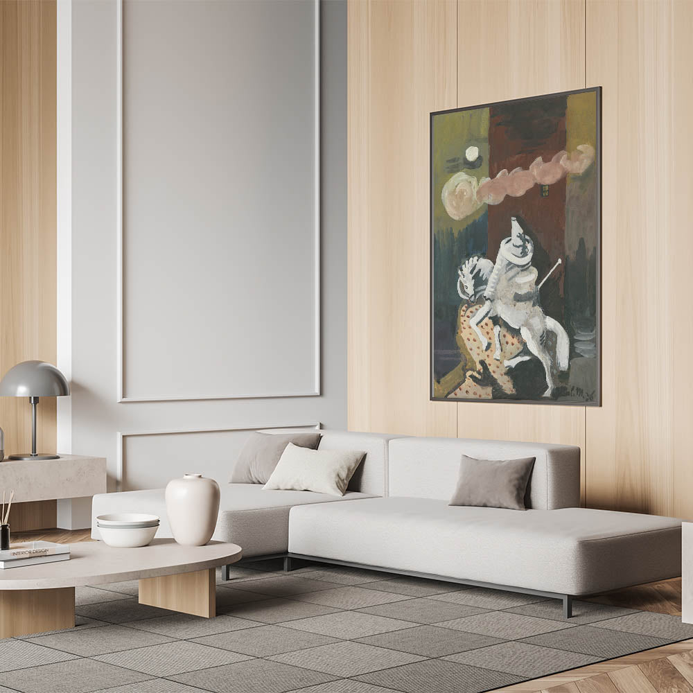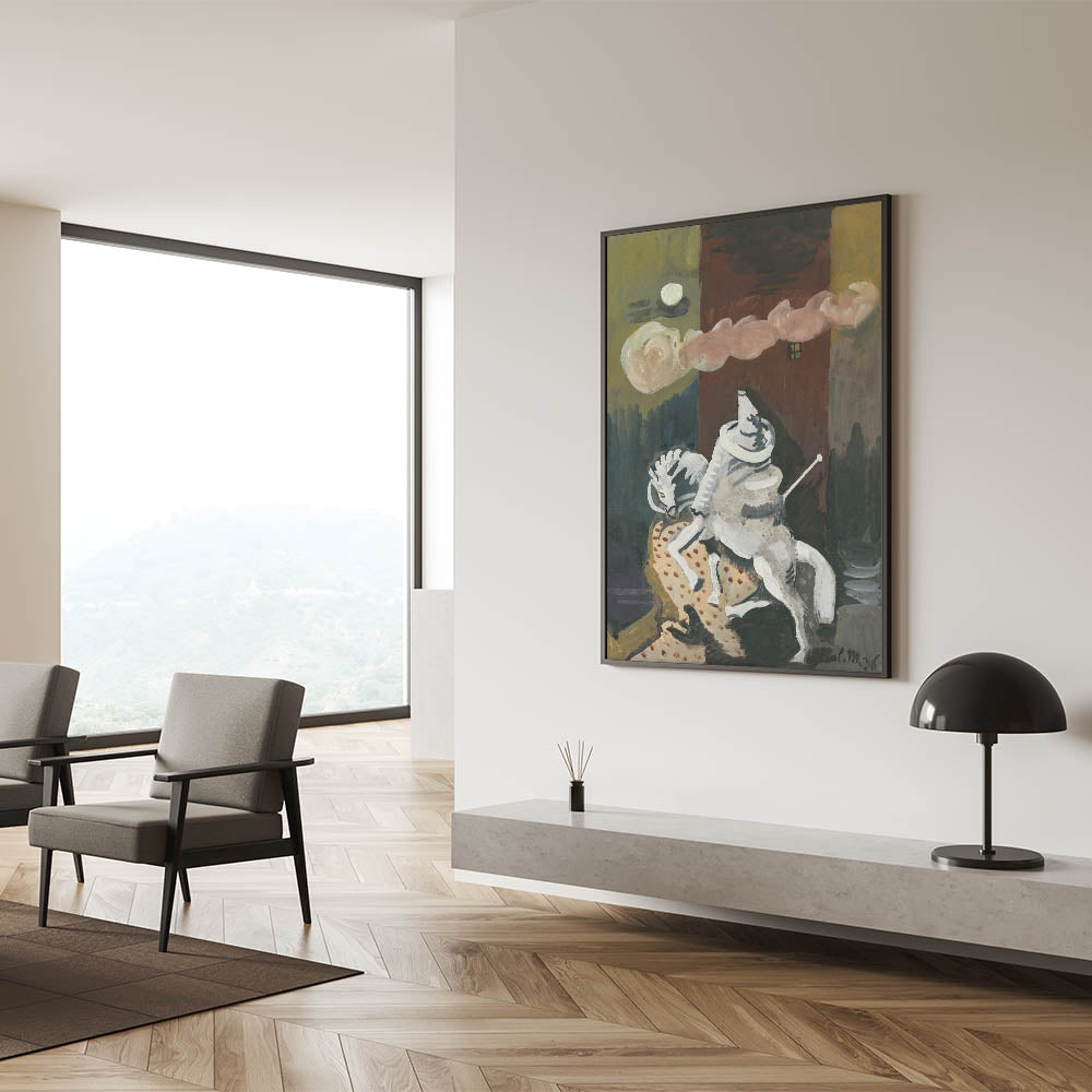 Immerse yourself in the intrigue of Modern Wall Art with At Night, a dreamlike painting by Cyprián Majerník. This evocative piece captures a knight astride a white horse, set against a surreal nocturnal landscape with muted greens, browns, and delicate moonlight. Its blend of mystery and symbolism makes it a striking addition to trendy home decor.
