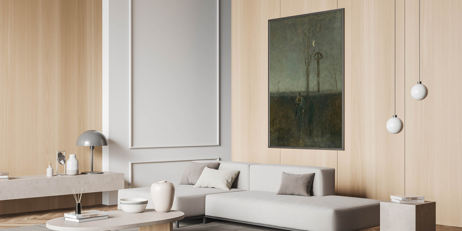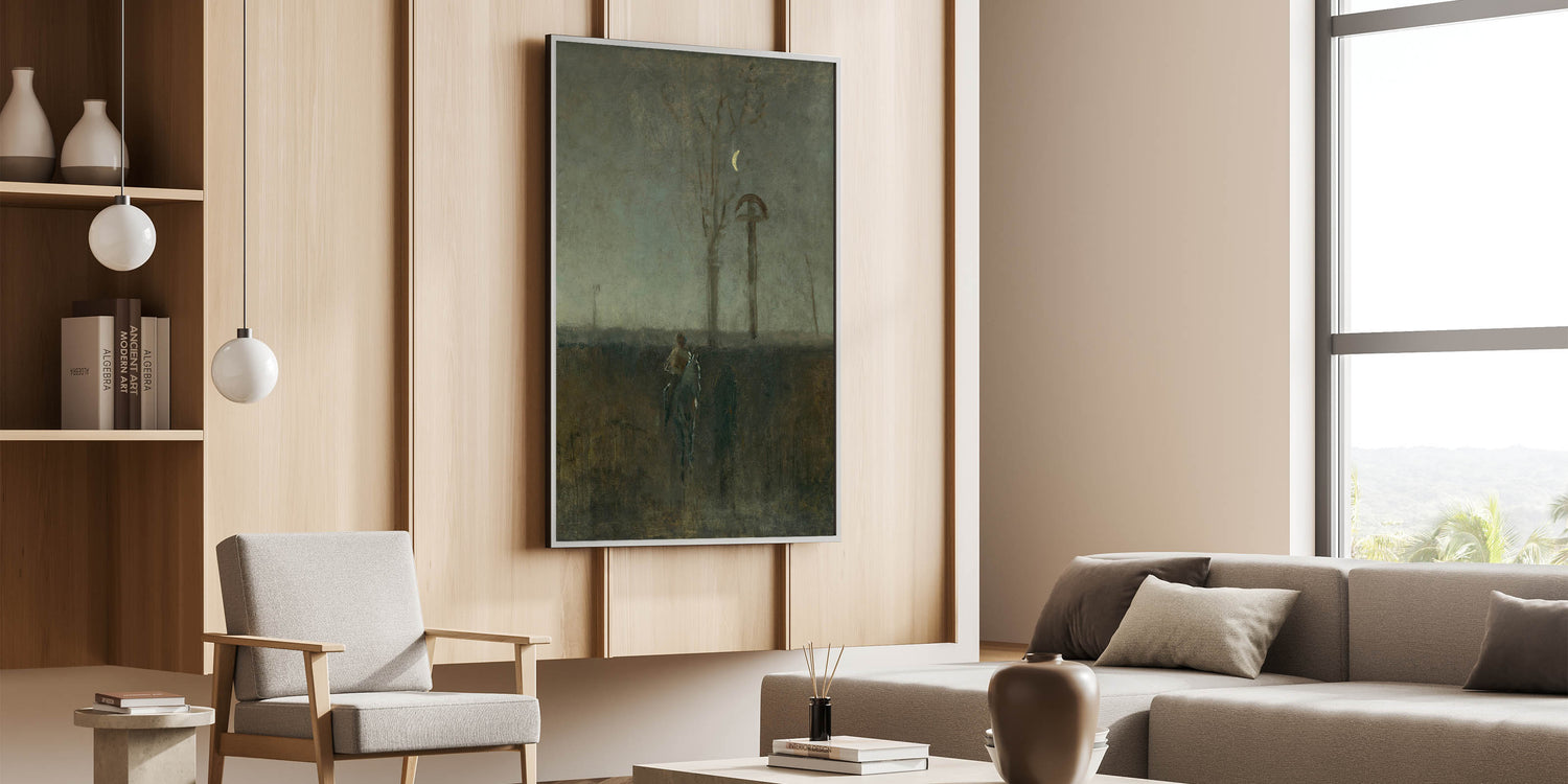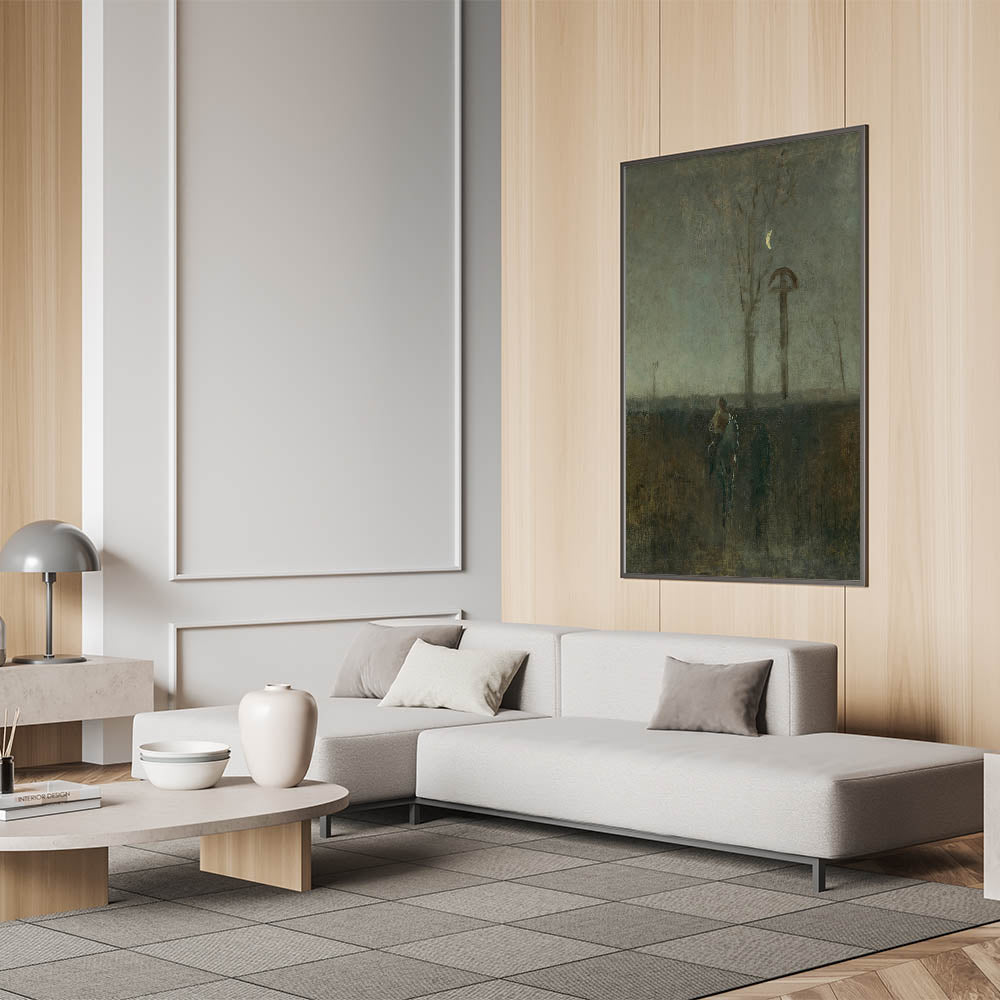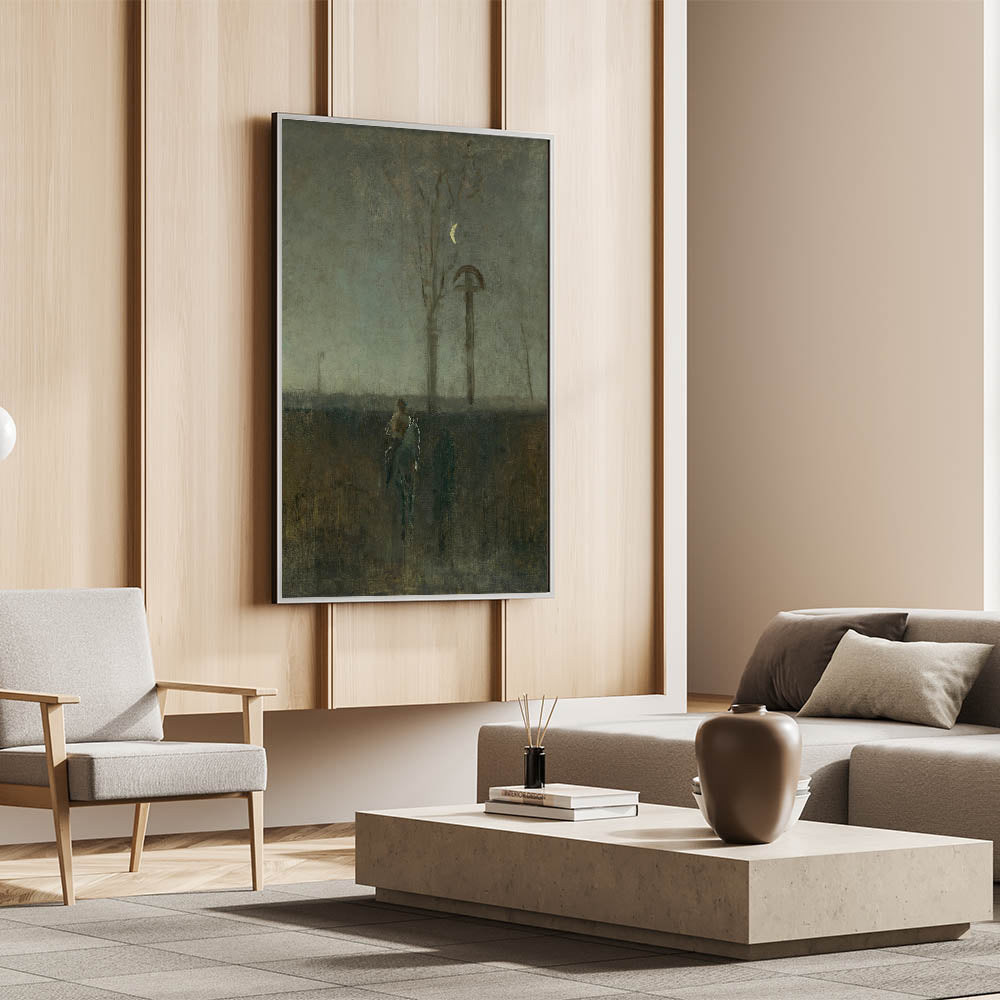 Embrace the quiet allure of the night with this atmospheric artwork depicting a lone rider in a tranquil landscape. The subdued color palette and ethereal moonlight create a sense of calm and solitude, making this modern wall art piece a beautiful addition for those who appreciate serene and contemplative art. Ideal for adding a reflective, peaceful ambiance to any room, this painting brings a touch of mystery and elegance to your decor.