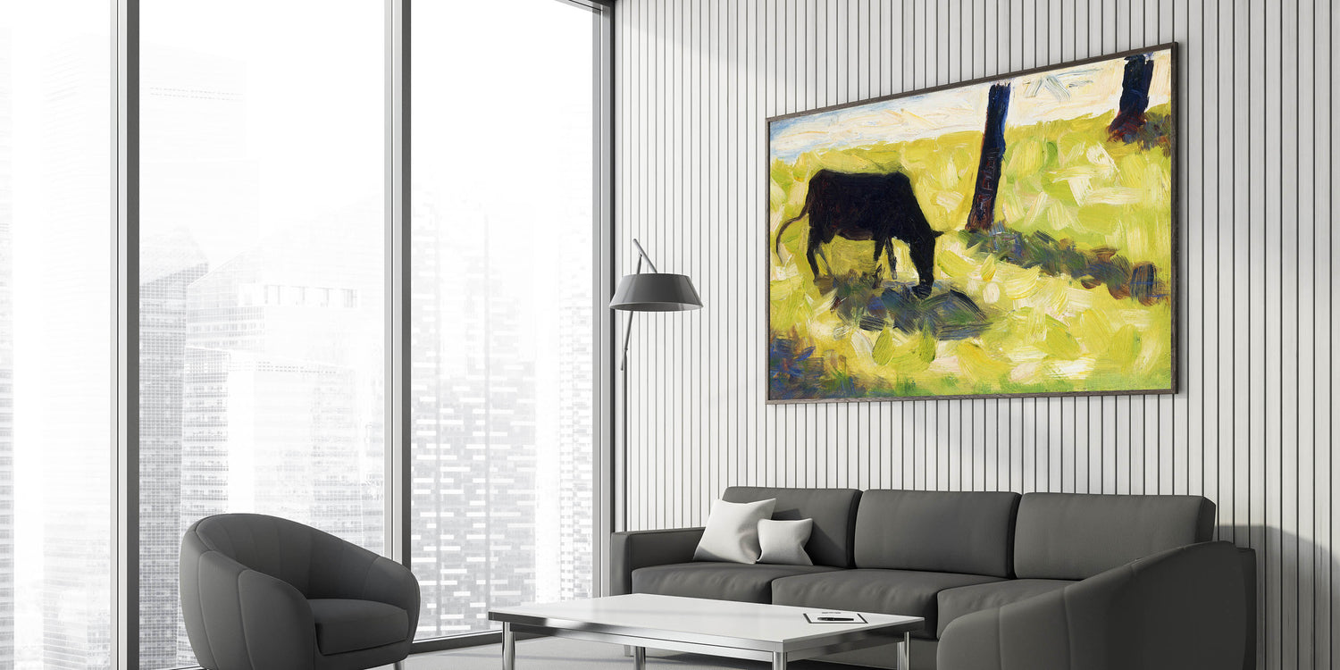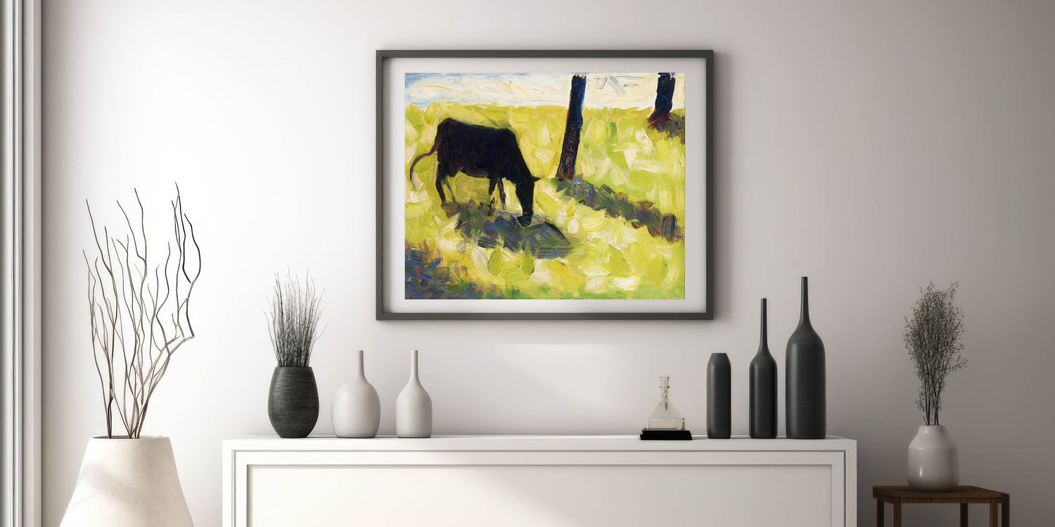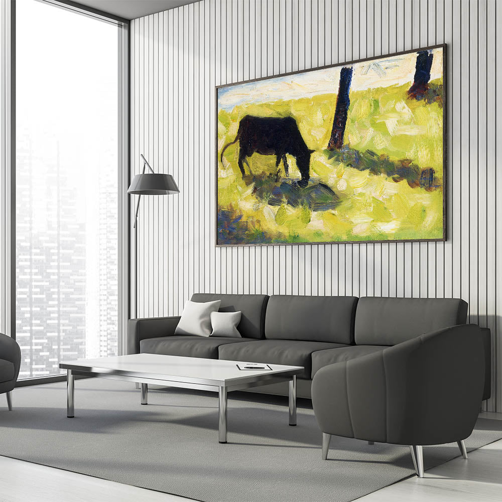 Introduce a touch of countryside charm to your decor with this Modern Wall Art, inspired by Georges Seurat's "Black Cow in a Meadow." This artwork captures a simple yet captivating scene of a black cow grazing in a sunlit meadow. The earthy palette and impressionistic brushstrokes make this piece perfect for those seeking rustic, nature-inspired decor with a modern twist.