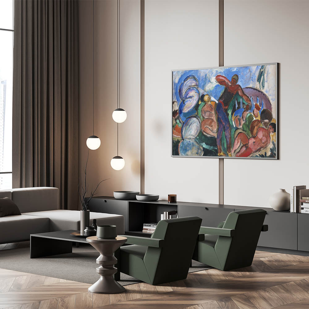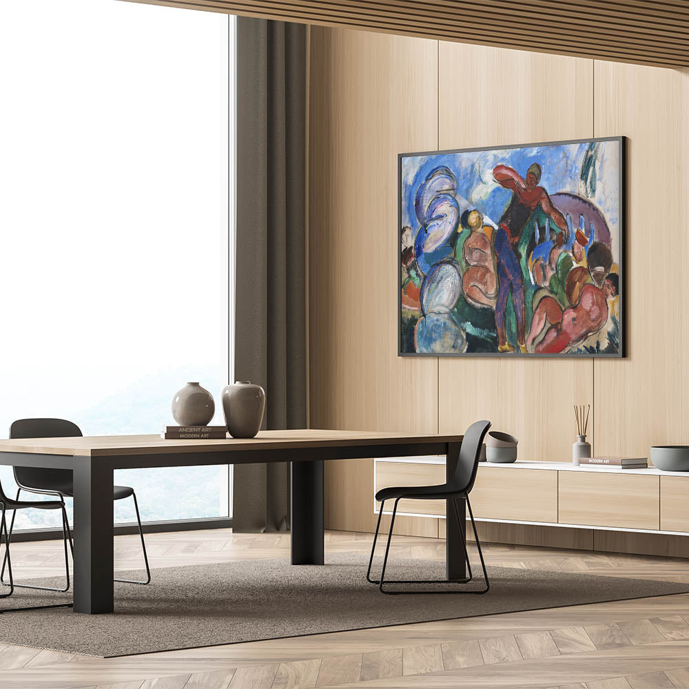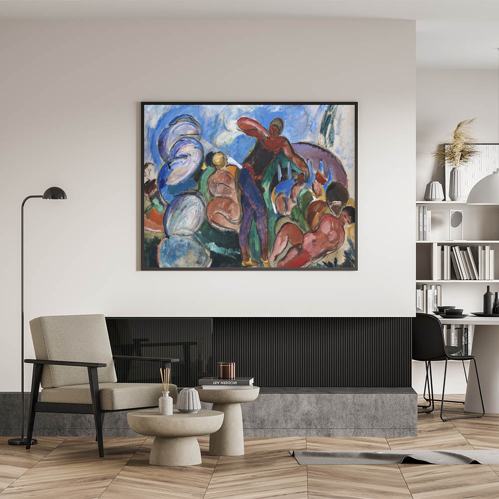Infuse energy and vibrancy into your space with this Modern Wall Art piece, a bold and expressive composition by Jens Adolf Jerichau. This artwork captures dynamic figures in motion, brought to life through intense shades of blue, red, and earthy greens. Perfect for those who appreciate Contemporary Art Pieces that convey movement and emotion, this Abstract Modern Art piece makes a striking addition to any room.