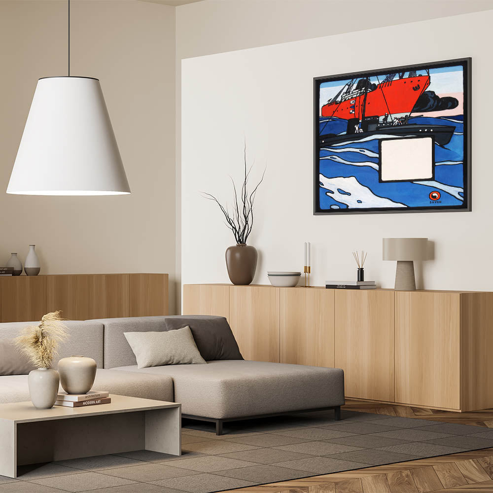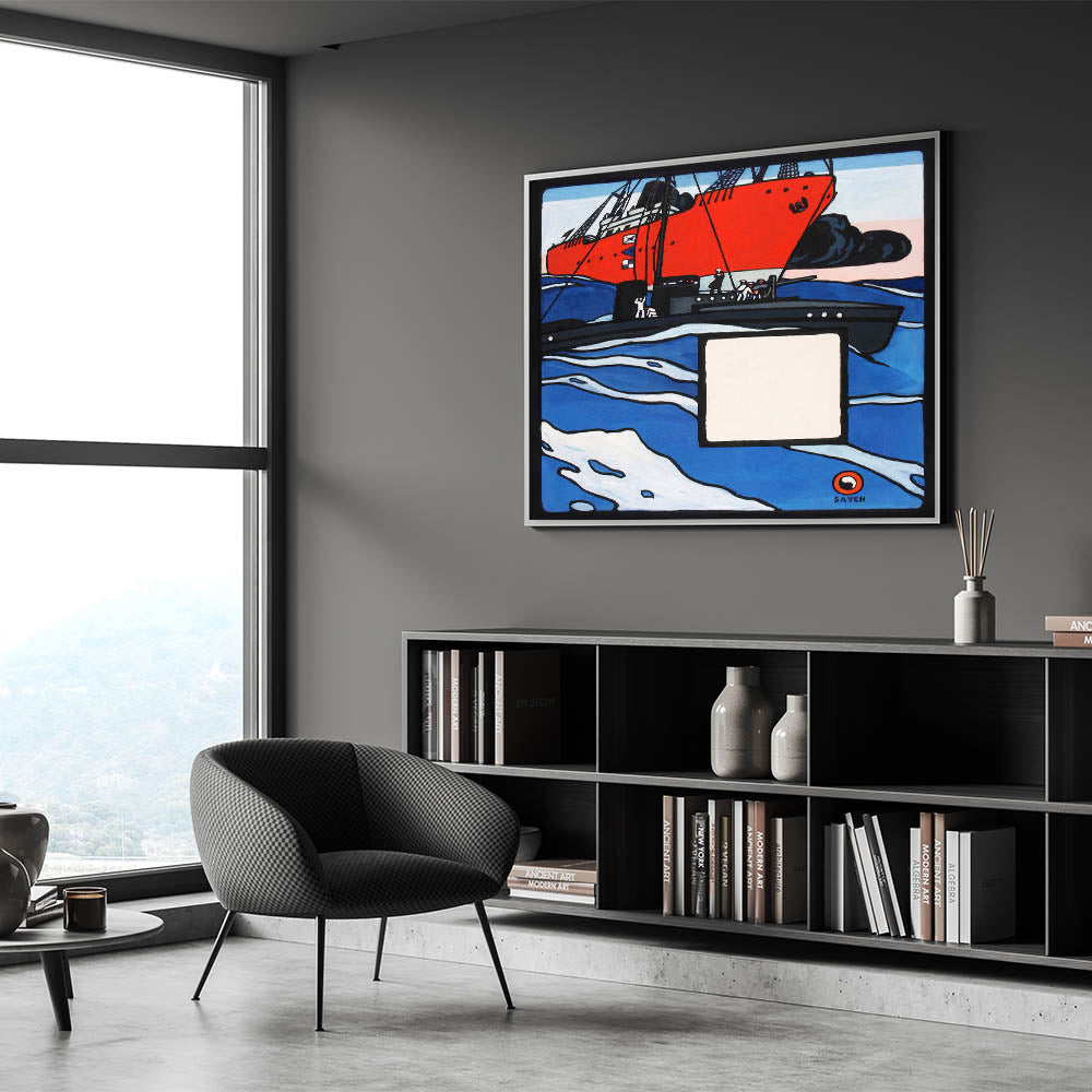 Bring a touch of maritime adventure to your space with this bold piece of modern wall art. This artwork captures a dynamic naval scene, rendered in striking shades of deep blue and vibrant red. The powerful contrasts and clean lines give this piece a contemporary edge, making it a perfect fit for trendy home decor. Ideal for anyone looking to add a touch of unique modern art to their walls, this artwork serves as both a focal point and a conversation piece.
