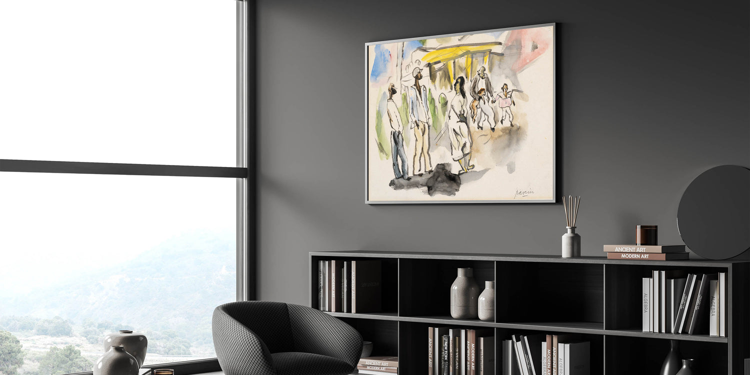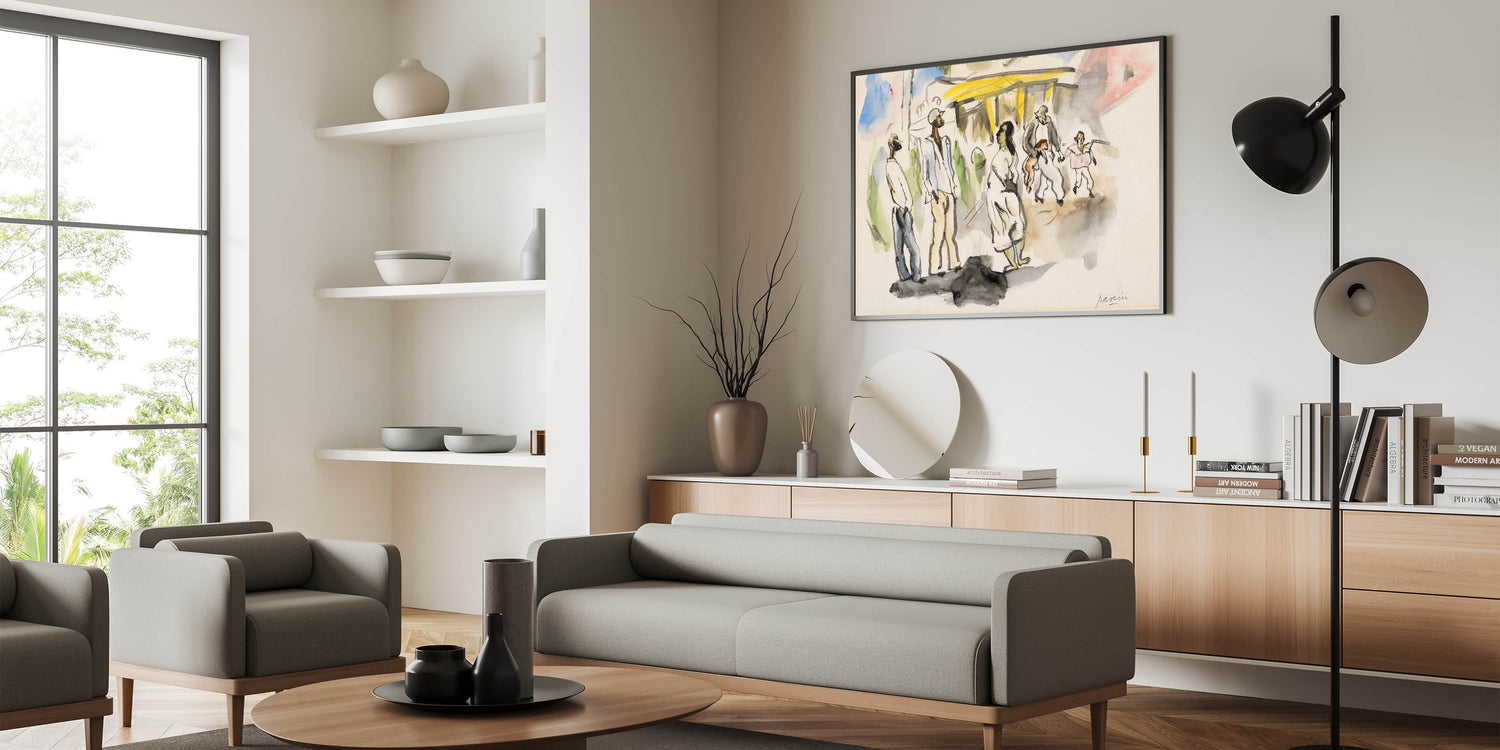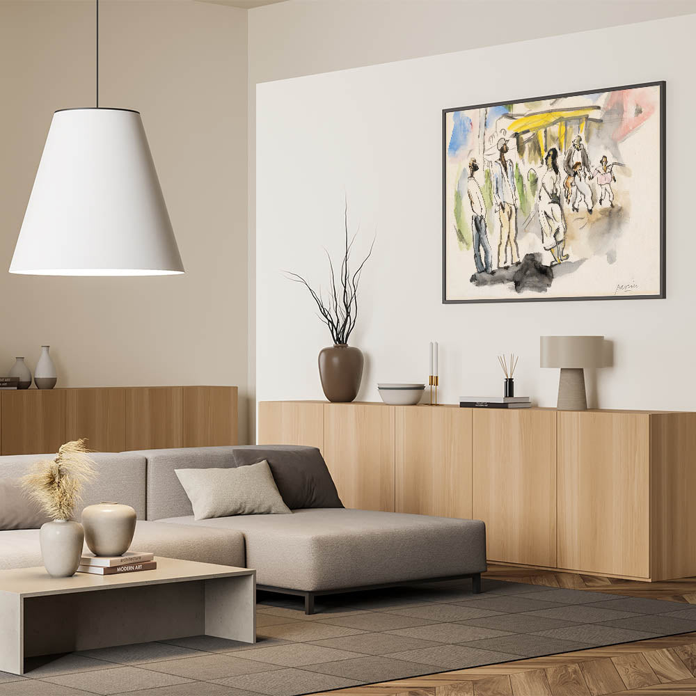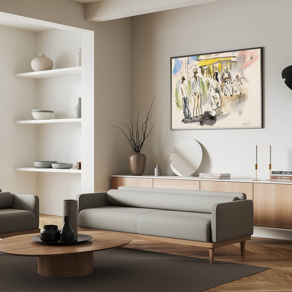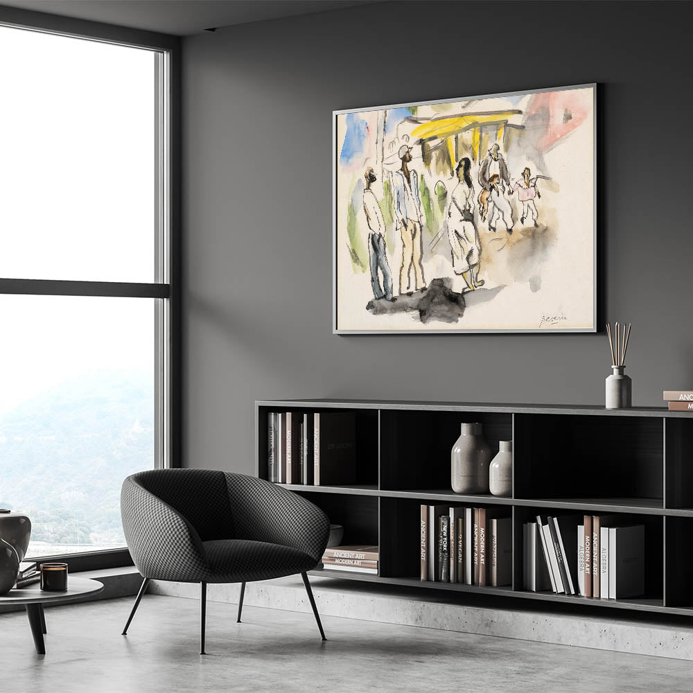 - Relaxed and Expressive Design: A lively scene of people in a minimalistic, watercolor style, adding a sunny and social vibe to your decor.