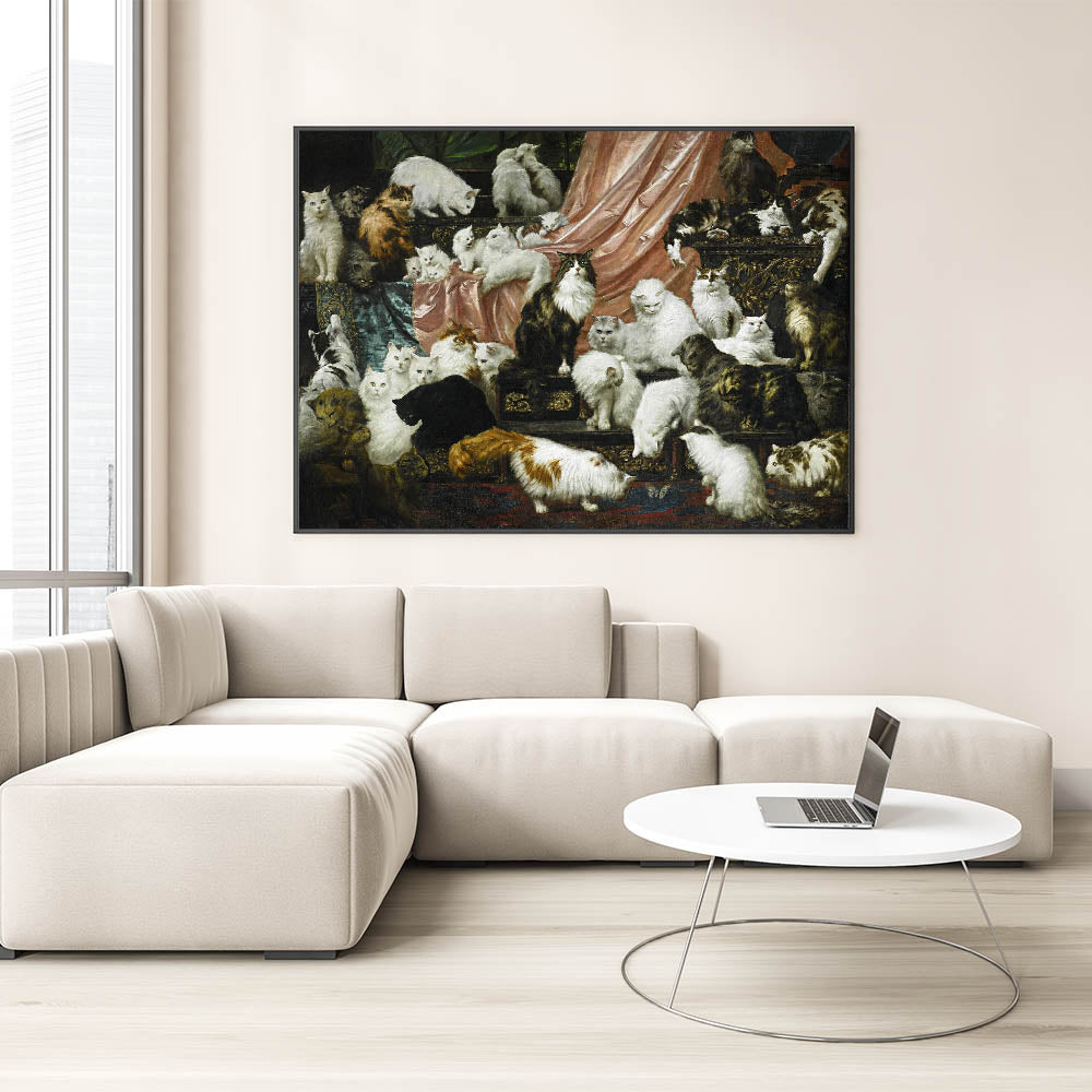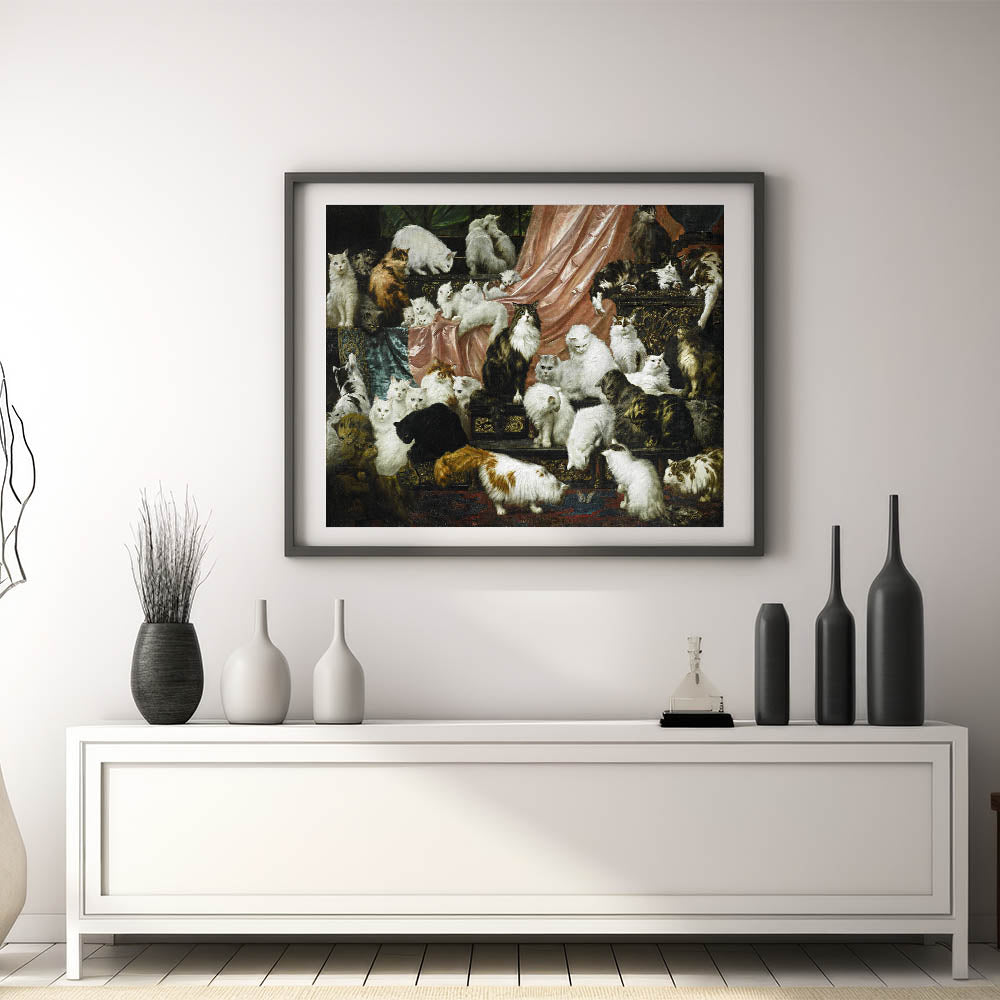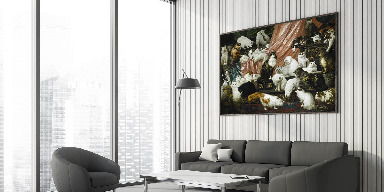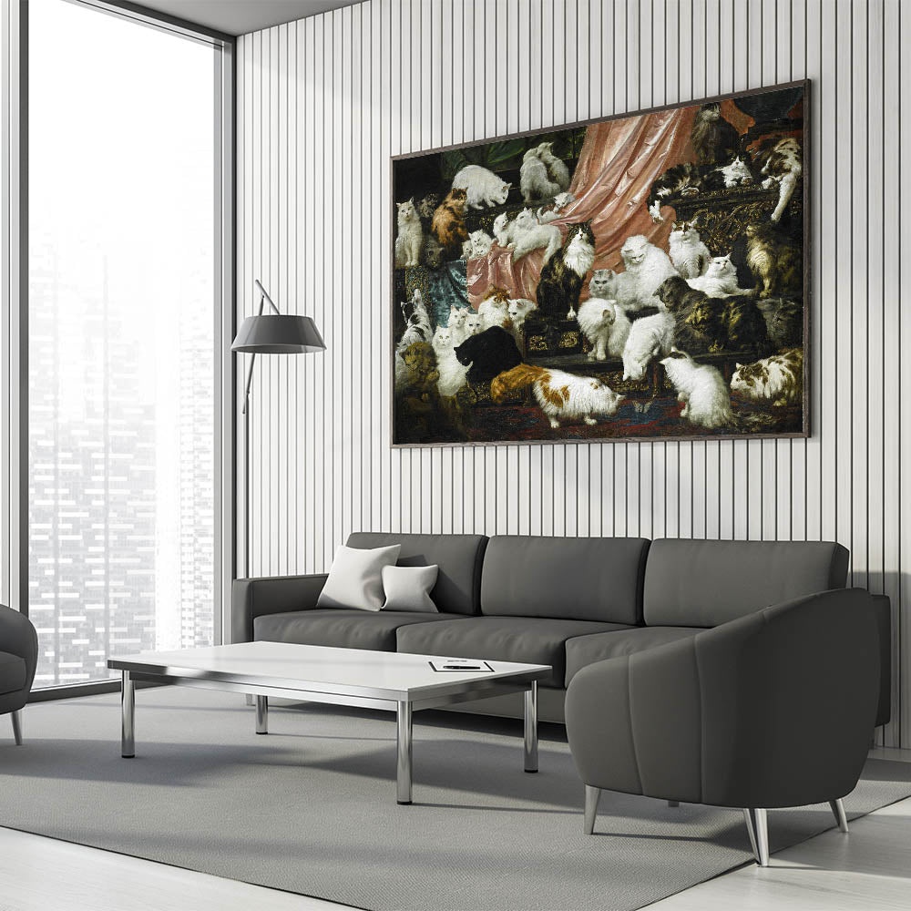 This captivating piece of modern wall art captures the elegance and charm of a gathering of beautiful cats, making it an ideal addition for cat lovers and art enthusiasts alike. Inspired by the Victorian era, this artwork combines a rich color palette with intricate details, creating a stunning focal point for any room. Its mix of classic and contemporary elements makes it a perfect choice for trendy home decor with a unique touch.