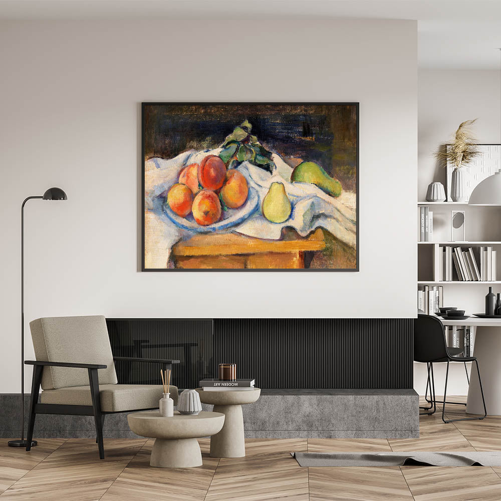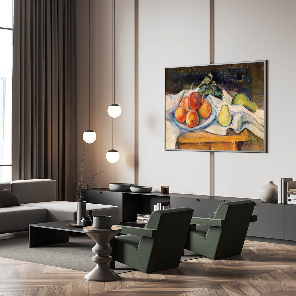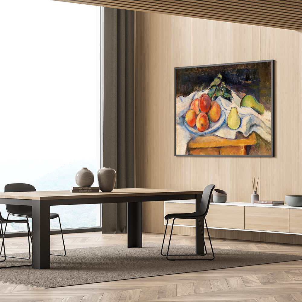 Bring timeless elegance to your decor with this exquisite modern wall art, featuring a classic still life of fruits on a table. Painted with Cézanne’s iconic brushwork, this artwork combines rich hues of oranges, yellows, and greens, beautifully contrasted against a dark, moody backdrop. The dynamic arrangement of fruits and delicate folds of fabric create a captivating composition that blends traditional artistry with modern appeal.