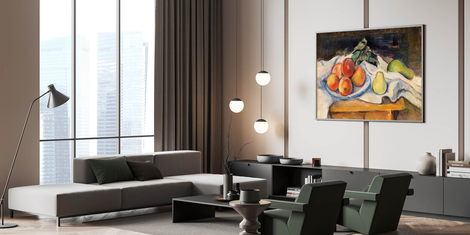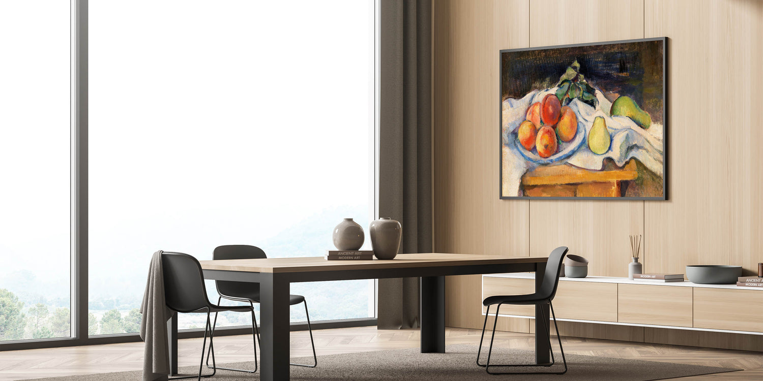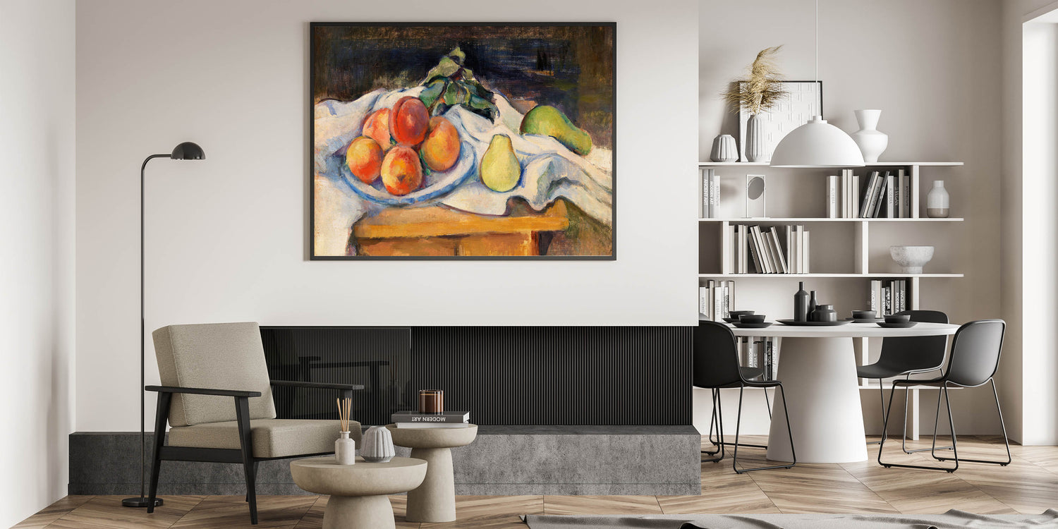 Bring timeless elegance to your decor with this exquisite modern wall art, featuring a classic still life of fruits on a table. Painted with Cézanne’s iconic brushwork, this artwork combines rich hues of oranges, yellows, and greens, beautifully contrasted against a dark, moody backdrop. The dynamic arrangement of fruits and delicate folds of fabric create a captivating composition that blends traditional artistry with modern appeal.