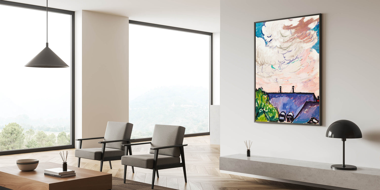 Brighten your living space with "Clouds Over Rooftops," a stunning modern wall art piece that captures the beauty of nature with a vibrant and expressive touch. Featuring soft pastel clouds, vivid green foliage, and dynamic blue rooftops, this contemporary art piece exudes energy and charm. Perfect for trendy home decor, its blend of bold strokes and serene tones creates a harmonious addition to any space.