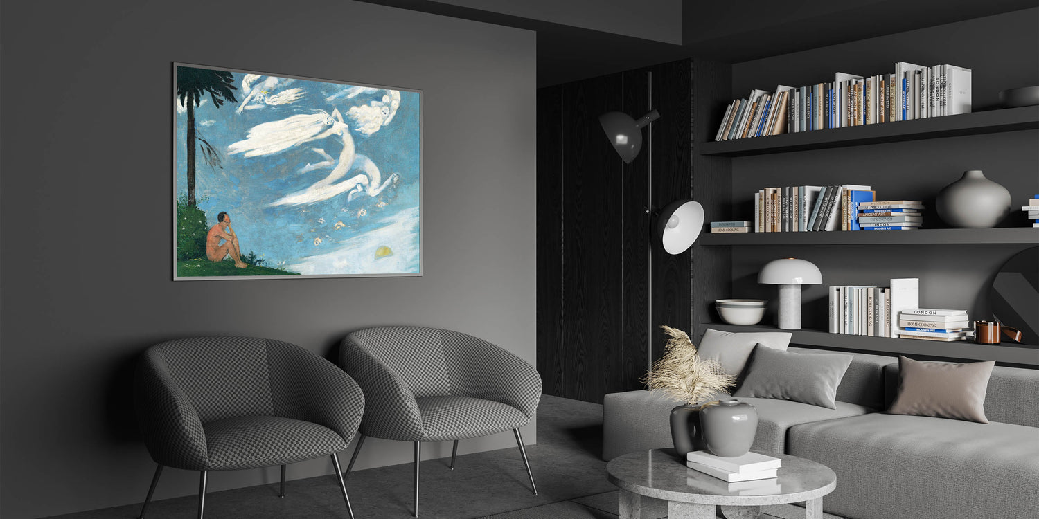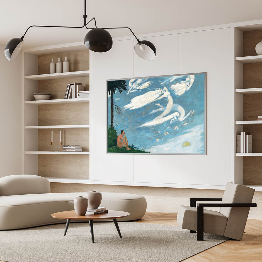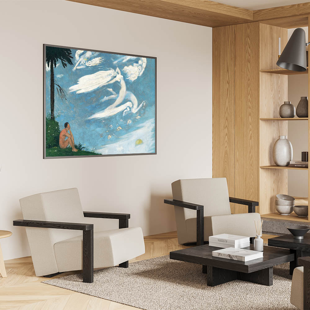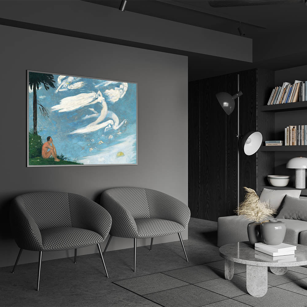 Elevate your space with this enchanting Modern Wall Art, featuring a dreamlike composition of ethereal figures soaring through a serene sky. This poetic and imaginative artwork captures the interplay of human reflection and celestial beauty, making it a perfect choice for trendy home decor. The soothing blue tones and graceful forms bring a sense of peace and wonder to any room.