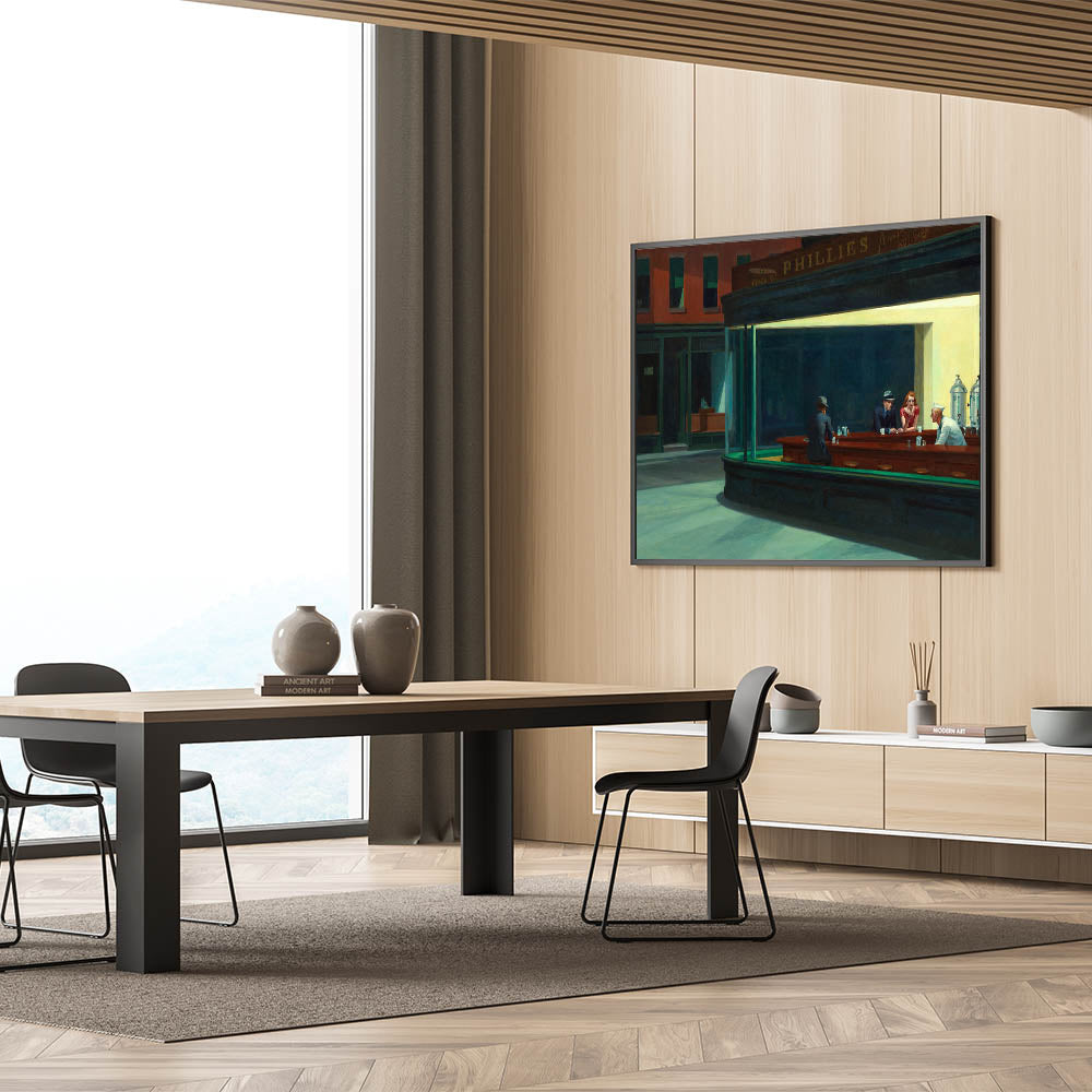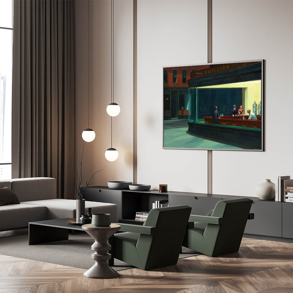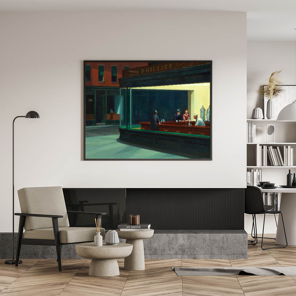 Capture the timeless allure of Edward Hopper’s "Nighthawks" with this modern wall art. Painted in 1942, this classic artwork portrays a late-night diner scene, highlighting the isolation and quiet beauty of urban life. With its rich shadows and dramatic lighting, "Nighthawks" is perfect for adding a touch of mystery and sophistication to any contemporary decor. This piece is a favorite for those who appreciate both art history and modern design elements, making it ideal for trendy home decor.