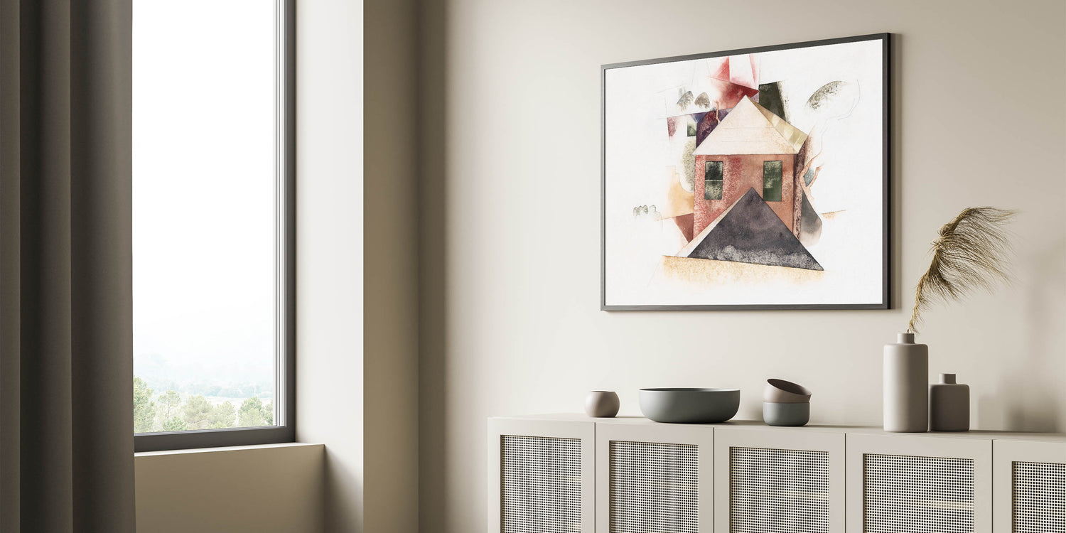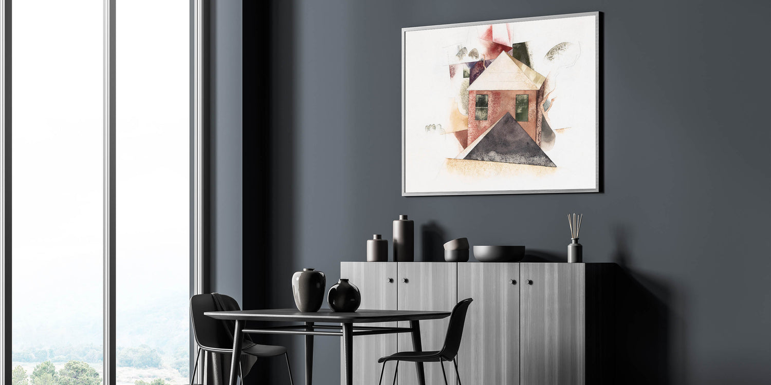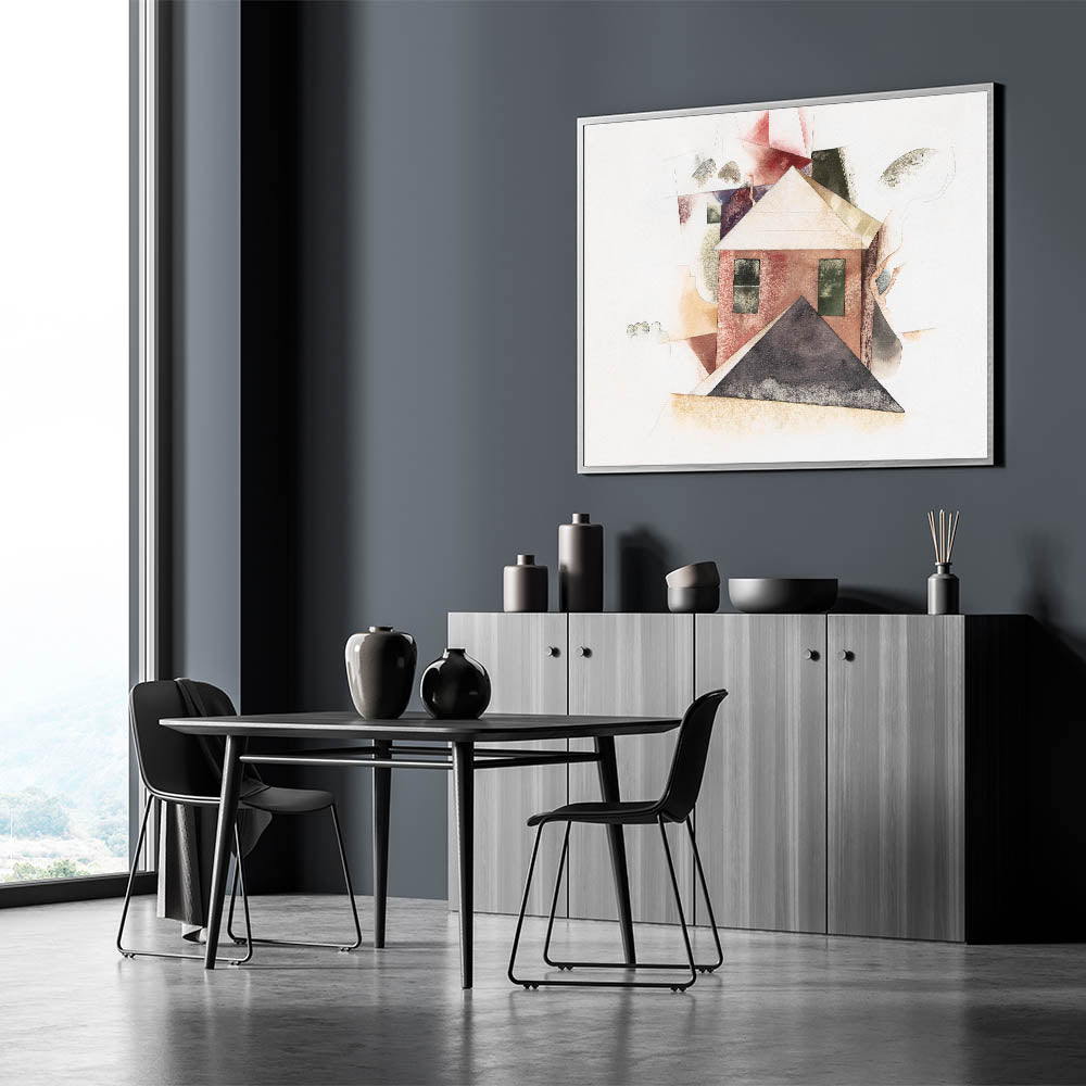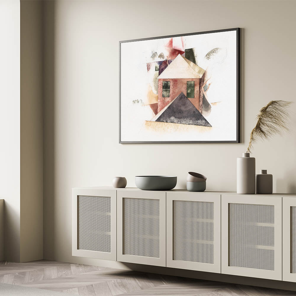 Elevate your decor with this Modern Wall Art inspired by Charles Demuth's "Houses with Red." This minimalist composition features abstracted shapes of a house, blending muted reds, greens, and soft tones to create a calm and sophisticated architectural impression. Perfect for lovers of understated elegance, this artwork brings a refined touch to any space with its subtle use of color and form.