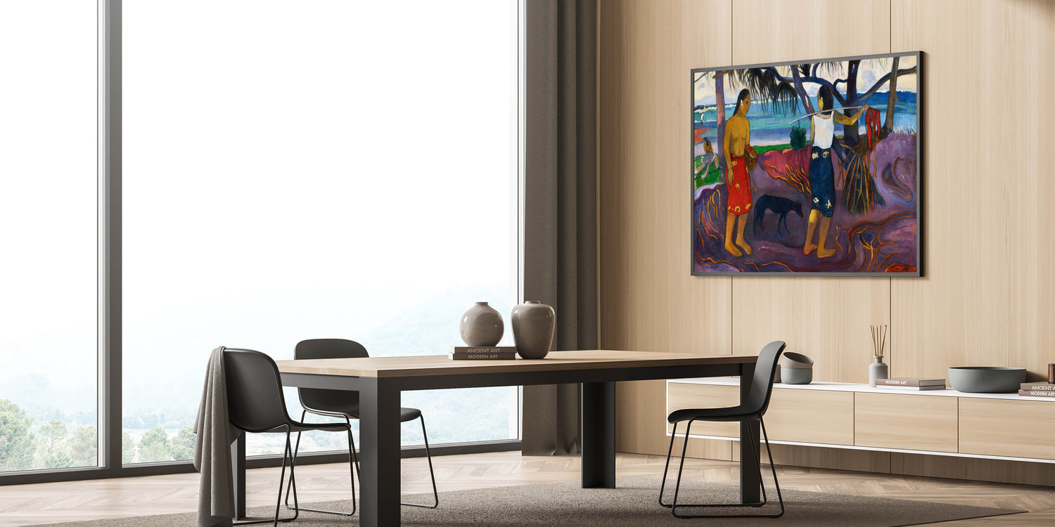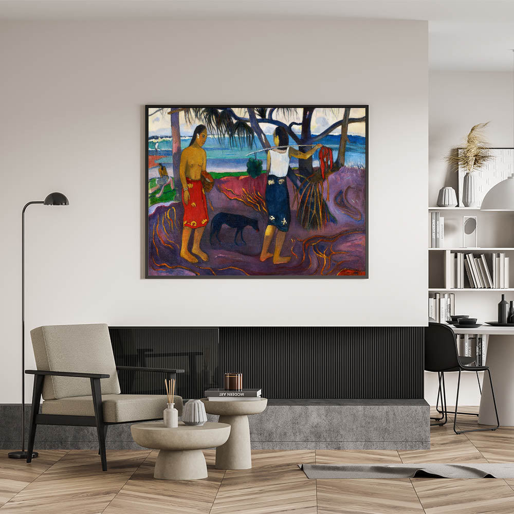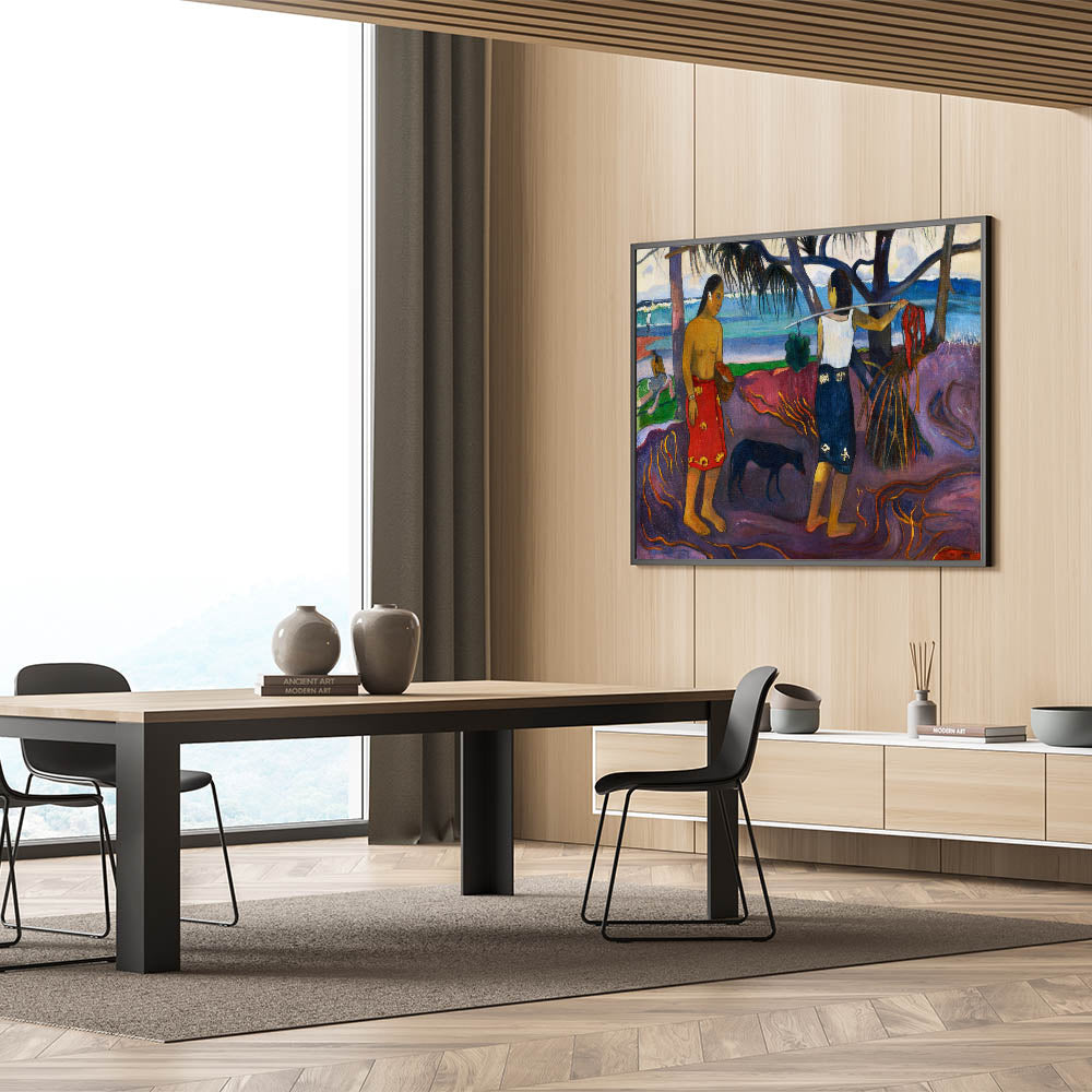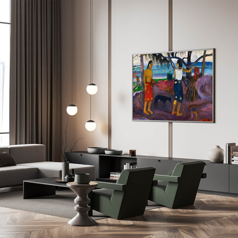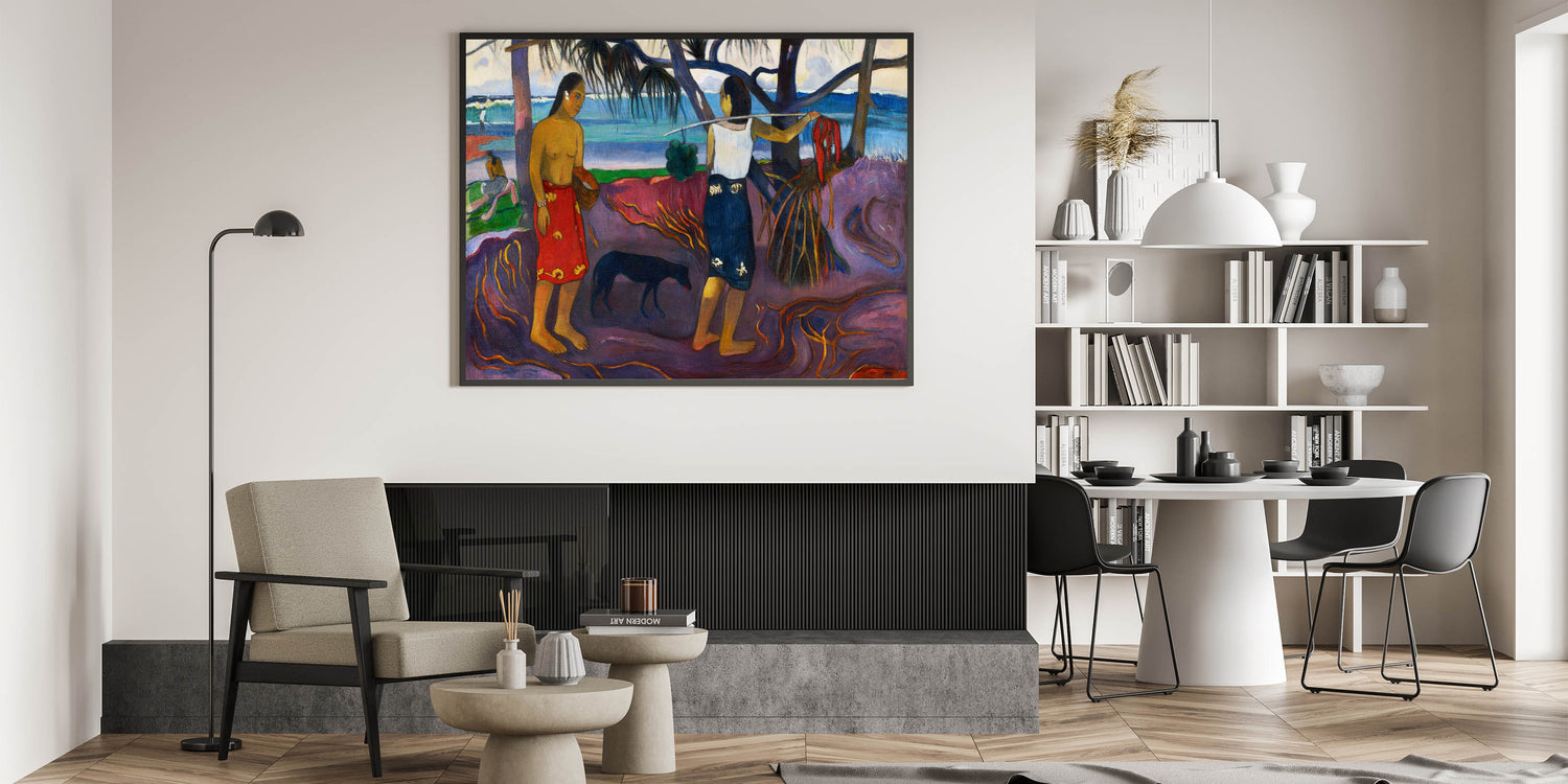 Experience the warmth and beauty of island life with this captivating piece of Modern Wall Art, inspired by Paul Gauguin's "I Raro Te Oviri" (Under the Pandanus). The rich hues of red, purple, and green create a lush, tropical atmosphere that adds a touch of exotic charm to any space. Perfect for those who appreciate unique modern art, this piece brings an element of cultural depth and natural beauty into contemporary decor.