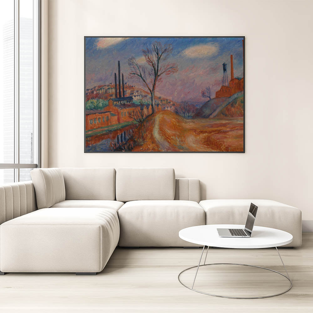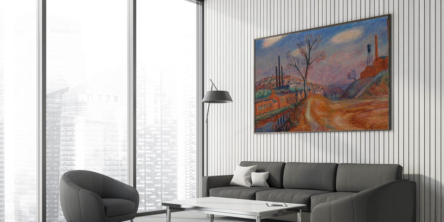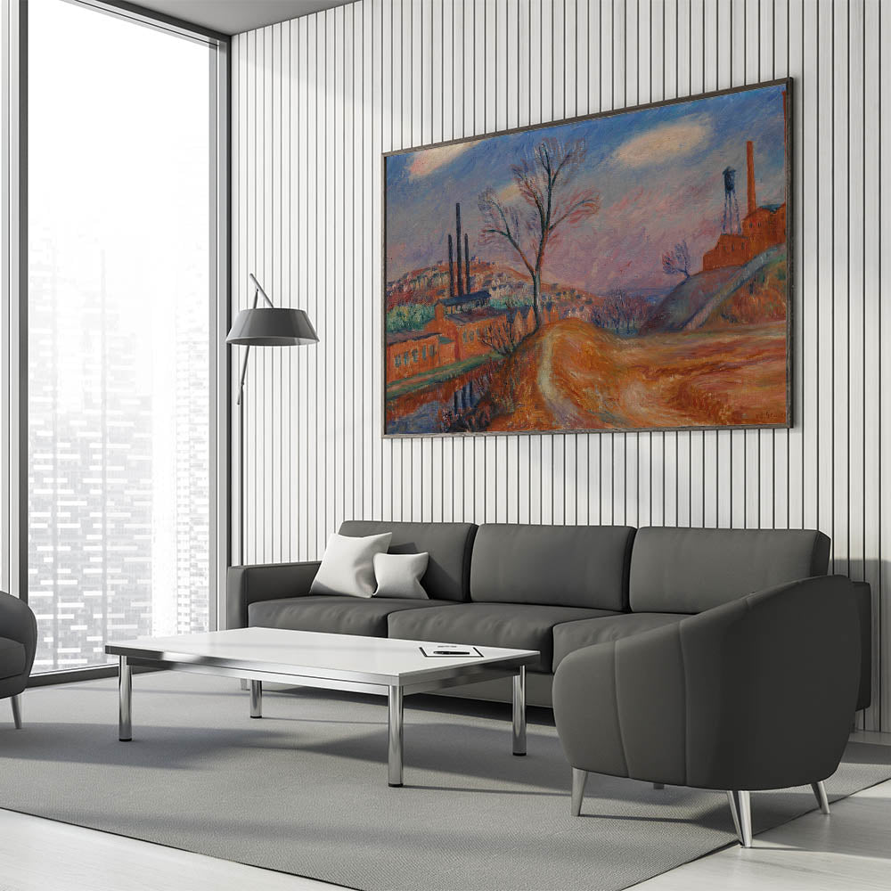 Enhance your space with this Modern Wall Art piece, capturing a unique industrial landscape scene that blends factories with a rural setting. The warm tones of orange, brown, and muted blues create a sense of depth and contrast, offering a nostalgic and contemplative view of industry and nature. This Contemporary Art piece is perfect for those who appreciate Stylish Wall Art with a touch of history and warmth.