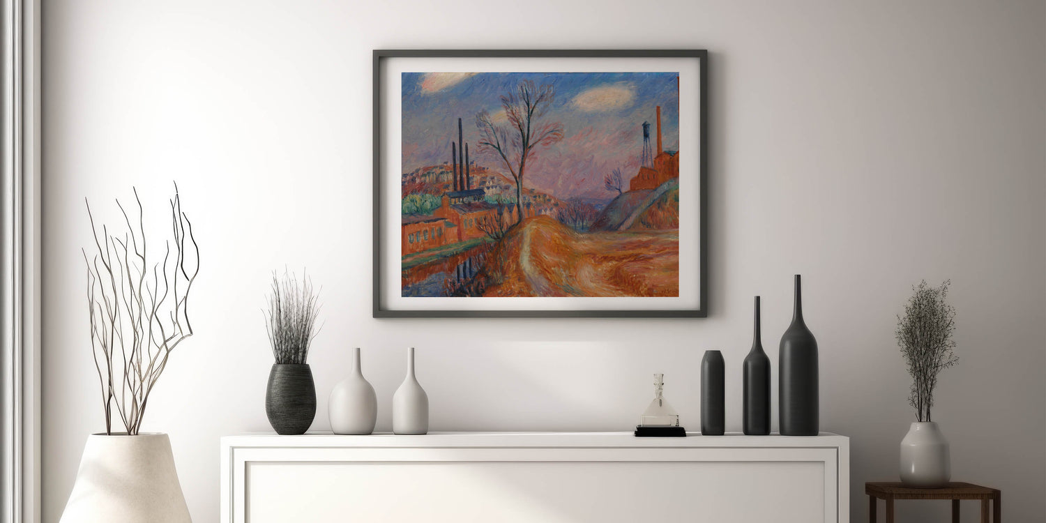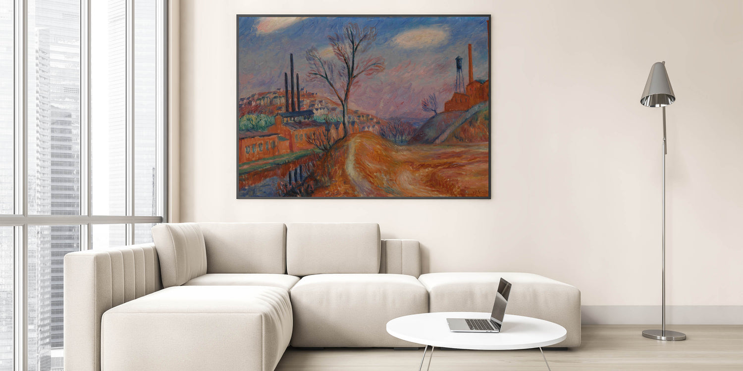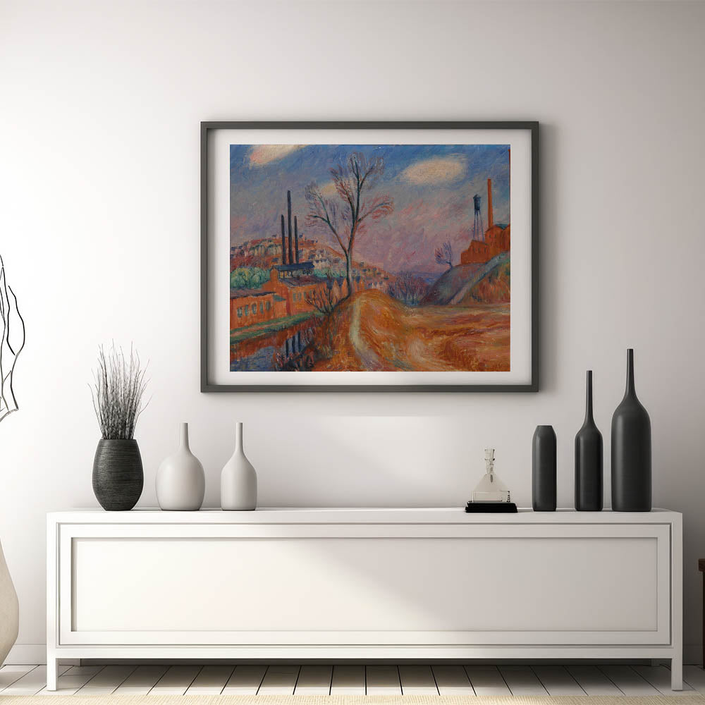 Enhance your space with this Modern Wall Art piece, capturing a unique industrial landscape scene that blends factories with a rural setting. The warm tones of orange, brown, and muted blues create a sense of depth and contrast, offering a nostalgic and contemplative view of industry and nature. This Contemporary Art piece is perfect for those who appreciate Stylish Wall Art with a touch of history and warmth.