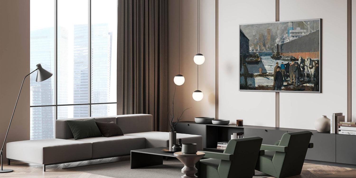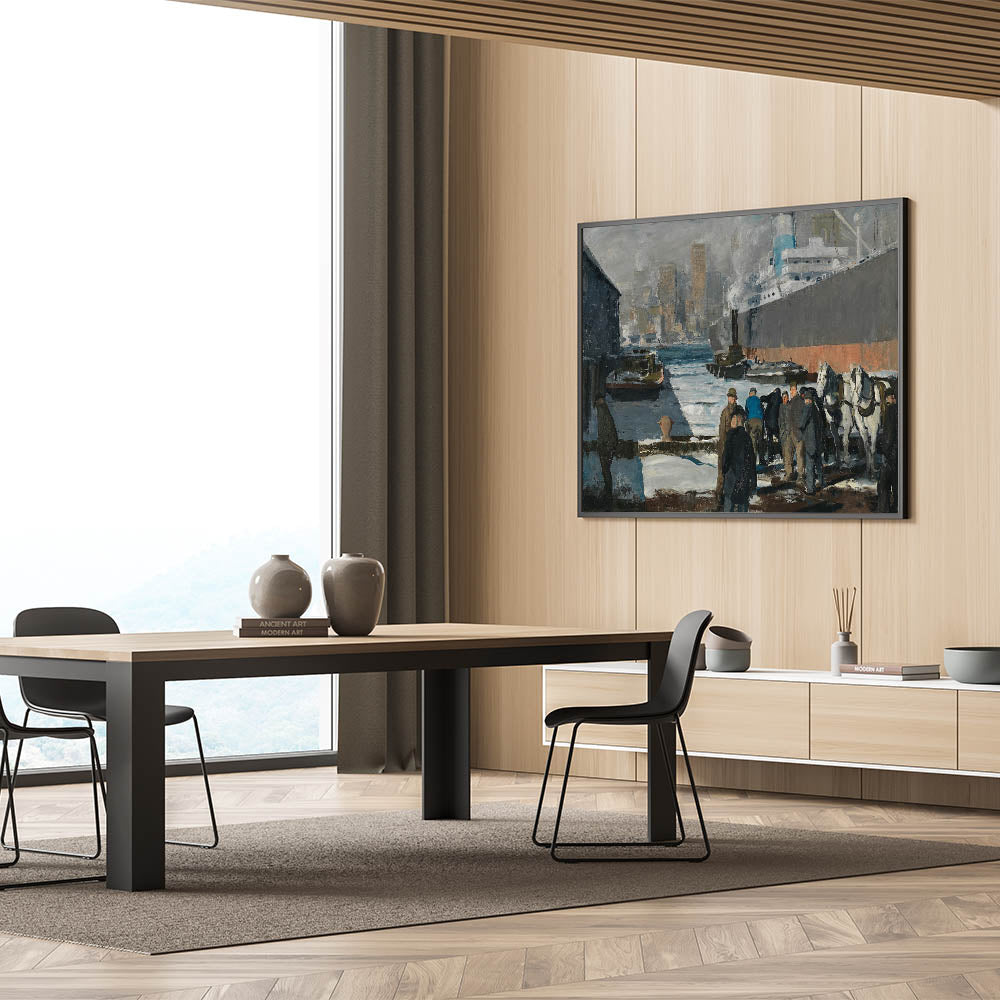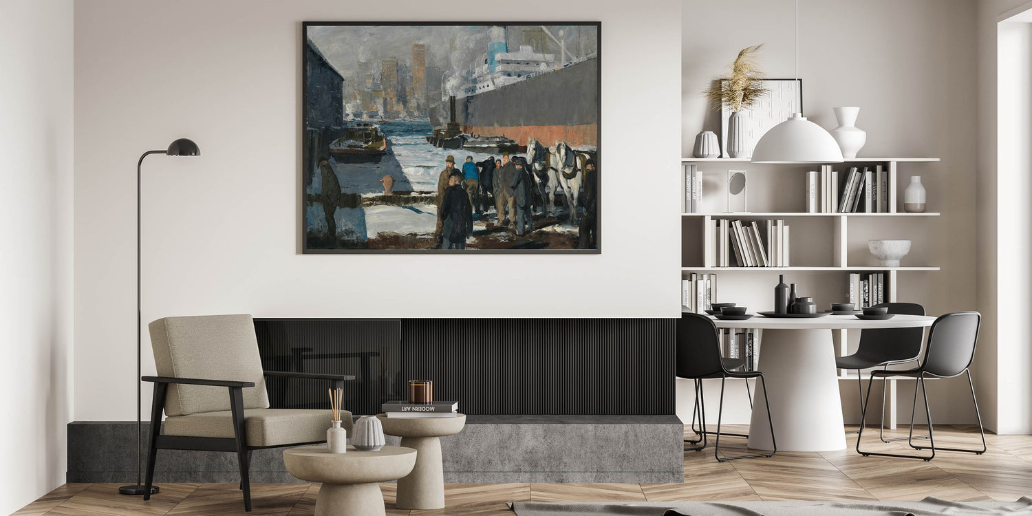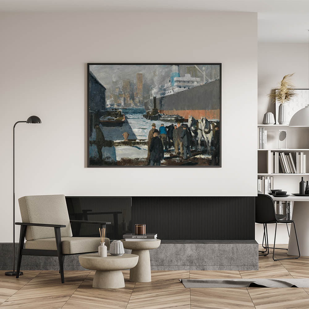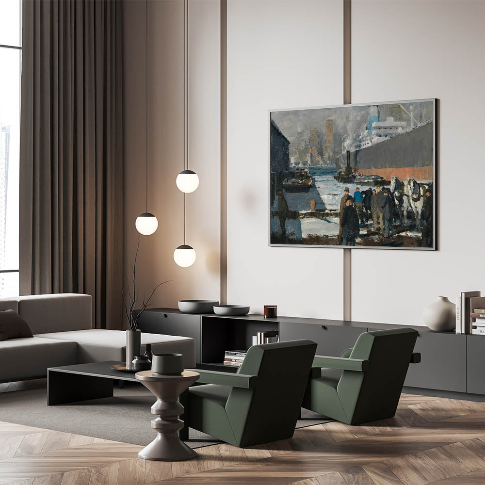Capture the raw beauty of urban industrial life with this striking modern wall art. Depicting a bustling dockyard in the heart of winter, the artwork features workers, horses, and ships set against the backdrop of a foggy, snow-covered cityscape. The muted tones and intricate details evoke a sense of resilience and energy, making this piece an ideal choice for contemporary art enthusiasts.