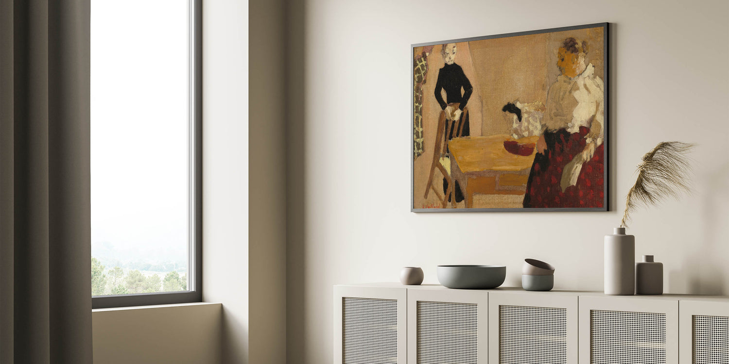 Bring a sense of warmth and intimacy to your space with this Modern Wall Art piece, "The Conversation" by Edouard Vuillard. This painting captures a quiet domestic moment, portraying two figures engaged in conversation in a softly lit interior. The earthy tones, muted palette, and subtle brushstrokes add a timeless elegance, perfect for Trendy Home Decor.