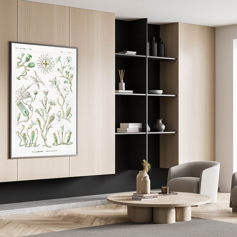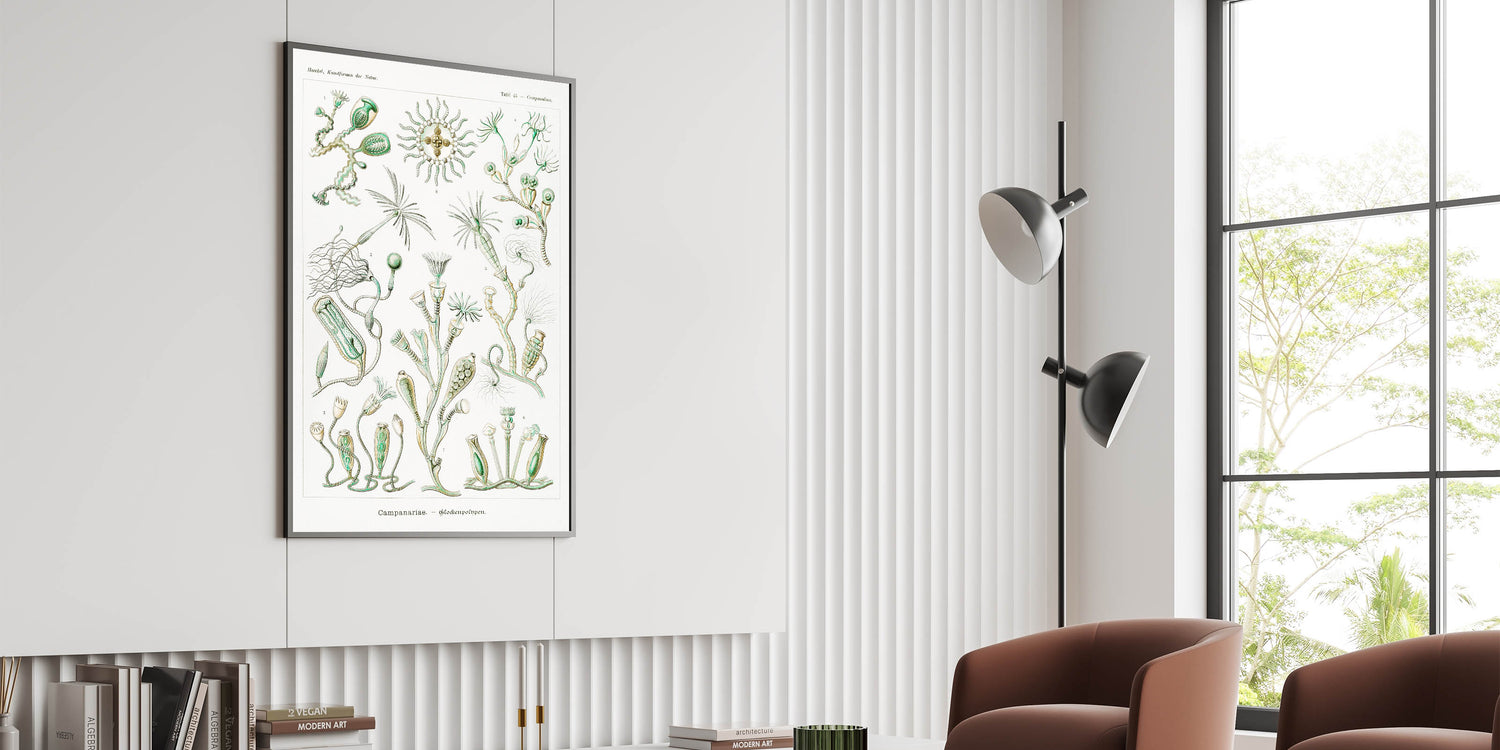 Enhance your decor with this stunning Modern Wall Art, featuring a detailed botanical illustration inspired by nature's intricate designs. This elegant piece captures the essence of Contemporary Art Pieces, with its refined depiction of Campanariae forms in soft greens and delicate linework. Perfect for Trendy Home Decor, it offers a sophisticated and calming aesthetic for any space.