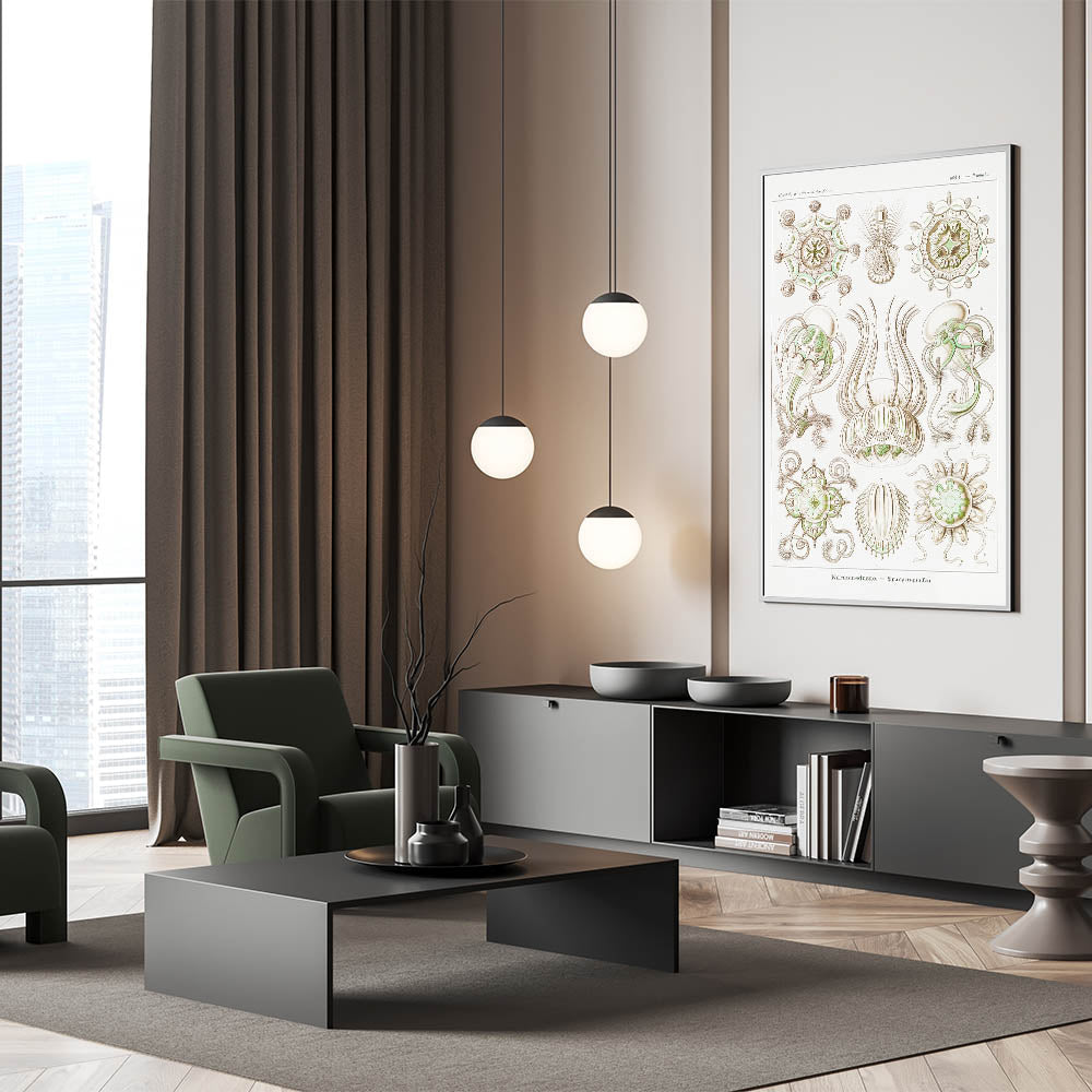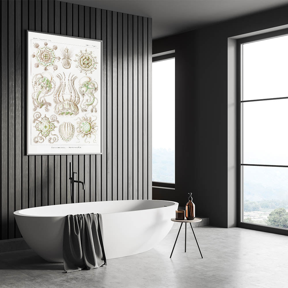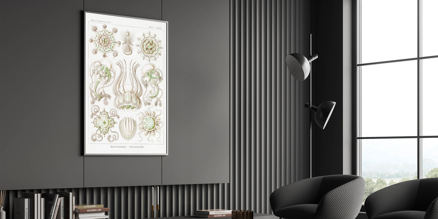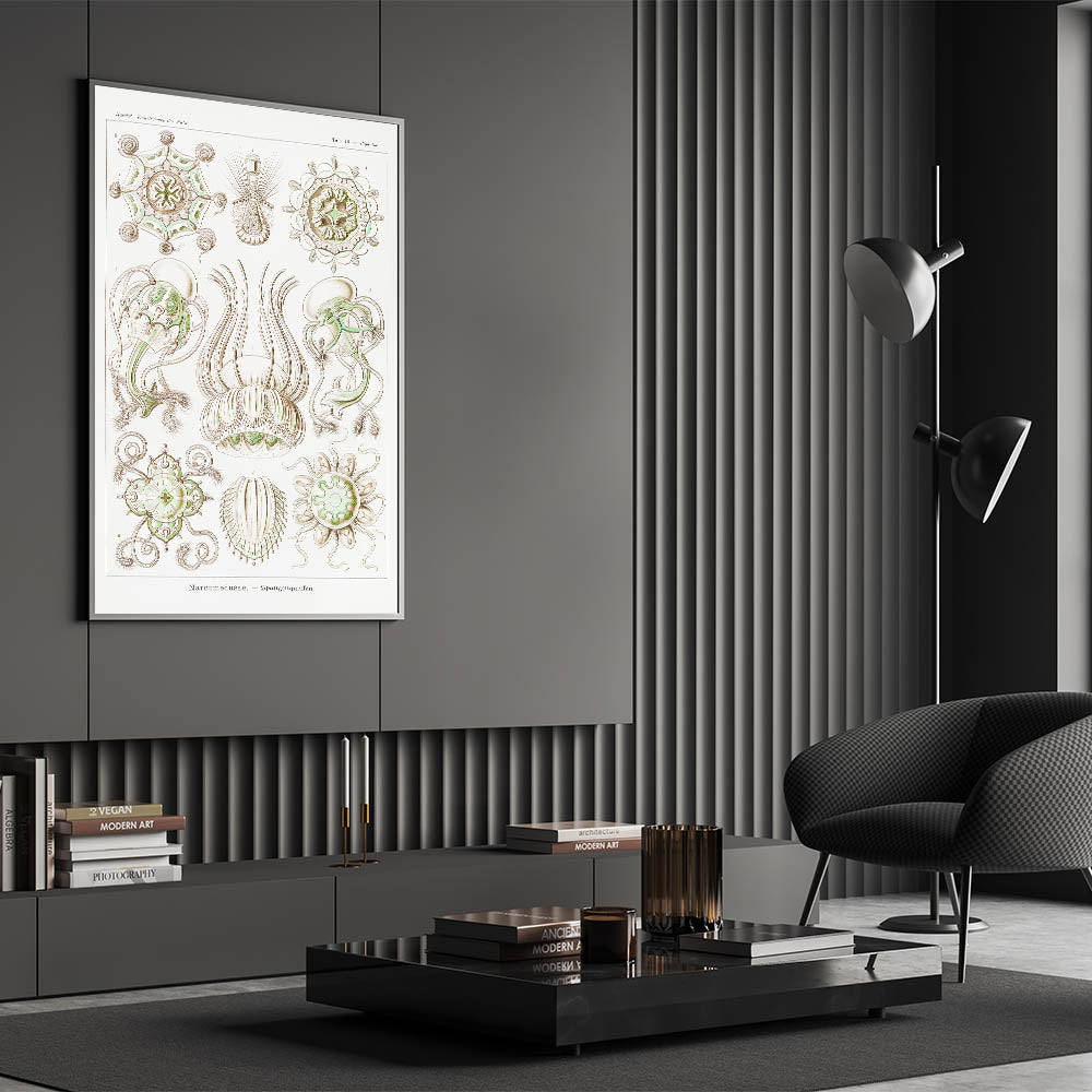 Dive into the wonders of marine biology with this Modern Wall Art, featuring a detailed scientific illustration of jellyfish from Ernst Haeckel's Kunstformen der Natur. Rendered in soft green and beige tones, this artwork combines the precision of natural science with the elegance of Contemporary Art. The intricate details and symmetrical forms make it an eye-catching piece for any interior.