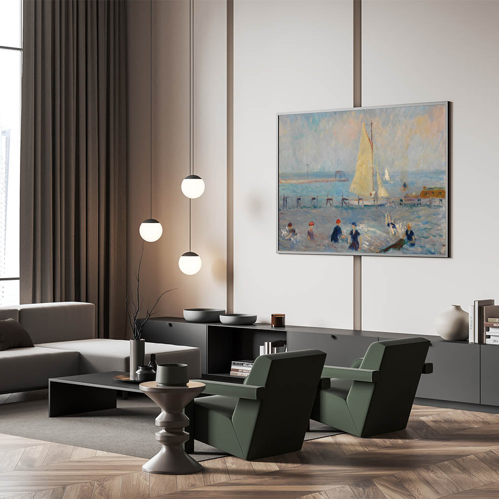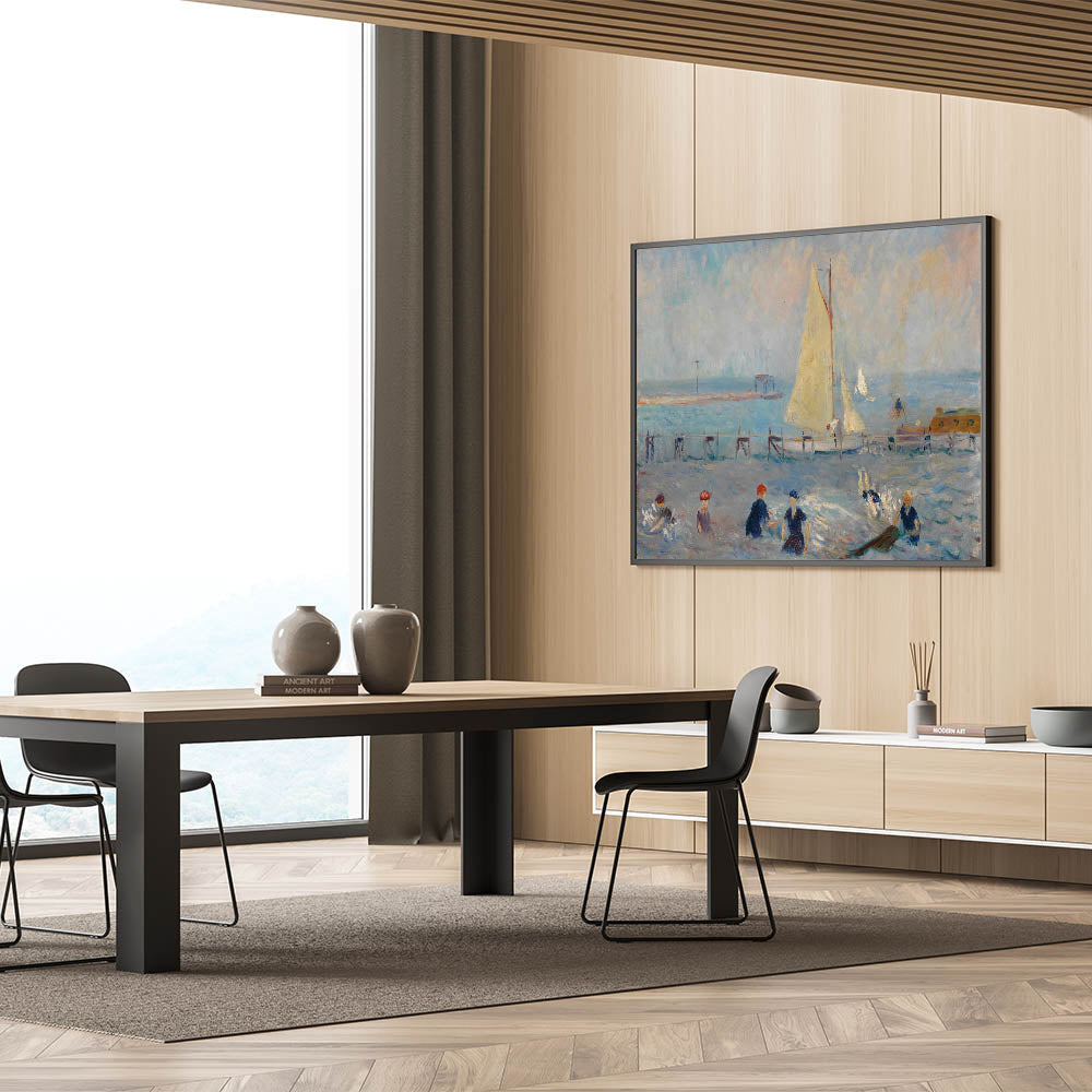 Bring a serene yet lively coastal atmosphere into your home with this Modern Wall Art piece, depicting a bustling beach scene with sailboats and bathers. The soft blues, gentle yellows, and pastel tones capture the essence of a peaceful day by the sea, making it an ideal choice for those looking to add Stylish Wall Art that evokes relaxation and joy.