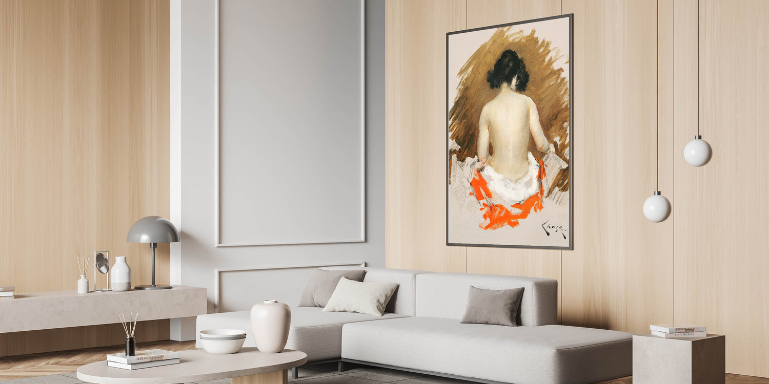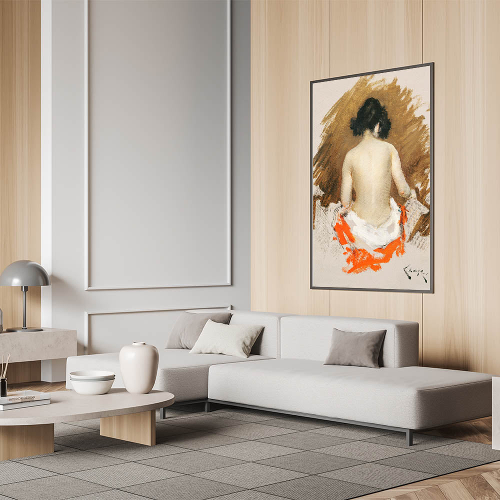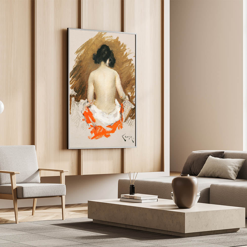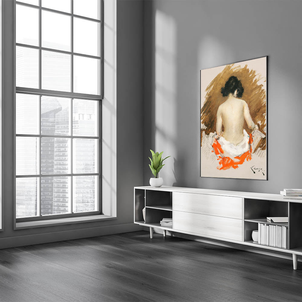 Add a touch of elegance and subtle sensuality to your decor with this Modern Wall Art piece, showcasing a delicate nude figure adorned with soft tones and a vibrant splash of orange. This Contemporary Art offers a refined blend of minimalism and warmth, making it an ideal choice for those seeking Stylish Wall Art with a sophisticated feel.
