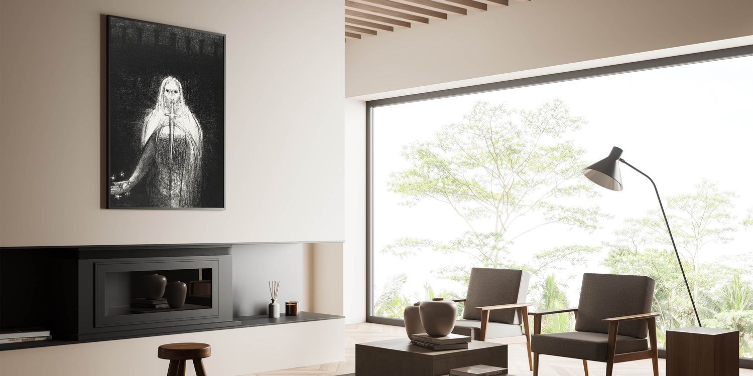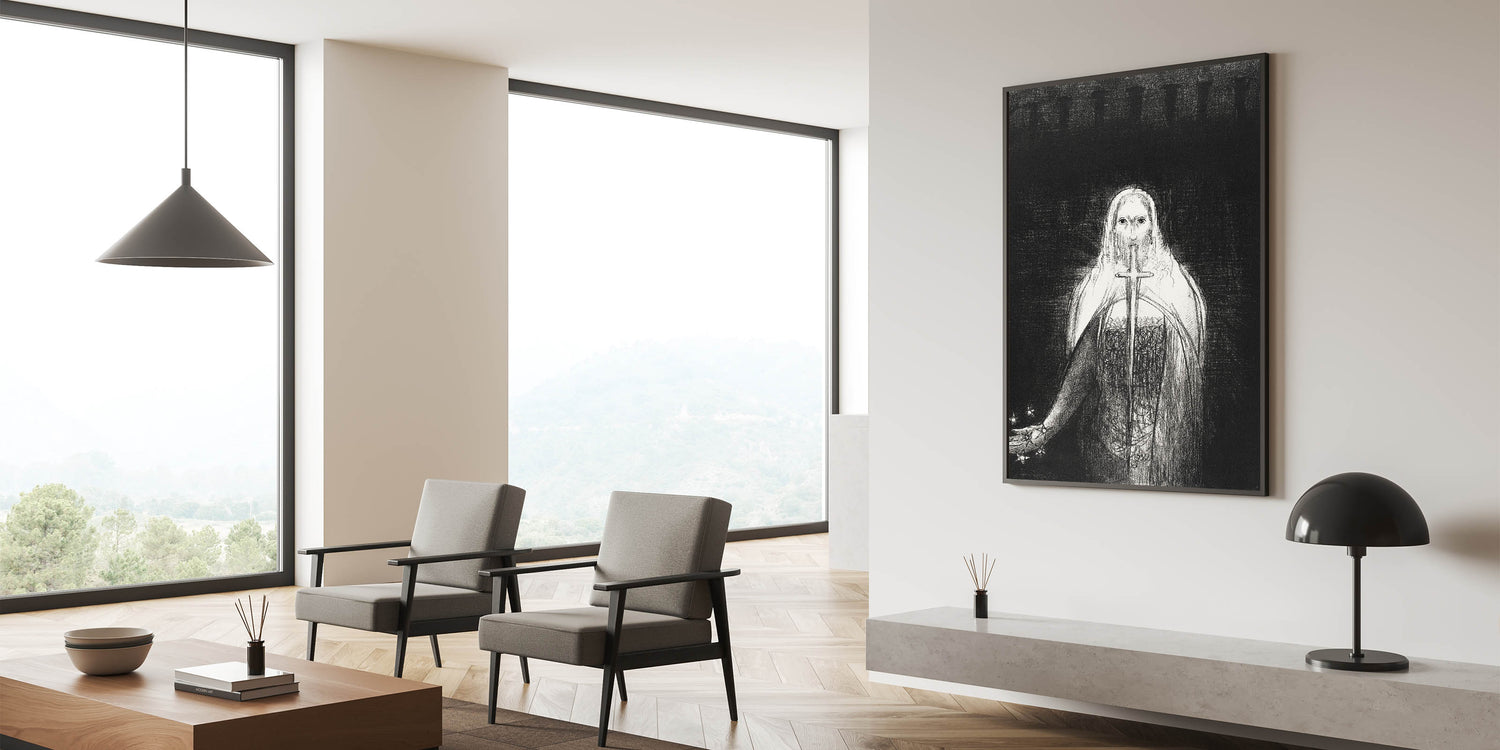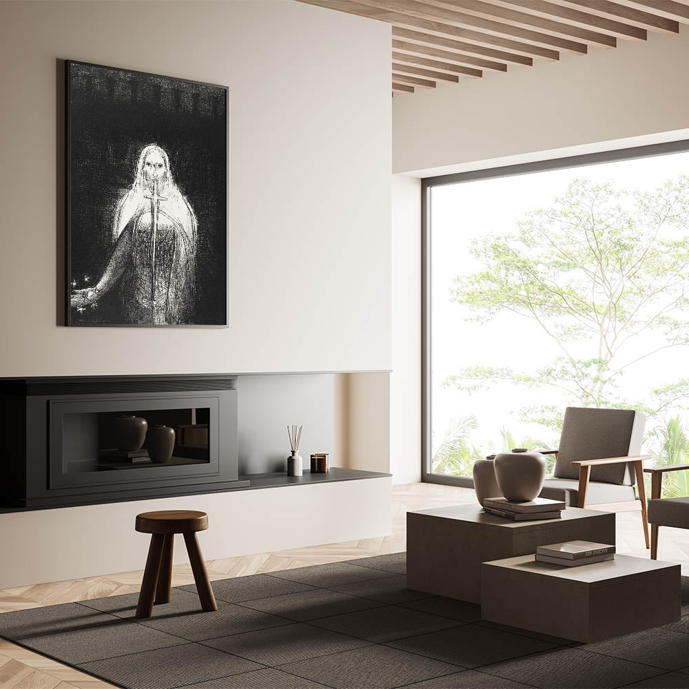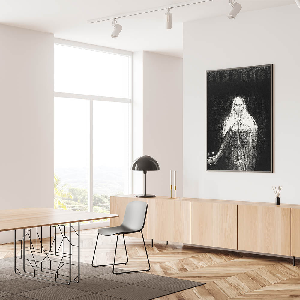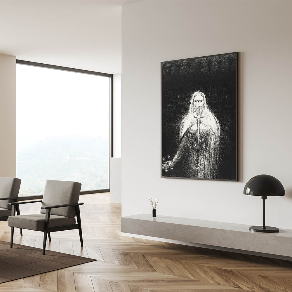 This evocative piece of modern wall art captures the mysterious and symbolic vision of Odilon Redon’s 1899 work, "And He Had in His Right Hand Seven Stars, and Out of His Mouth Went a Sharp Two-Edged Sword." With its haunting imagery and monochromatic tones, this artwork creates an intense, introspective atmosphere that adds depth and intrigue to any room. Ideal for lovers of dark, mystical art, this piece is perfect for adding a unique, contemplative touch to contemporary interiors.