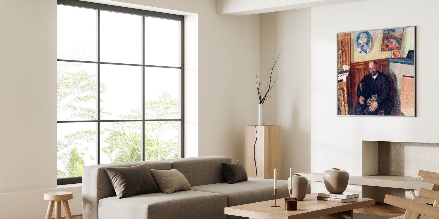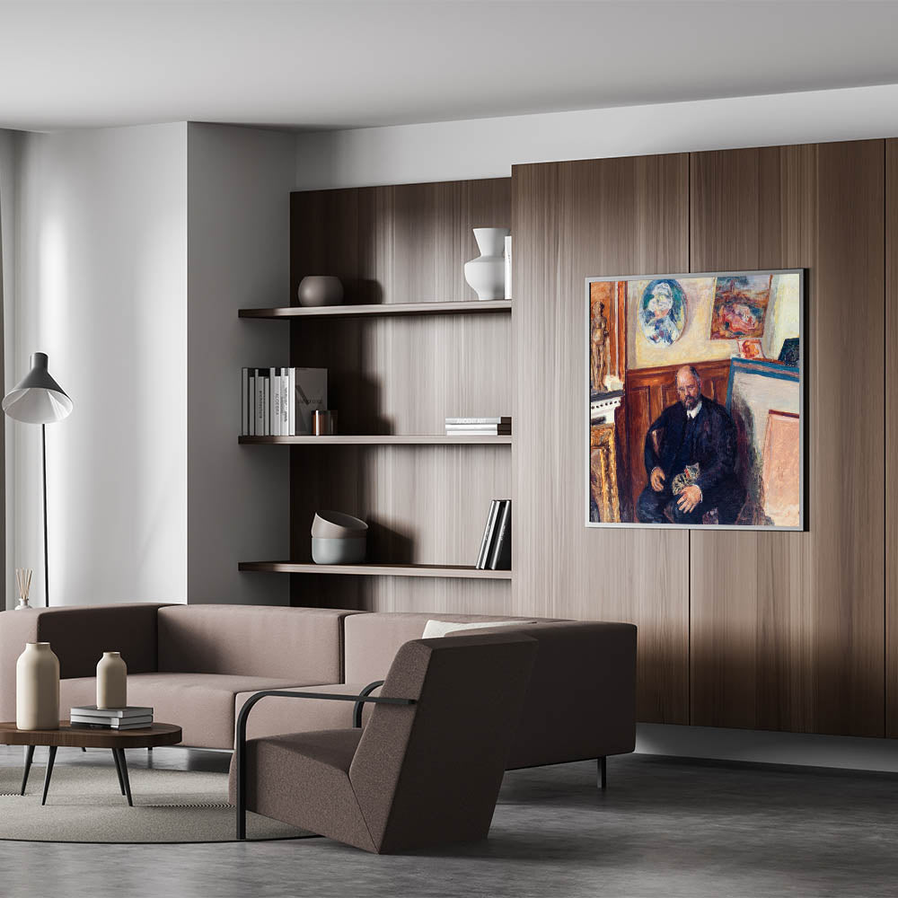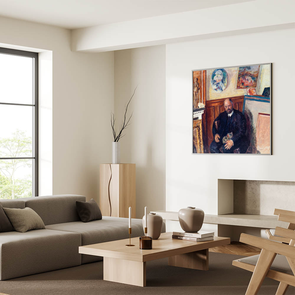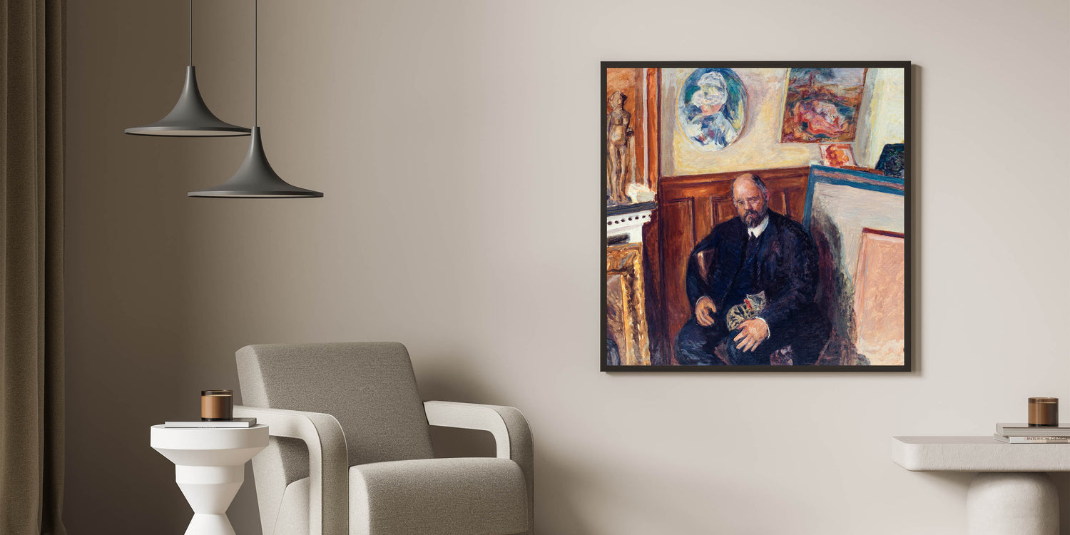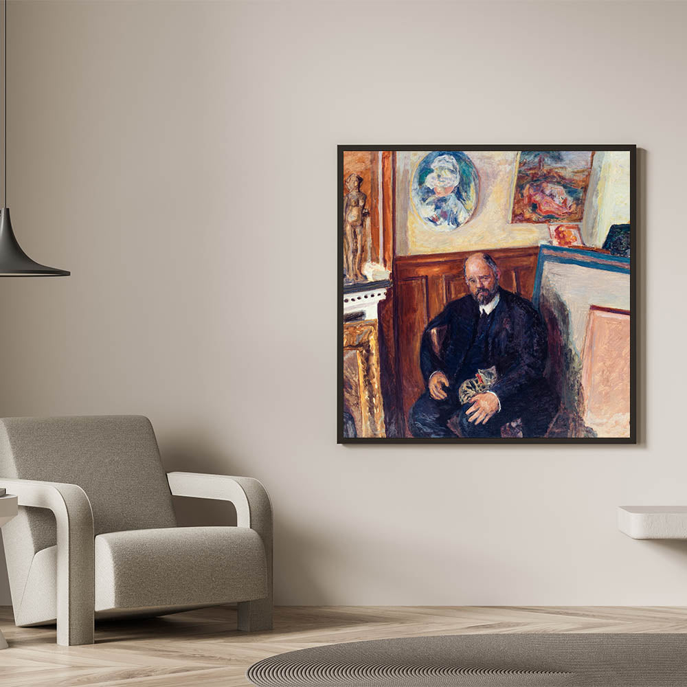 Introduce timeless sophistication to your interior with Modern Wall Art, showcasing Pierre Bonnard’s "Portrait of Ambroise Vollard with a Cat" (1924). This expressive piece portrays the iconic art dealer surrounded by vivid paintings and sculptures, with a charming touch provided by the cat on his lap. Bonnard’s masterful use of color and detail creates a vibrant yet intimate atmosphere, perfect for art lovers and collectors of unique modern art.